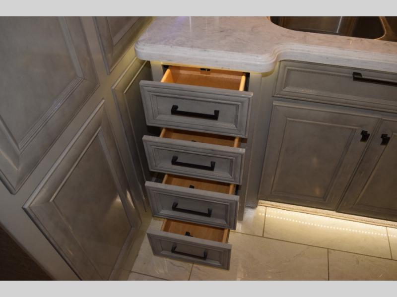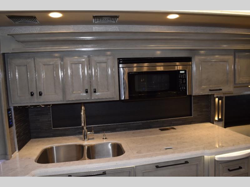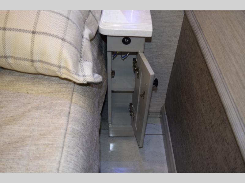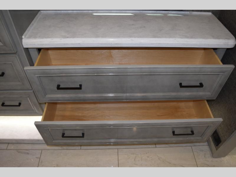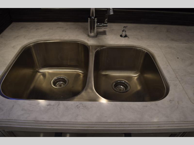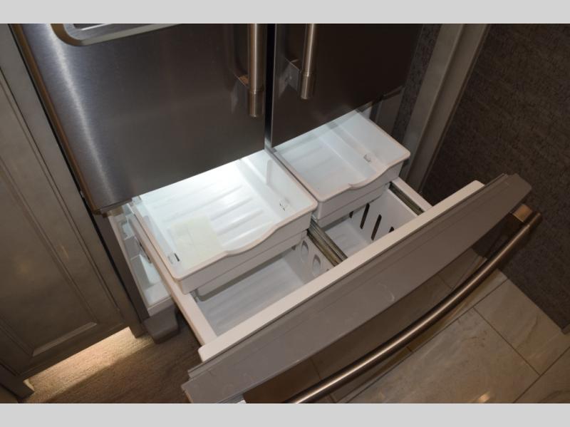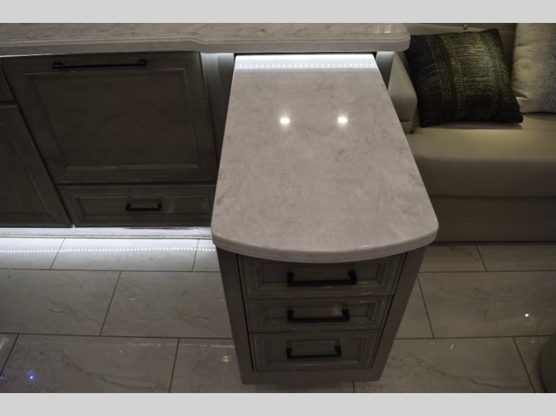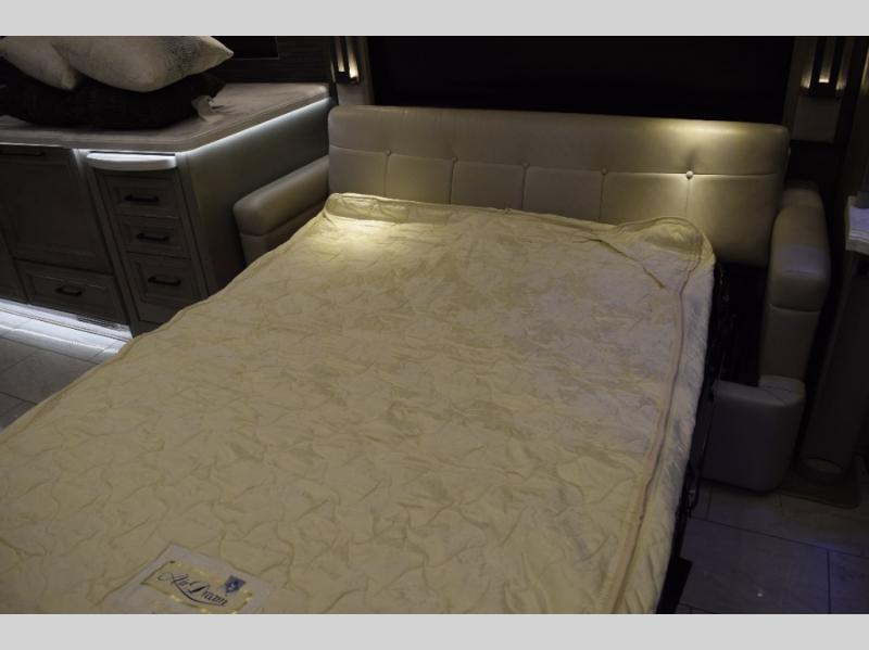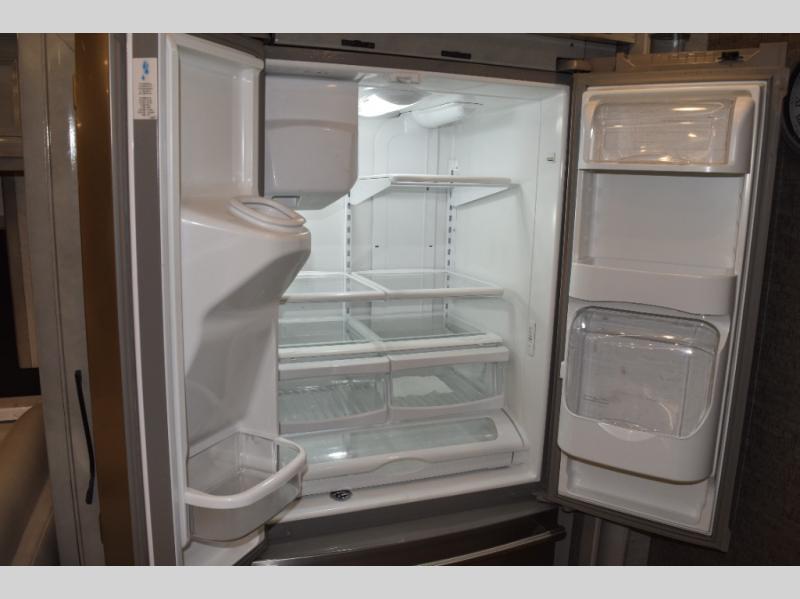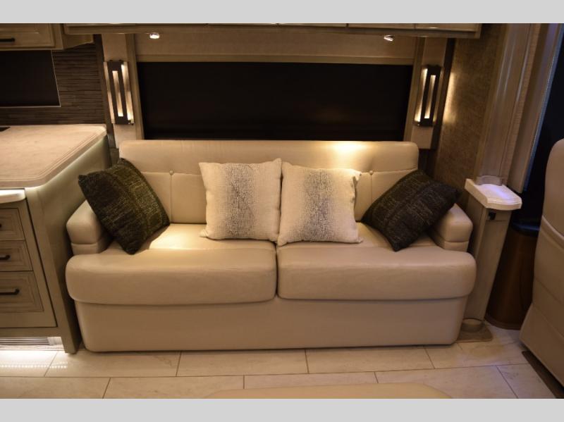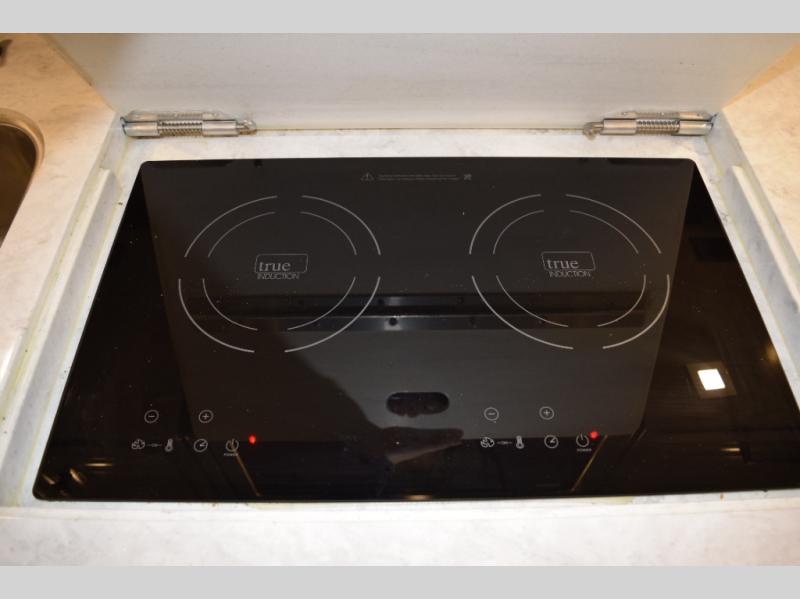 The residential refrigerator keeps all your favorite snacks fresh for your adventures, and the two-burner induction cooktop makes preparing meals a breeze. With the expand-an-island, you can easily prepare fresh fruits or snacks to fuel your day. Relaxing is made effortless with the Ultraleather sofa bed, complete with an ottoman and a lift TV for movie nights or catching the big game.