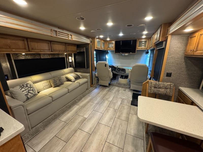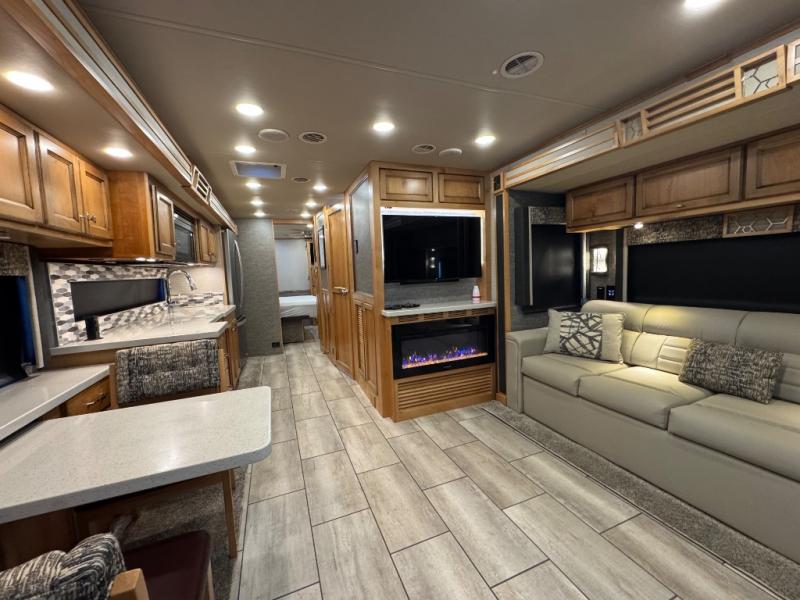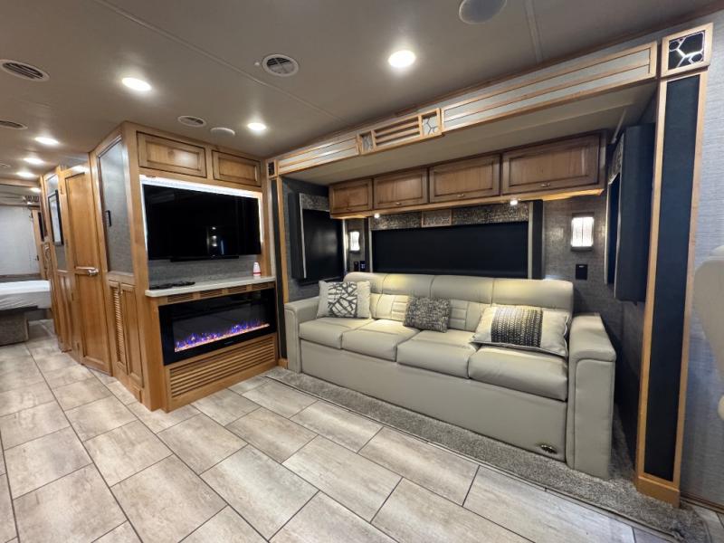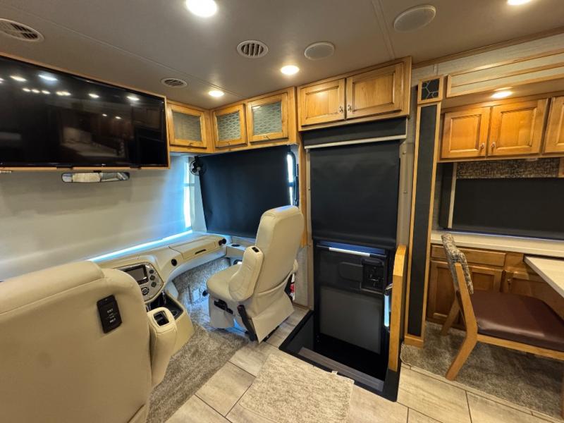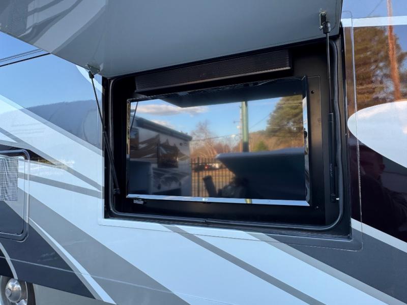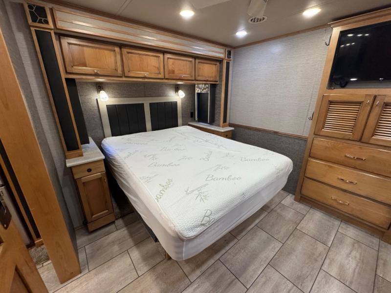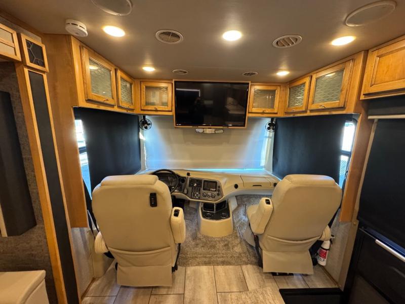 There are plenty of standard features and options to make this motorhome exactly what you want! From the optional drop down bunk over the front Ultraleather power driver and passenger seats and the optional dinette with a computer workstation that can be replaced for the booth dinette to the optional washer and dryer area inside the bathroom. You can even choose to add the optional fireplace below the flat panel TV for even more comfort as you relax on the sofa bed slide out. The rear private bedroom comes standard with a 60" x 80" queen-size memory foam mattress but if you want something bigger then you can switch it out for the optional king-size mattress instead. Yet you might decide the RV is perfect just as it comes!