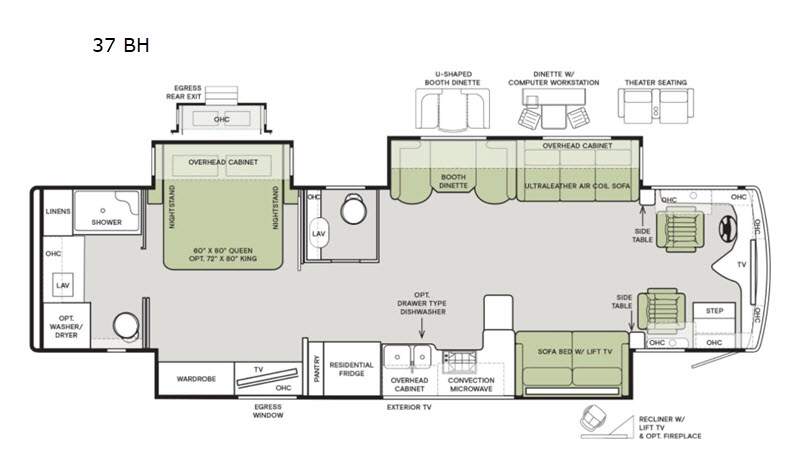 | TV Info | Front Overhead TV, LR TV, BR TV, Ext. TV |