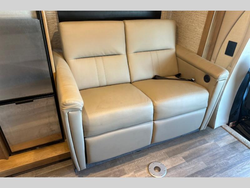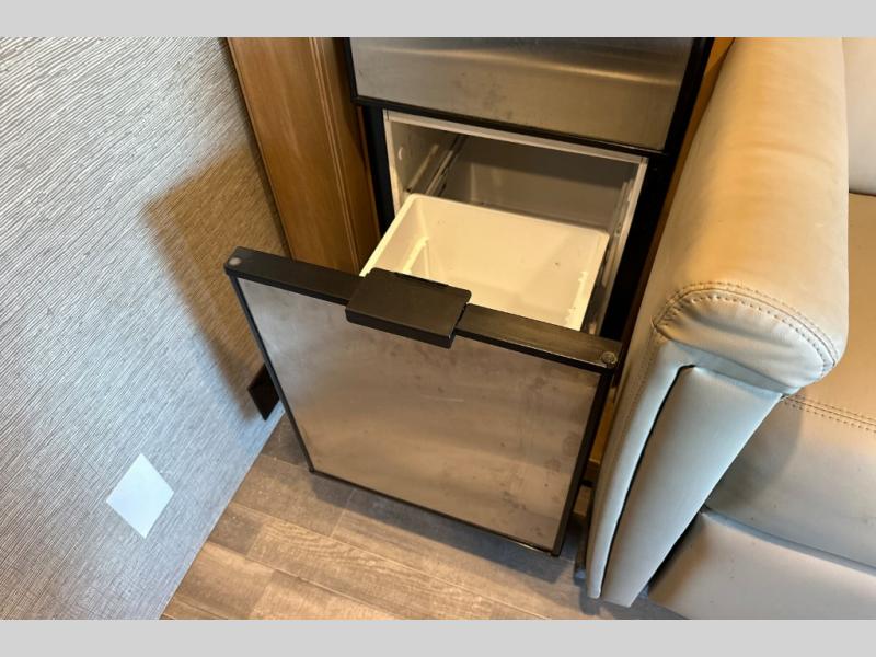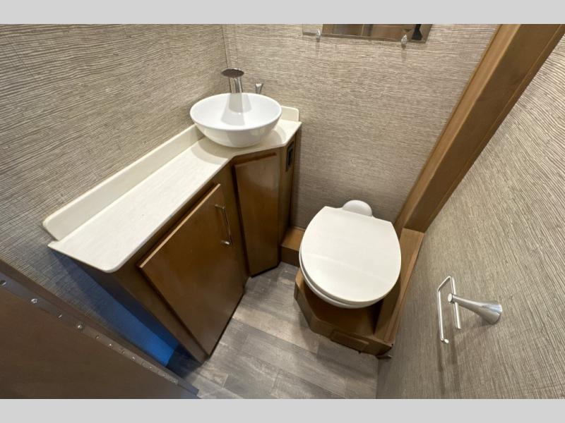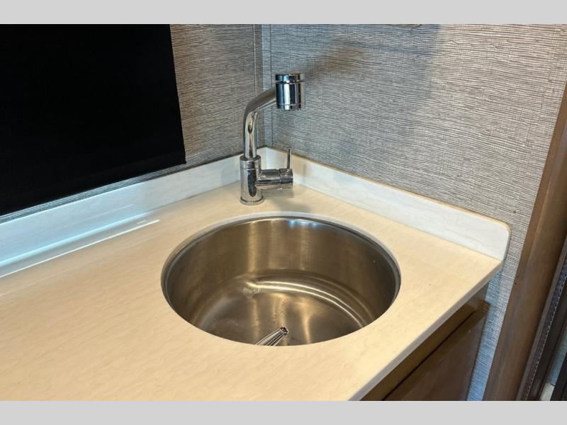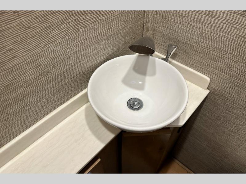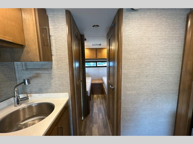 You will love the convenient accommodations found in this Wayfarer Class C diesel motorhome! The twin beds in the rear bedroom are super useful because they can be transformed into one large king-size bed, depending on your needs and preferences, and the bunk above the cab also provides a functional and space-saving sleeping space for the kids. The chef of the family can prepare meals on the LP cooktop, plus there is a convection microwave under the cooktop for convenience. This model also features a private toilet and sink room, and a private shower right across the hall so two people can get ready for bed at once!