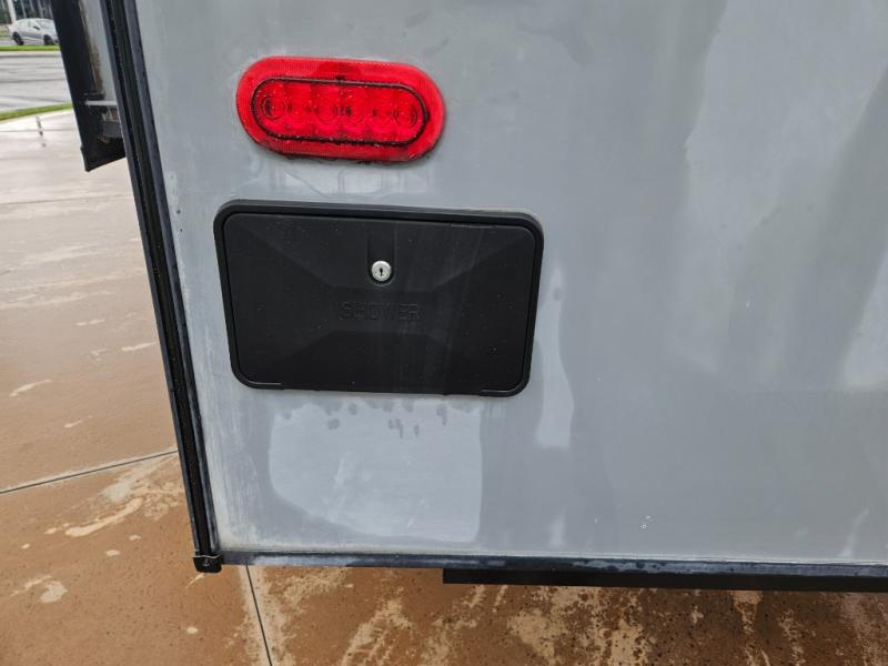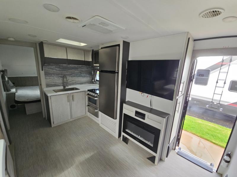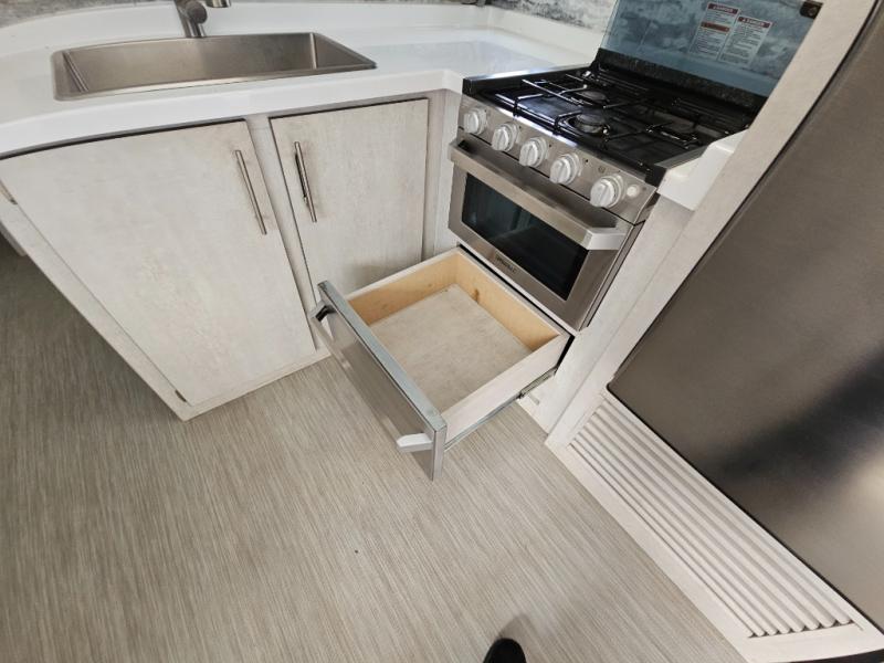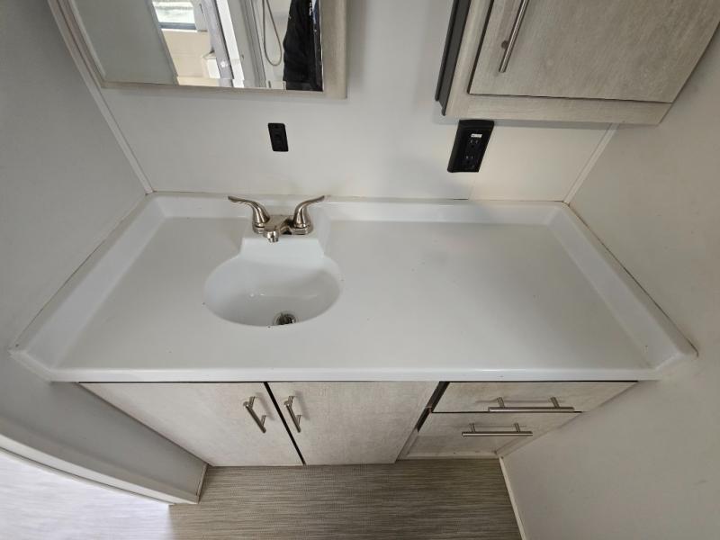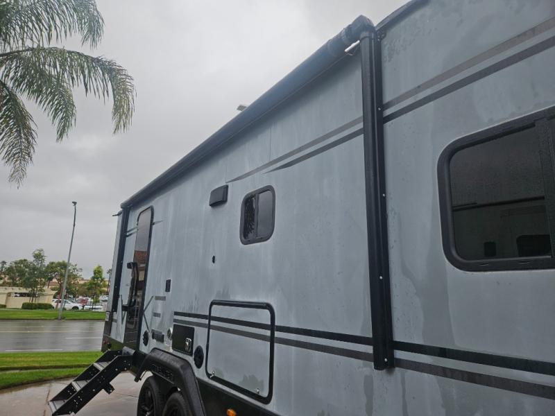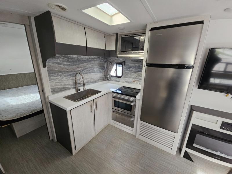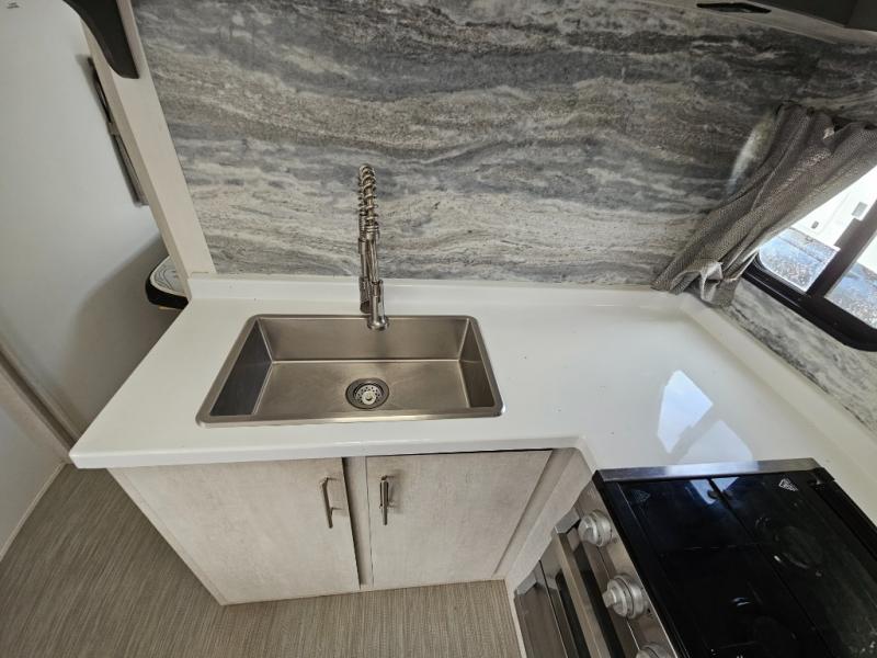 With any Evoke travel trailer by Travel Lite you will be pleasantly surprised by the modern look and luxury of these units. Each model includes LED lighting throughout, including an LED accented mirror medicine cabinet in the bathroom, plus Infinity Woven vinyl flooring, which is scratch and water resistant. You'll find Granicote countertops and tables, slow-close cabinet technology, stainless steel Furrion appliances, plus a 10 cu. ft. double door refrigerator for all you perishables. Outside the Smart Awning features LED lighting and wind sensors, which recognizes when its too windy and automatically retracts, preventing any damage to your unit, and the electric tongue jack allows you to set up camp quickly and start relaxing sooner!