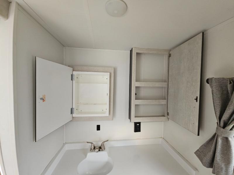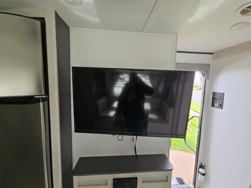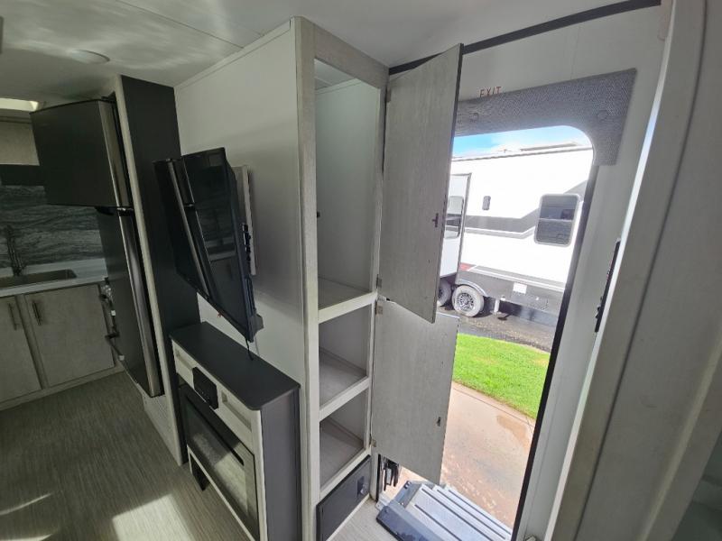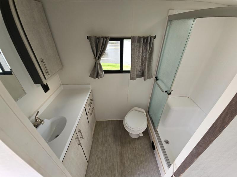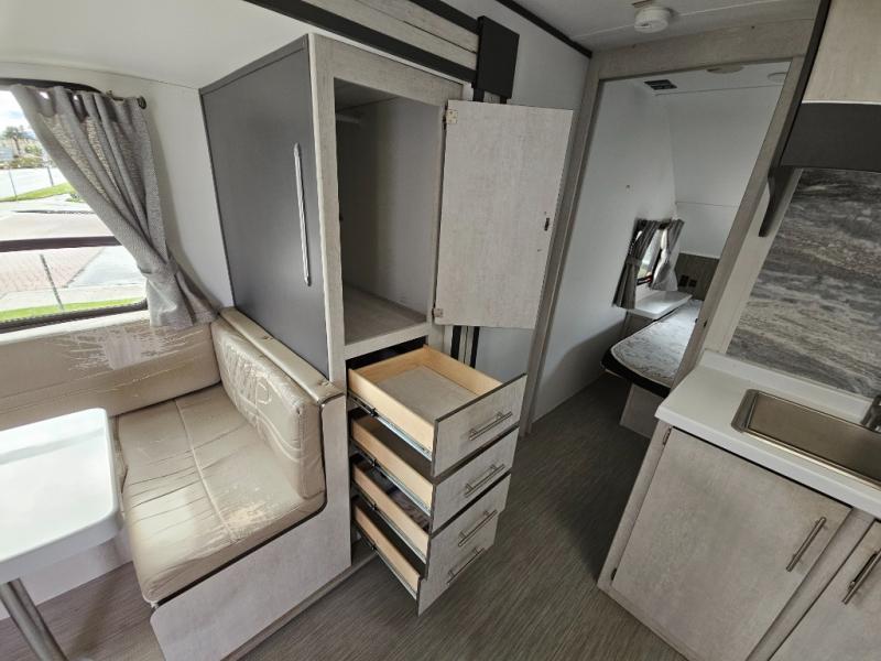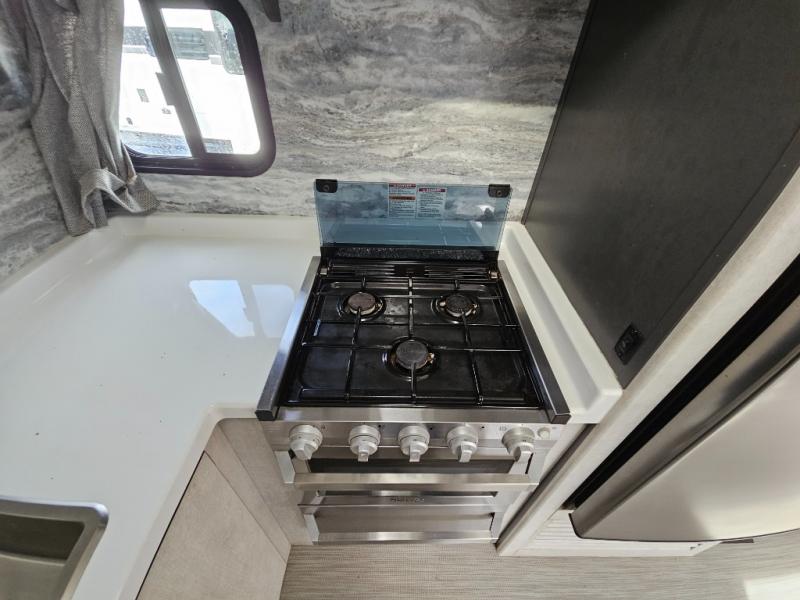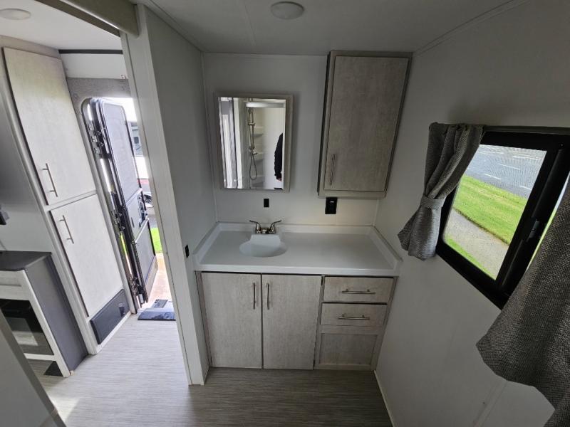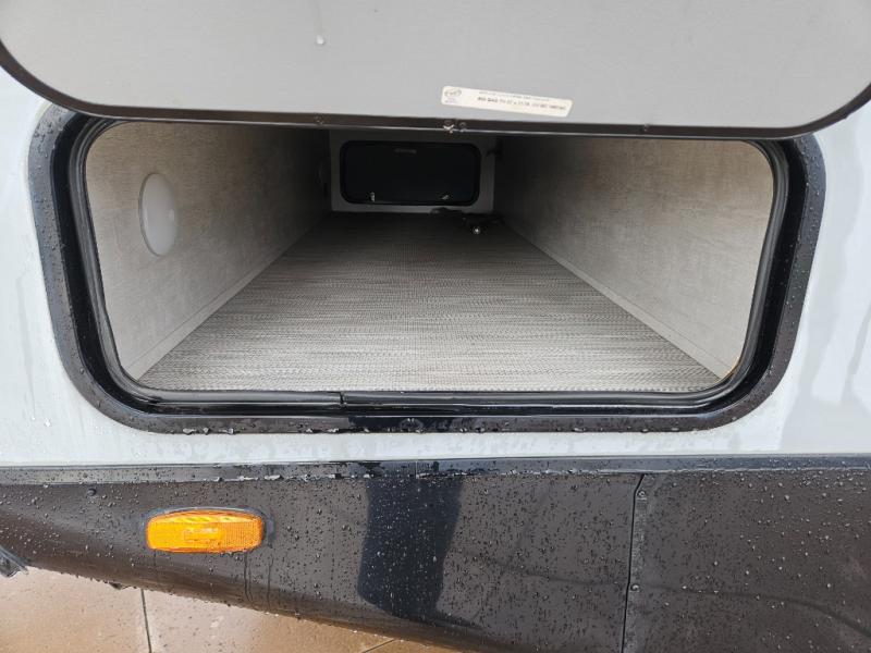 With any Evoke travel trailer by Travel Lite you will be pleasantly surprised by the modern look and luxury of these units. Each model includes LED lighting throughout, including an LED accented mirror medicine cabinet in the bathroom, plus Infinity Woven vinyl flooring, which is scratch and water resistant. You'll find Granicote countertops and tables, slow-close cabinet technology, stainless steel Furrion appliances, plus a 10 cu. ft. double door refrigerator for all you perishables. Outside the Smart Awning features LED lighting and wind sensors, which recognizes when its too windy and automatically retracts, preventing any damage to your unit, and the electric tongue jack allows you to set up camp quickly and start relaxing sooner!