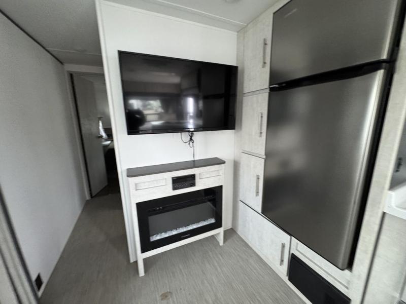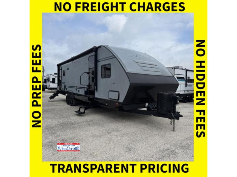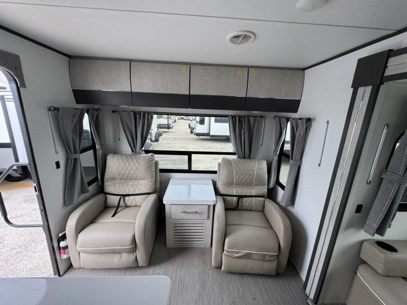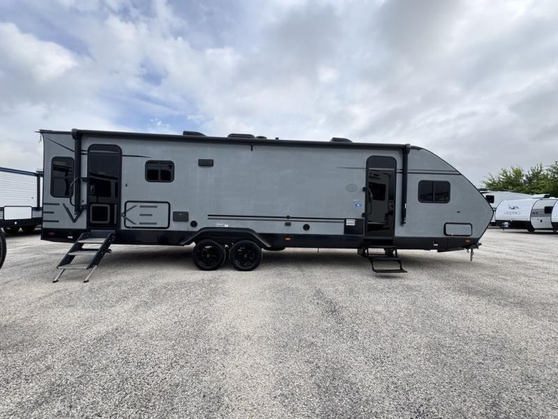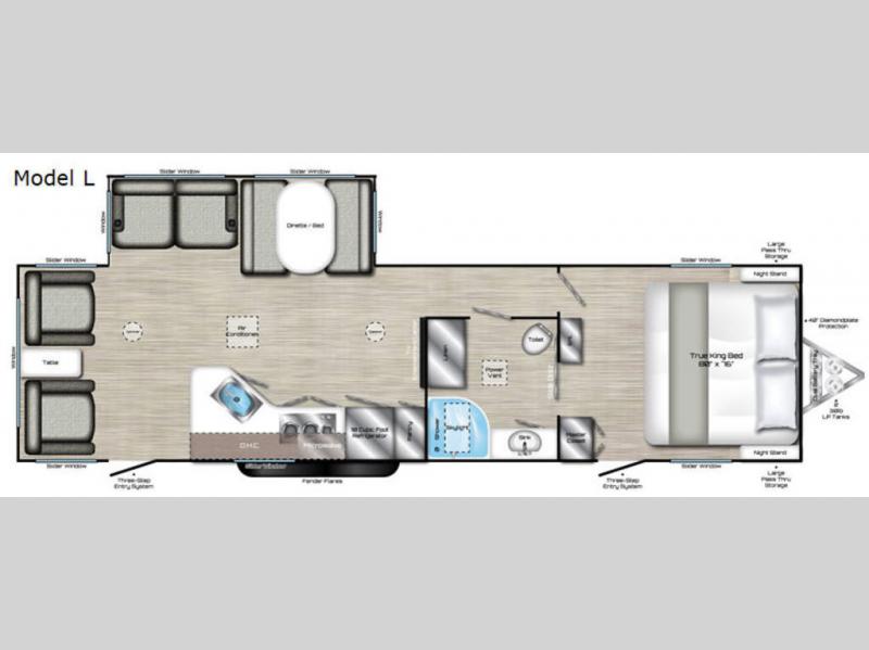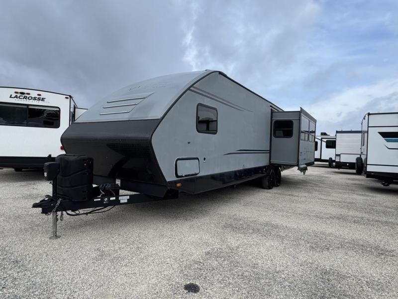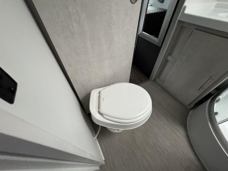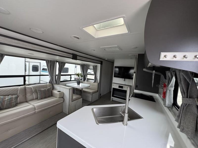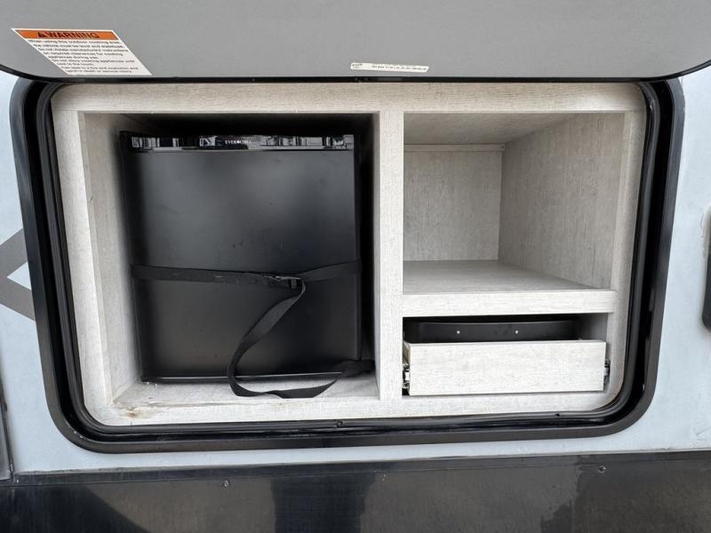 With any Evoke travel trailer by Travel Lite you will be pleasantly surprised by the modern look and luxury of these units. Each model includes LED lighting throughout, including an LED accented mirror medicine cabinet in the bathroom, plus Infinity Woven vinyl flooring, which is scratch and water resistant. You'll find Granicote countertops and tables, slow-close cabinet technology, stainless steel Furrion appliances, plus a 10 cu. ft. double door refrigerator for all you perishables. Outside the Smart Awning features LED lighting and wind sensors, which recognizes when its too windy and automatically retracts, preventing any damage to your unit, and the electric tongue jack allows you to set up camp quickly and start relaxing sooner!