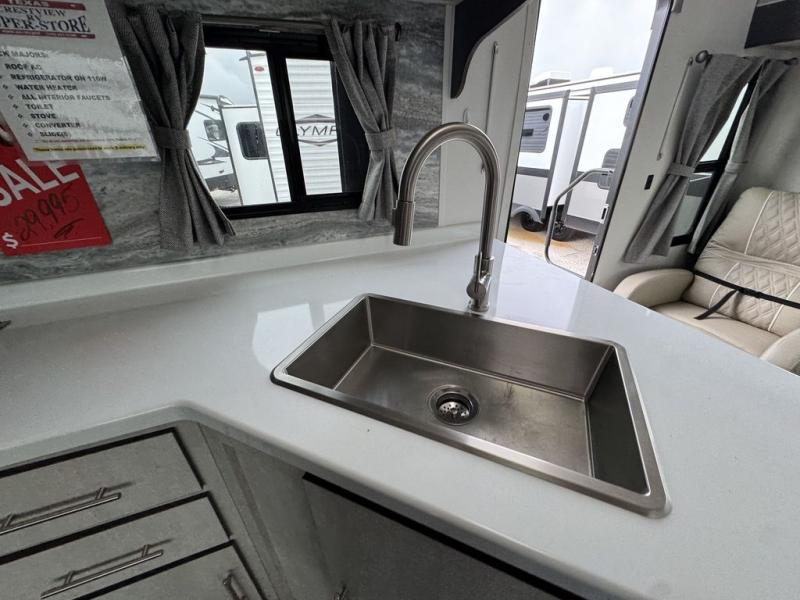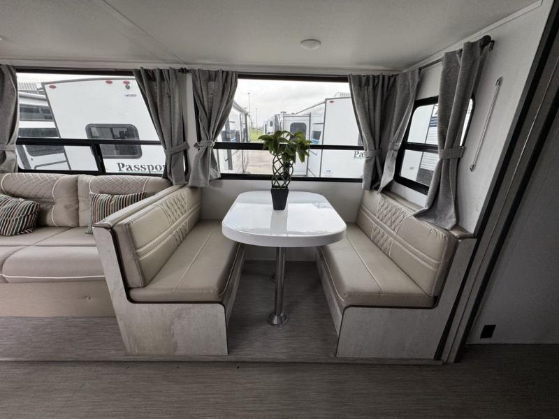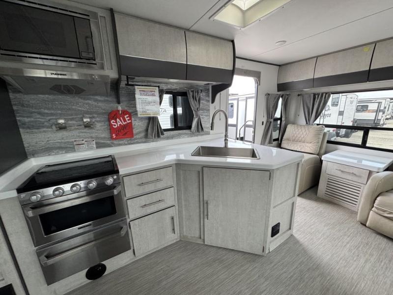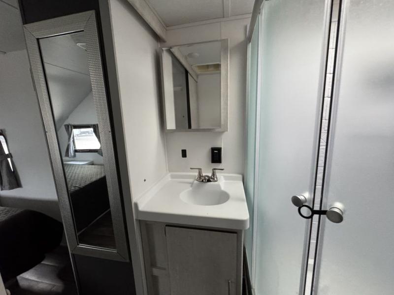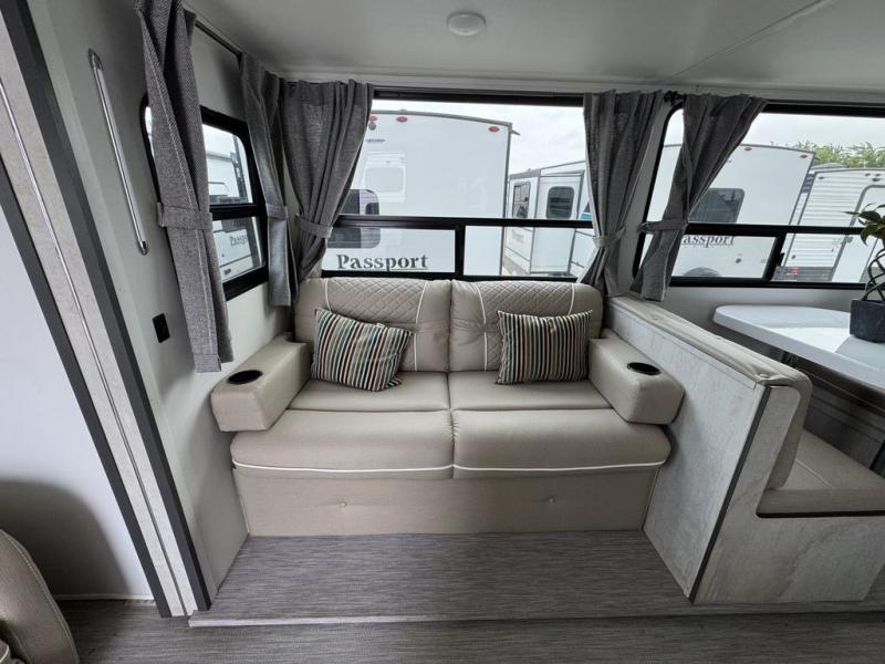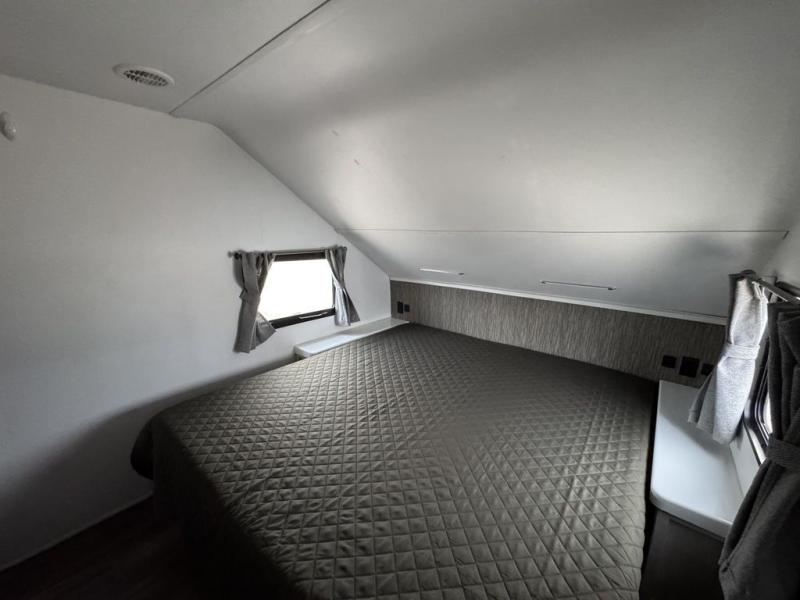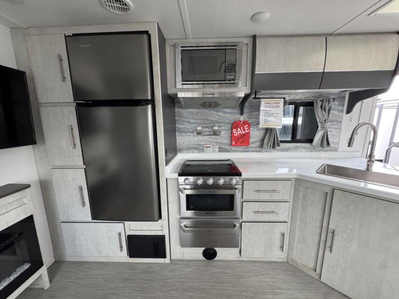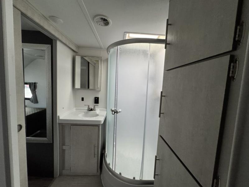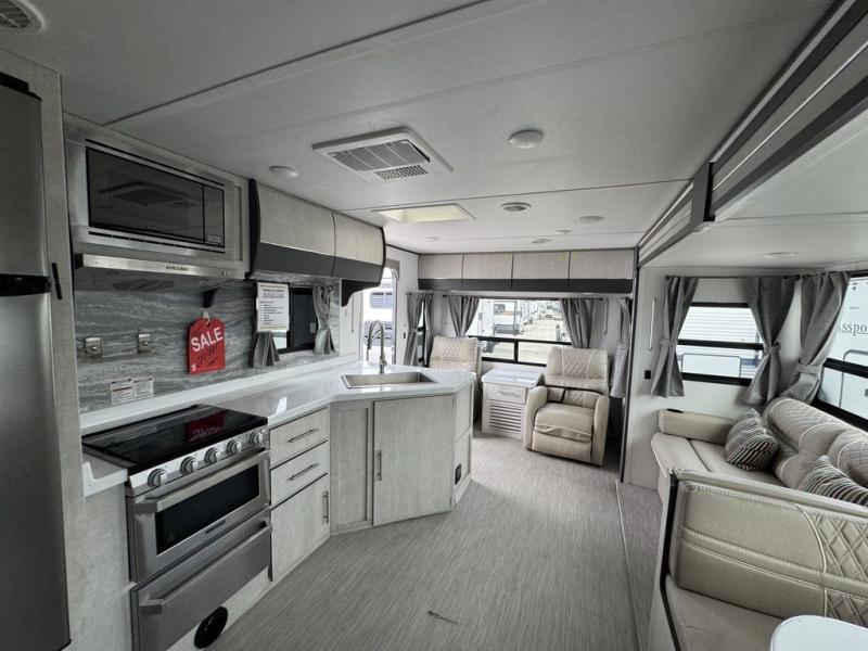 With any Evoke travel trailer by Travel Lite you will be pleasantly surprised by the modern look and luxury of these units. Each model includes LED lighting throughout, including an LED accented mirror medicine cabinet in the bathroom, plus Infinity Woven vinyl flooring, which is scratch and water resistant. You'll find Granicote countertops and tables, slow-close cabinet technology, stainless steel Furrion appliances, plus a 10 cu. ft. double door refrigerator for all you perishables. Outside the Smart Awning features LED lighting and wind sensors, which recognizes when its too windy and automatically retracts, preventing any damage to your unit, and the electric tongue jack allows you to set up camp quickly and start relaxing sooner!