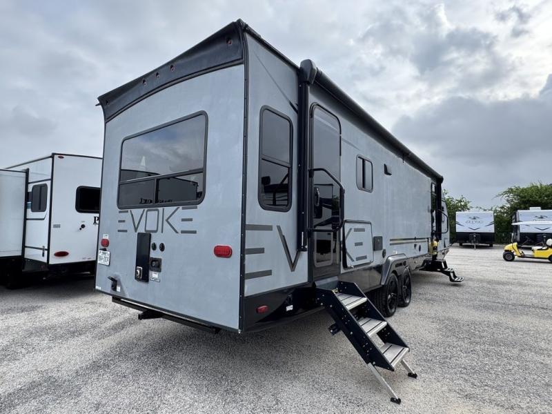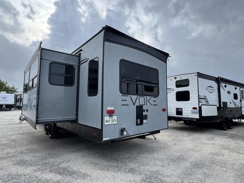 When you're ready for your summer vacation, choose this Evoke travel trailer that features a rear living area, dual entry doors, plus a large slide out! After a day in the sun, everyone can come back to the trailer and relax on the lounge chairs at the rear of the unit or kick back on the sofa within the slide out. The dinette is perfect for a meal together and it can be converted to a bed for more sleeping space. The chef of the family will love this kitchen that includes a three burner range, plenty of counter space, and a large pantry for dry goods. You can easily clean up in the double entry bath and with a shower skylight, you'll have more natural light and extra standing room! After you've explored all day, you will love to stretch out on the True king bed in the front private bedroom, plus there is a master closet for all your things, and your own exterior entry door for convenience.