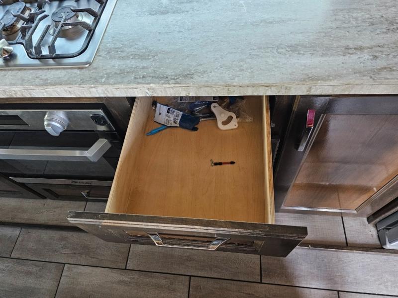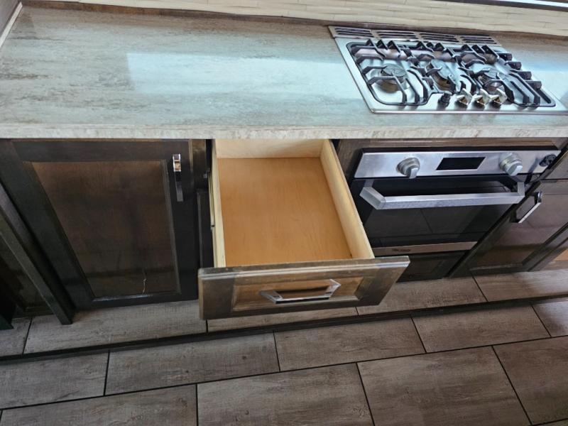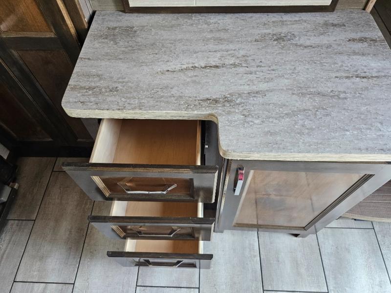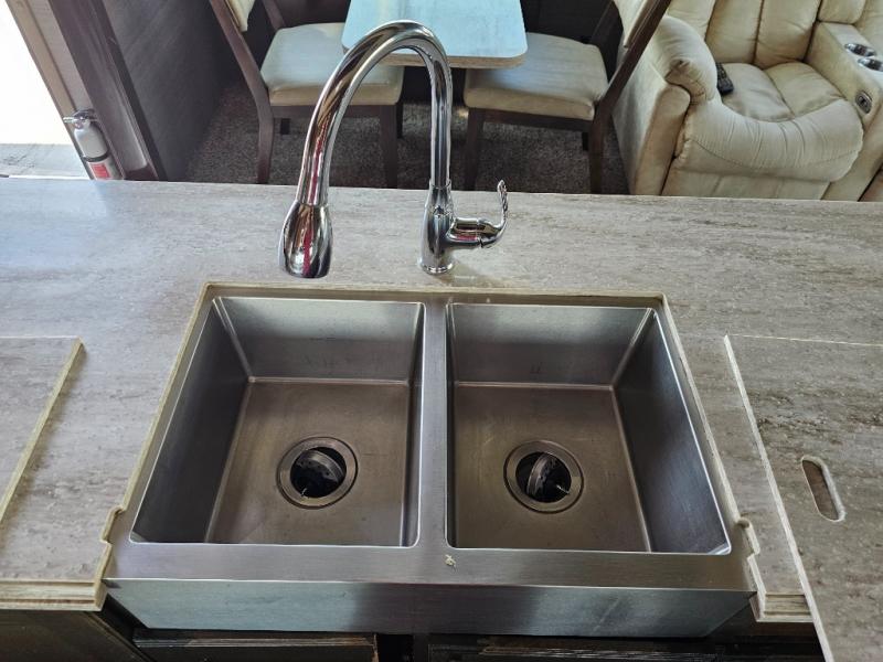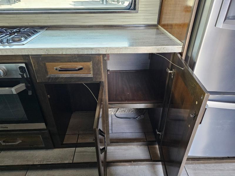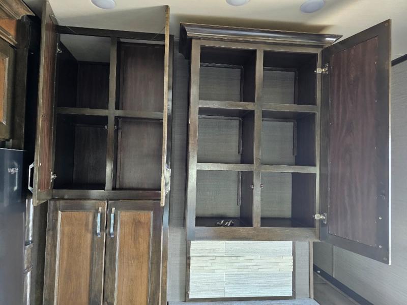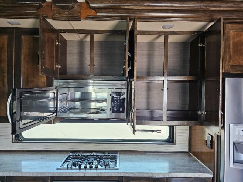 This Beacon fifth wheel feels spacious on the interior because of opposing slides in the main living area, and there is even a third slide in the front master suite so that you can enjoy the time you spend getting ready each morning. You'll definitely be drawn to the large island with lighting overhead, and the full hutch will be a great place to store precious kitchen items.
