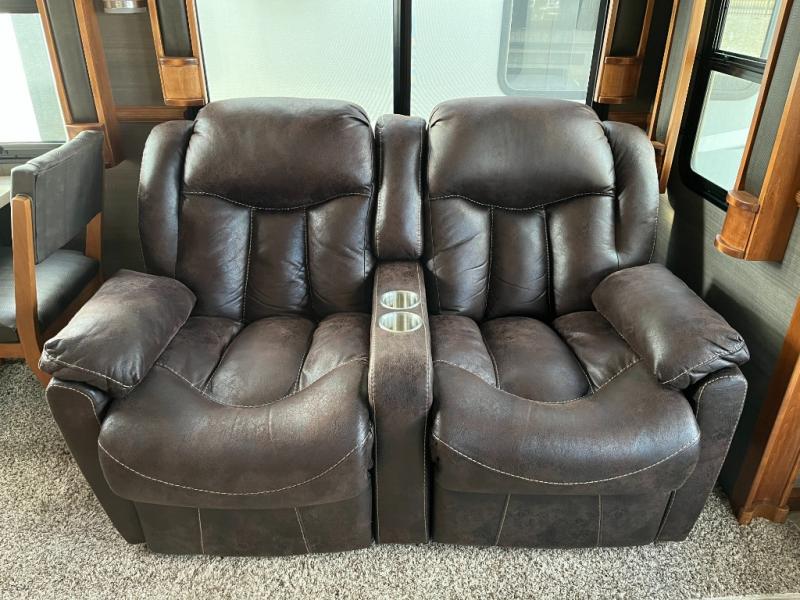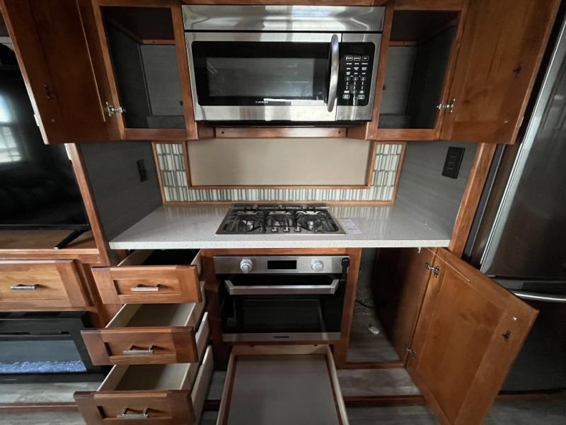 Step inside the 320GK and you’ll find a living area designed for both comfort and connection. Large panoramic windows invite abundant natural light, creating a bright and inviting space perfect for relaxing, entertaining, or simply enjoying the view at your favorite campground. Plush seating and elegant finishes add a touch of sophistication, while spacious floor room makes it easy to spend quality time with family or guests.