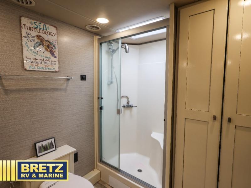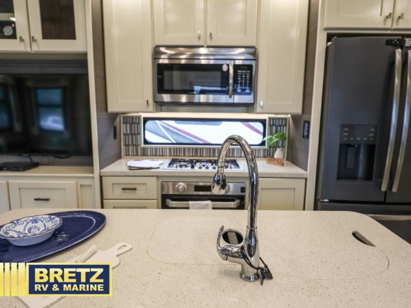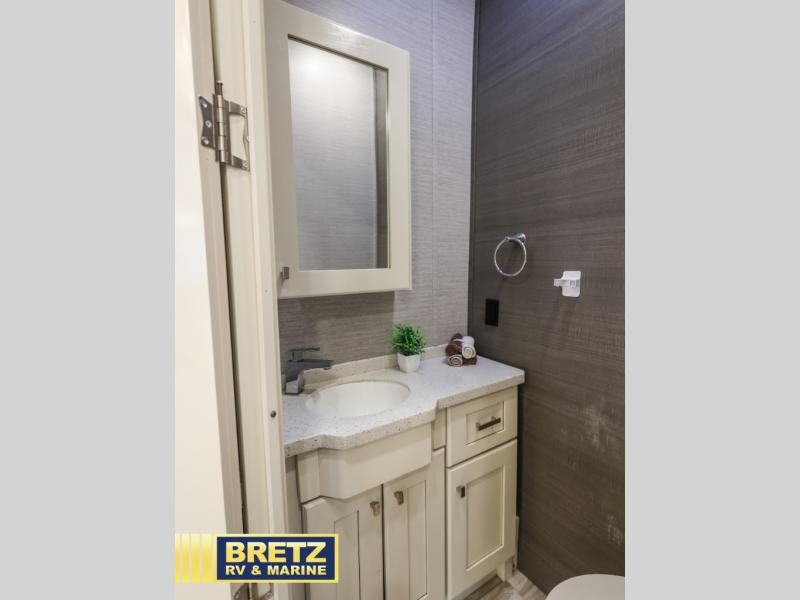 Don't wait another moment to test out this fabulous and accommodating Vilano fifth wheel for yourself! You'll see just how spectacular this unit is once you check out the full and half bath. The full bathroom in the front creates a luxurious master suite for you and your spouse, and it houses a dual-sink vanity so that you both can get ready quickly in the morning. After that, you can head out to the kitchen for a delicious breakfast around the kitchen island or the free-standing table with chairs.
