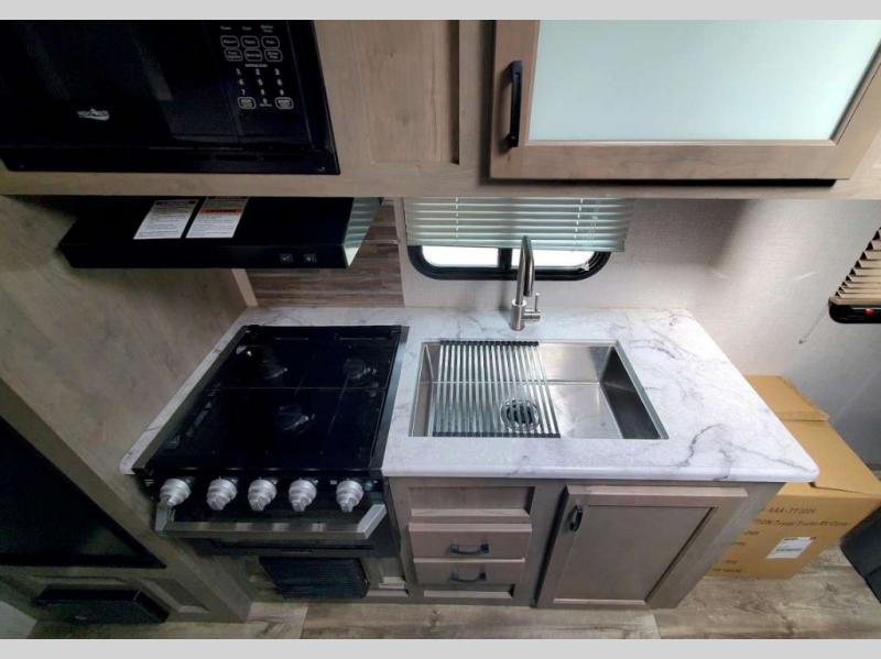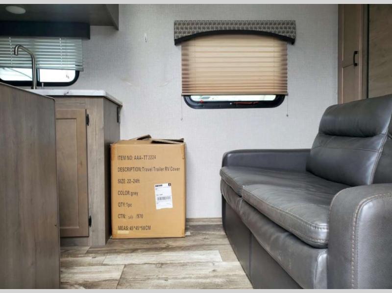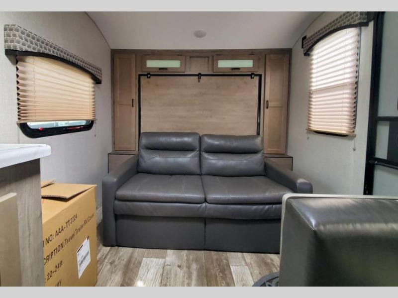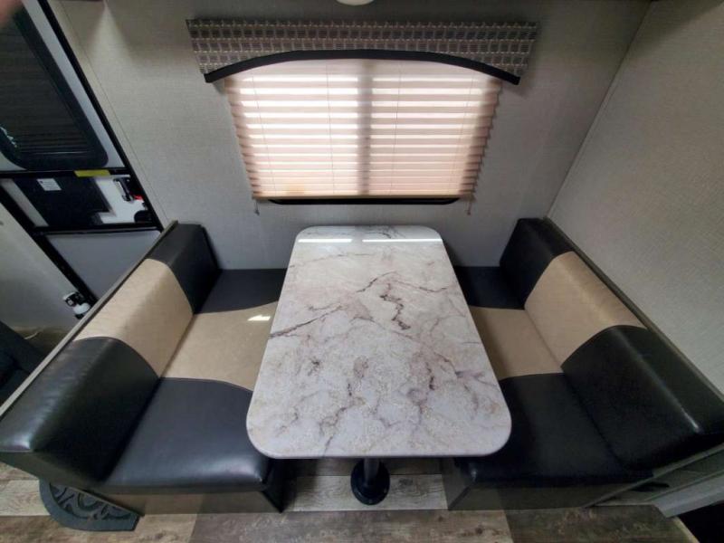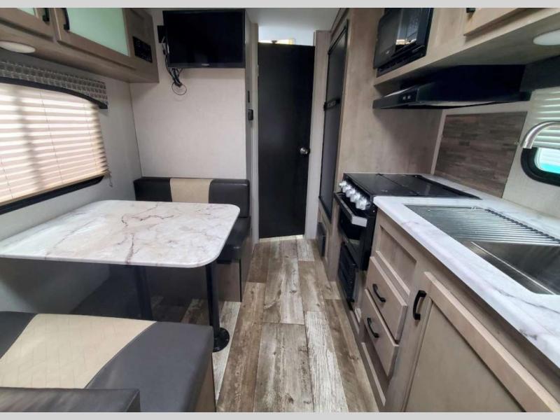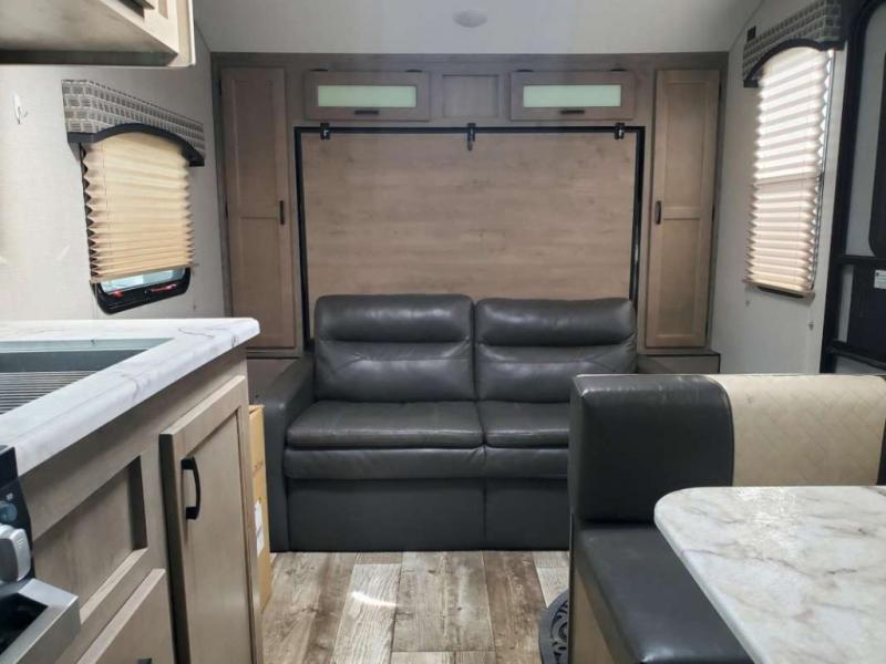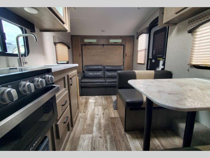 Just imagine you and your spouse exploring campgrounds with this lightweight travel trailer in tow. After a long day of traveling you can get a good night's rest on the RV queen-sized Murphy bed. You can then turn on the Furrion Bluetooth stereo and prepare a meal in the kitchen using the two burner cooktop. You then have the choice to eat at the dinette or outside under the 13' power awning. And the full rear bath allows you to skip the public facilities and get cleaned up after each activity.
