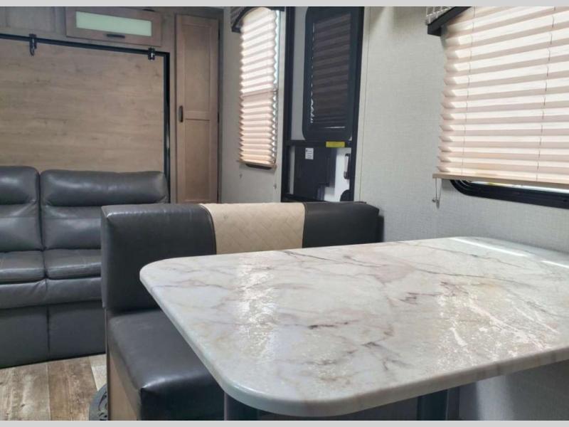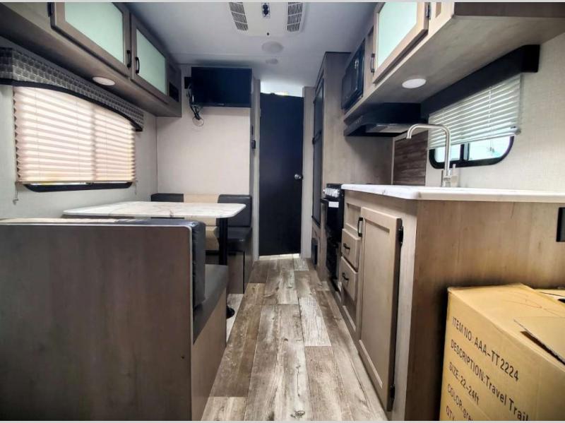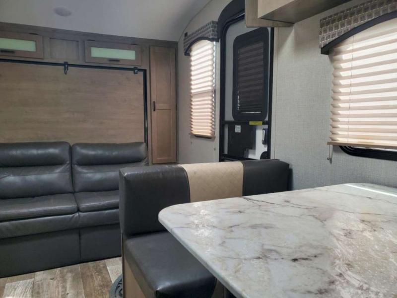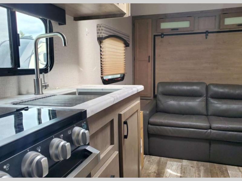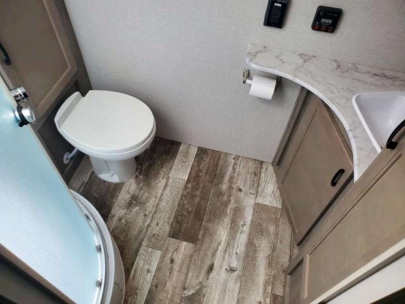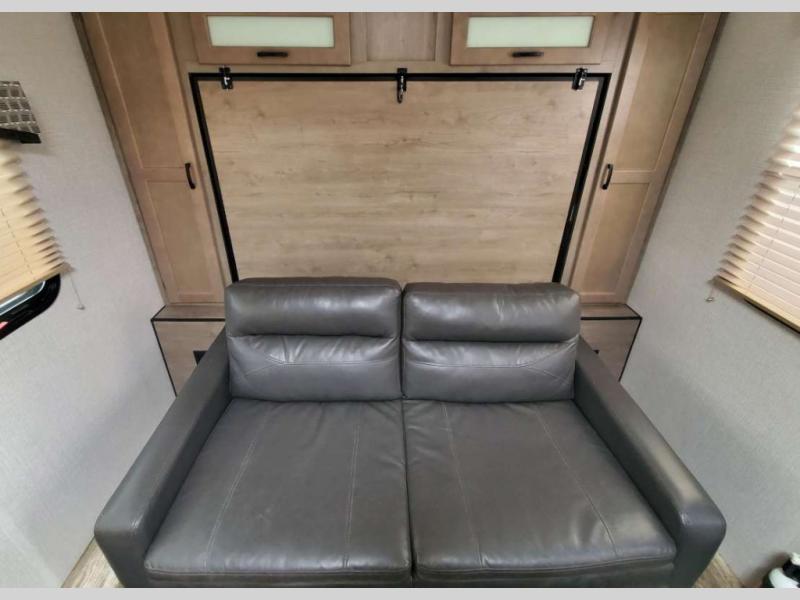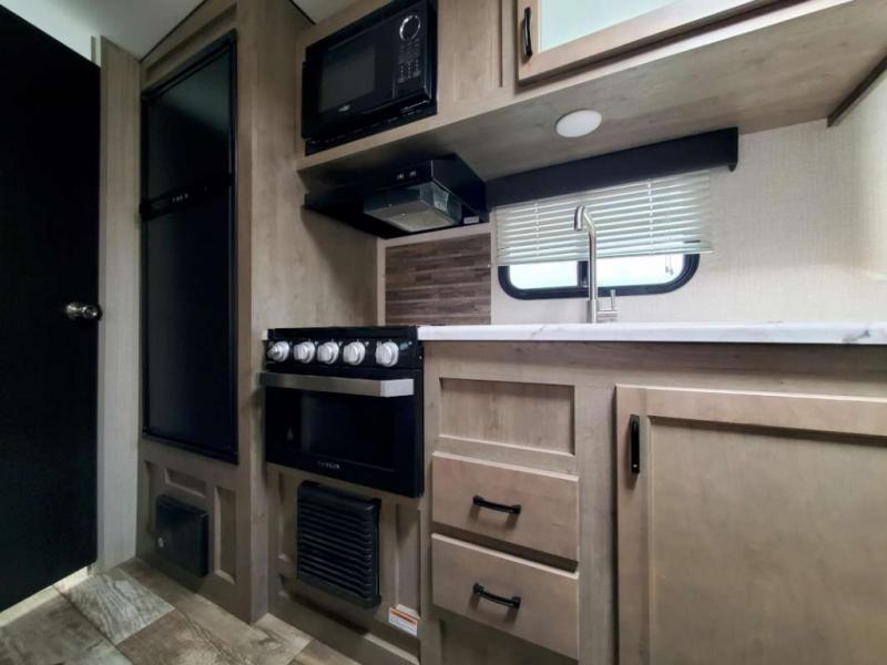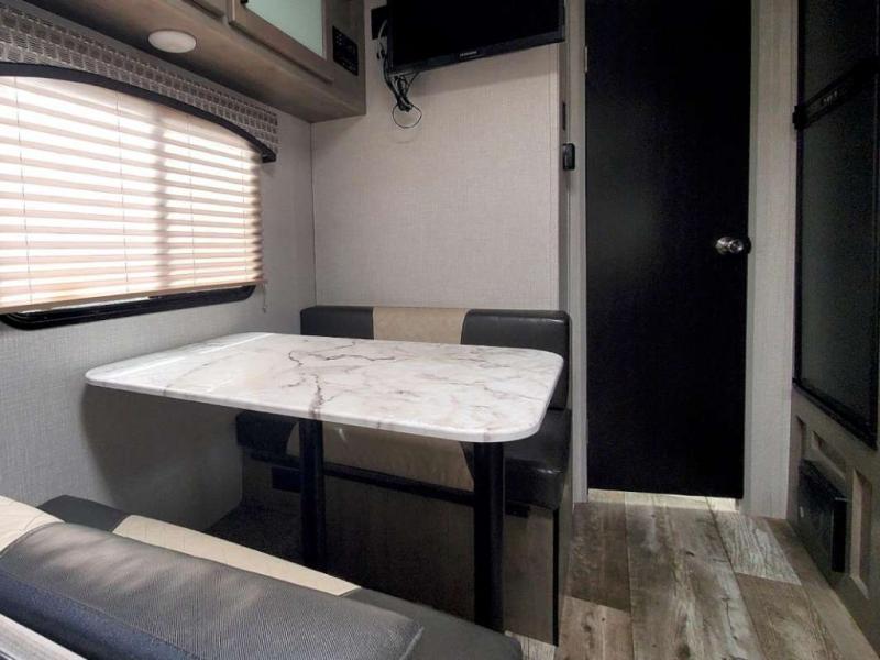 Just imagine you and your spouse exploring campgrounds with this lightweight travel trailer in tow. After a long day of traveling you can get a good night's rest on the RV queen-sized Murphy bed. You can then turn on the Furrion Bluetooth stereo and prepare a meal in the kitchen using the two burner cooktop. You then have the choice to eat at the dinette or outside under the 13' power awning. And the full rear bath allows you to skip the public facilities and get cleaned up after each activity.