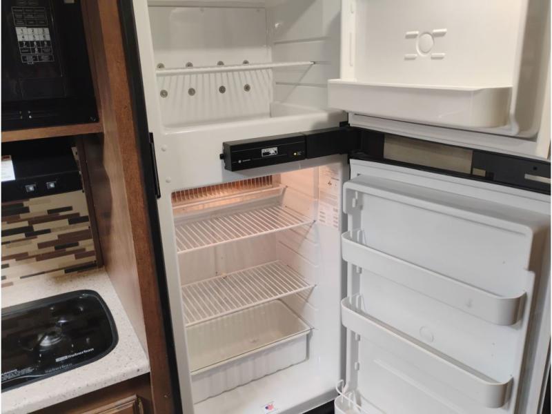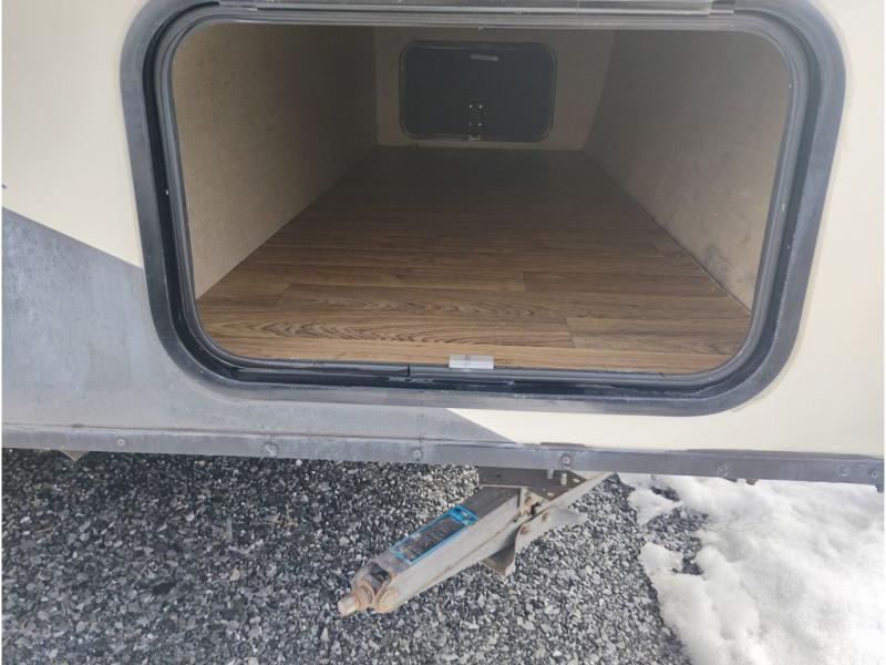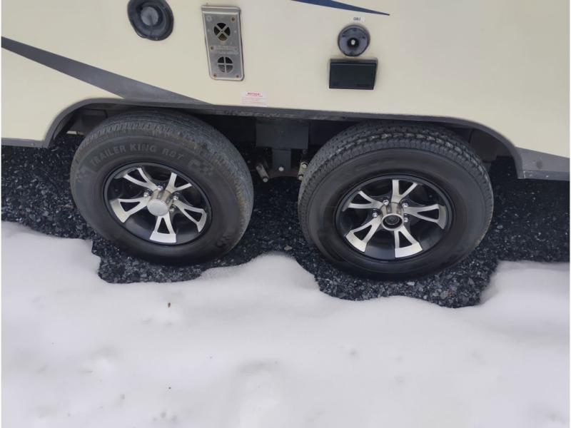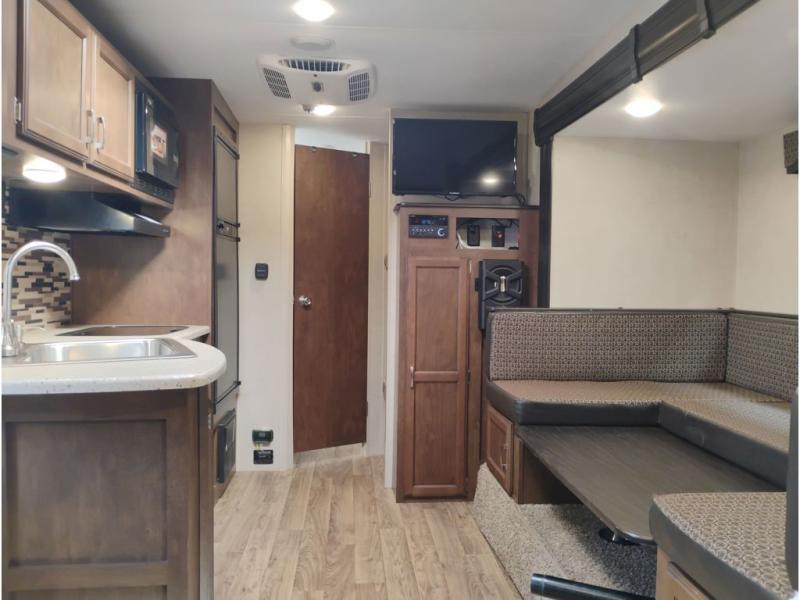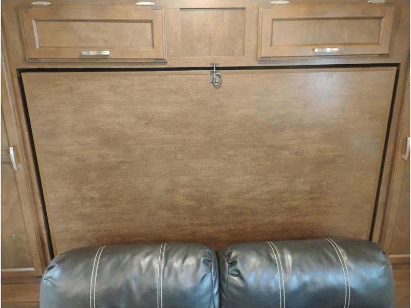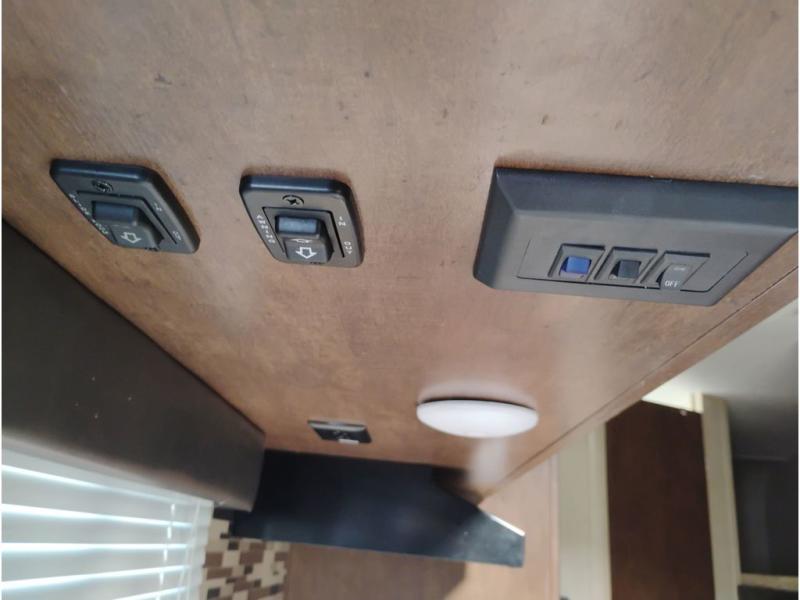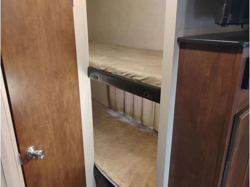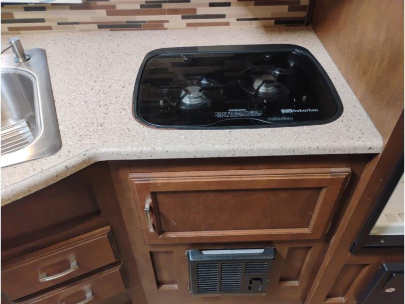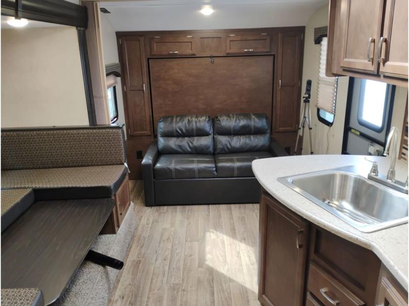 Just imagine you and your spouse exploring campgrounds with this lightweight travel trailer in tow. After a long day of traveling you can get a good night's rest on the RV queen-sized Murphy bed. You can then turn on the Furrion Bluetooth stereo and prepare a meal in the kitchen using the two burner cooktop. You then have the choice to eat at the dinette or outside under the 13' power awning. And the full rear bath allows you to skip the public facilities and get cleaned up after each activity.