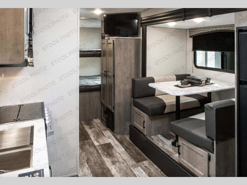 Pack your bags and bring the dog along for a fun camping trip in this travel trailer. You can easily hook your dogs leash to the Venture bottle opener/dog tie out while you set up camp and make a quick lunch on the campfire cafe outside. Inside, you'll find comfortable seating space on the booth dinette within the slide out and the kids will love climbing into the bunk beds at night. This model also includes a queen-sized Murphy bed up front which provides a sofa during the day and comfortable sleeping space at night.