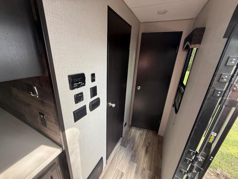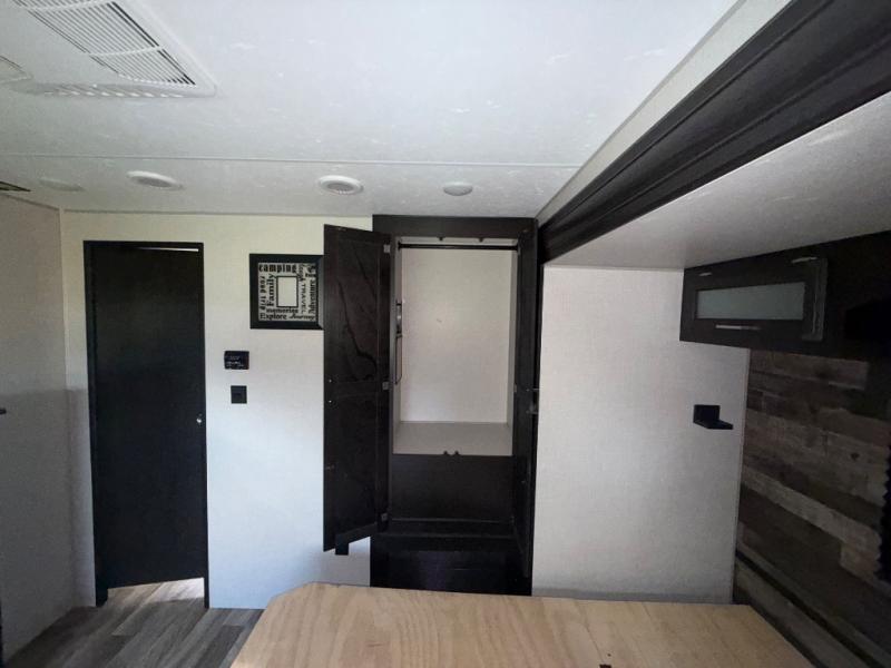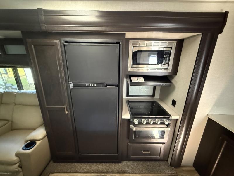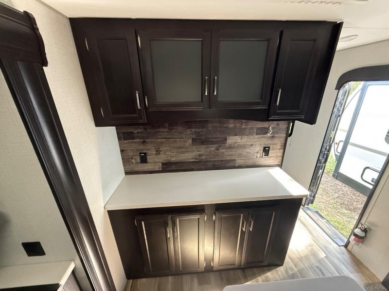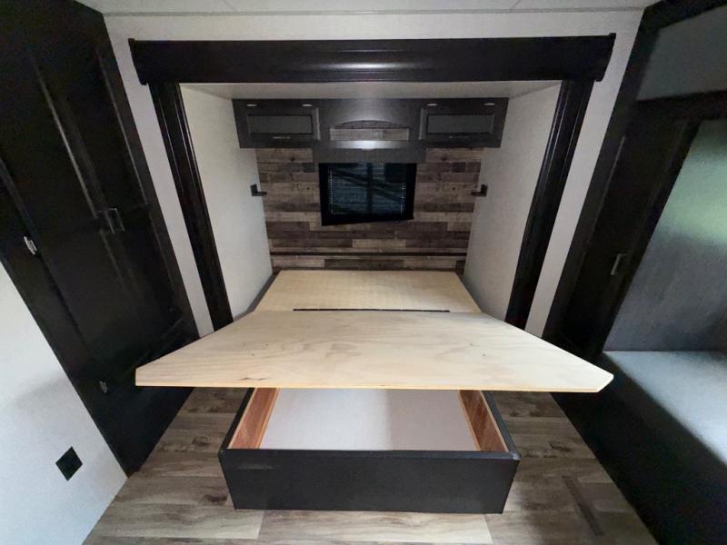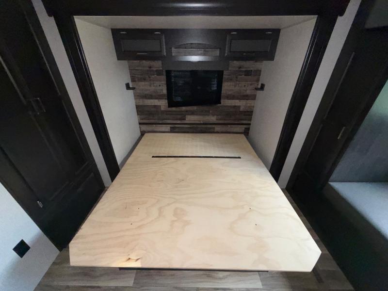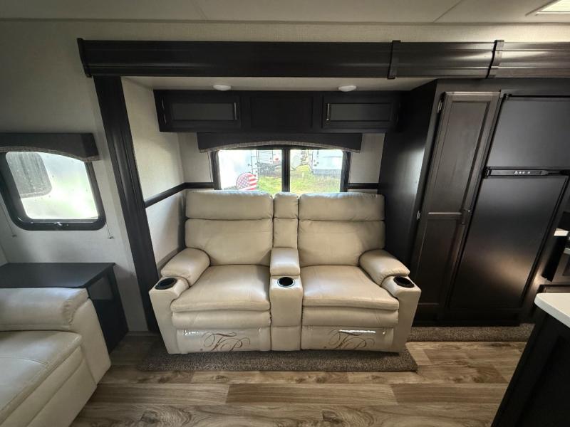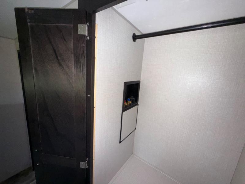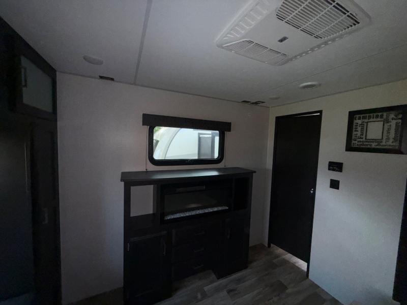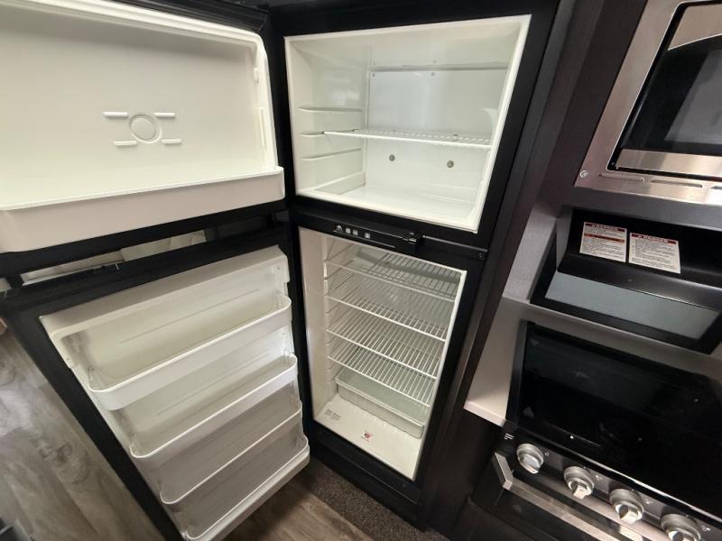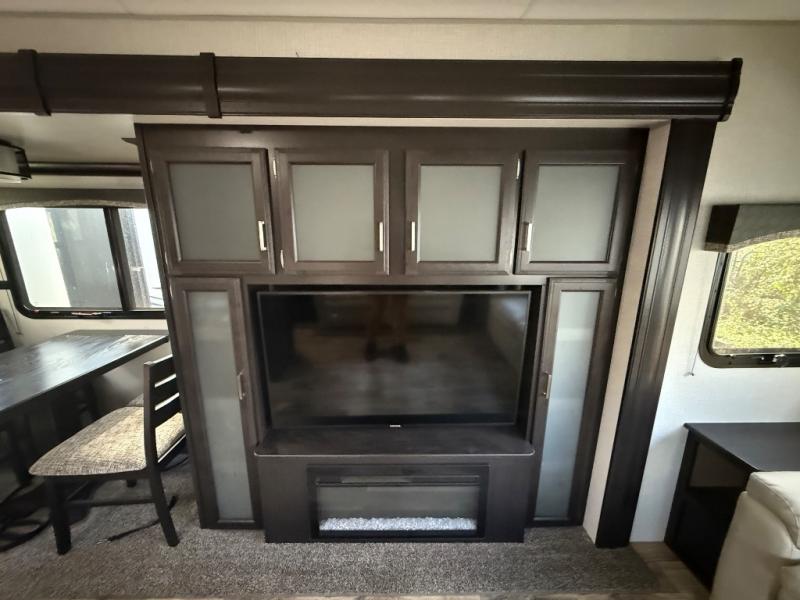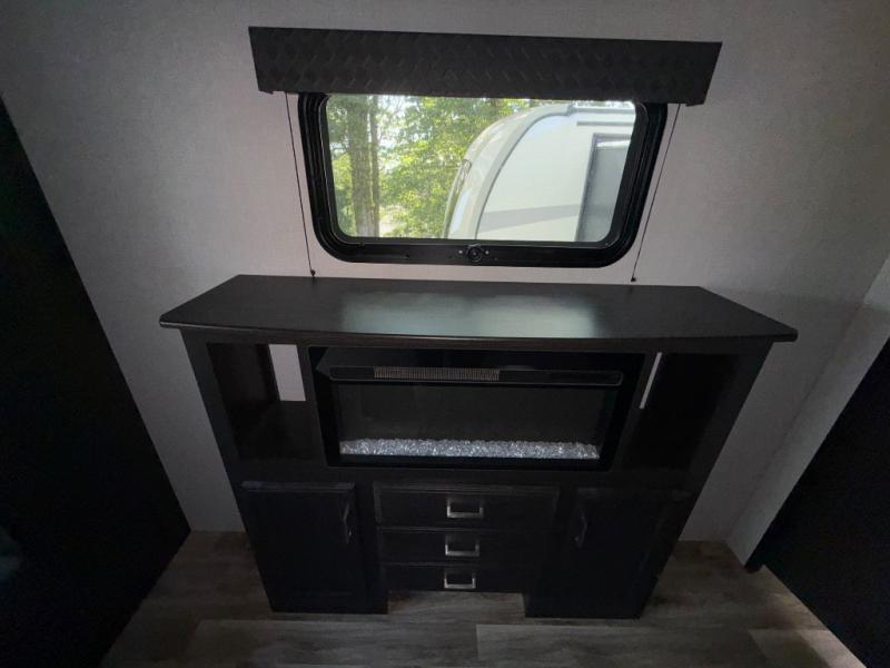 One look at this travel trailer and you can be sure you've just found your new RV! The main living area features dual opposing slides, opening up the whole space for a relaxing feel. You'll find the third slide out in the front bedroom for added space and comfort. The chef of the family will have their choice to cook indoors on the three burner cooktop, or outdoors on the campfire cafe. Your guests will have plenty of seating space on the theater seats or on the tri-fold sofa bed. This model also includes two fireplaces for complete comfort, and a space that has been prepped to add an optional washer and dryer to make wash day easier than ever!