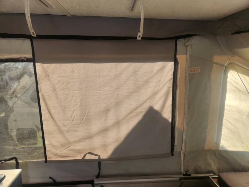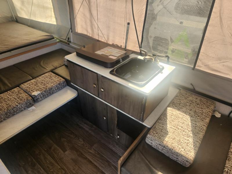 For the family who enjoys camping and the flexibility to roam, come check out this Viking LS Series folding pop-up camper. Along either side of the entry door are storage cabinets and countertops, and almost straight in front of the entry door is a booth dinette where you can gather around and enjoy a cup of coffee. At night this area as well as the U-shaped dinette can easily convert into additional sleeping space, giving this model enough space to sleep seven. You will also find a nice little kitchen area with a single sink, 1.9 cubic foot Dometic refrigerator, and a two-burner range.