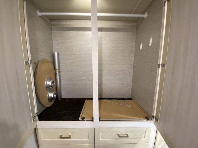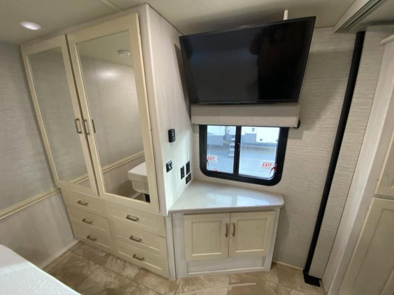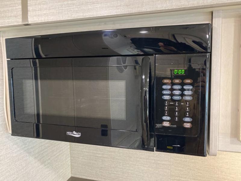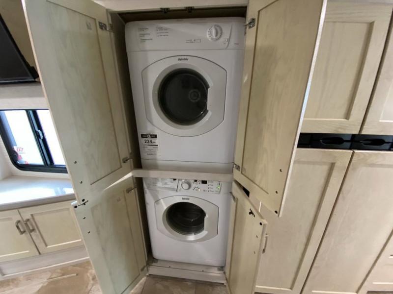 Who doesn't enjoy relaxing outside in the great outdoors with entertainment? You can host a party under the power awning with LED lighting to stay up into the late hours while you watch the 32" HDTV or listen to a few tunes from the two speakers. There is even a DVD player, and the Tailgate package offers a refrigerator, a portable grill with a folding stand, a stainless steel sink, a silverware tray, a wall-mounted bottle opener, and more! Back inside you can fall asleep on your own queen bed or optional king while your pet sleeps in their Pet Palace underneath, and your guests can sleep on the sofa or the StudioLoft bed if you added that option. The next morning you can make breakfast in the full kitchen, wash linens if you added the washer/dryer option, and get cleaned up in the full bathroom.