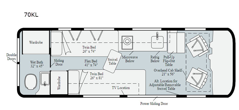 Imagine having the flexibility to sleep on twin beds or a Flex Bed measuring at 41" x 74", the choice is yours when traveling in this Boldt. You will find one of the twin beds is a little longer than the other for the taller member of the family, and the swivel cab seats give you more seating to relax when you have reached your destination. You will have the ability to make meals in the microwave/convection oven, and dine at the flip-up table. The wet bath allows you to shower if you like, and exterior wash station provides a place to wash off your hiking boots. There are more features and options to choose from, take a look!