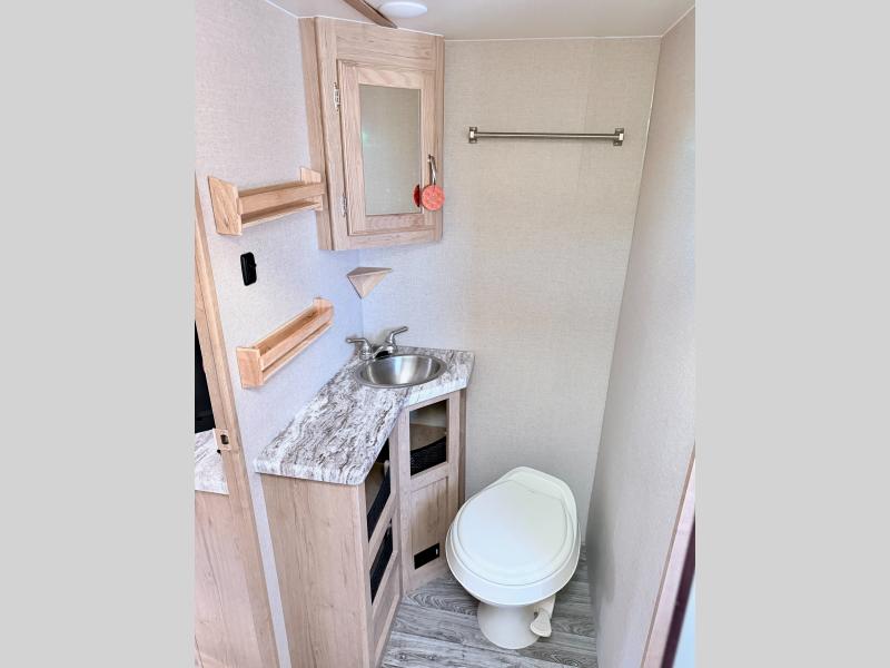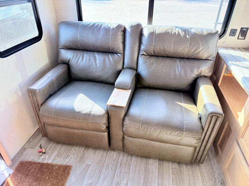 Camping in this Winnebago Industries Micro Minnie fifth wheel will be your best experience yet! It features a front private bedroom that has a queen bed with wardrobes on either side and an entrance into the walk-through bath. Inside the bathroom, there is a shower, a toilet, and a vanity sink with extra counter space. Just outside to the right of the bathroom is a pantry and a booth dinette for you to enjoy your meals at. At the rear of the unit is a sofa with an end table, or you can choose to switch it out for the optional theater seating!