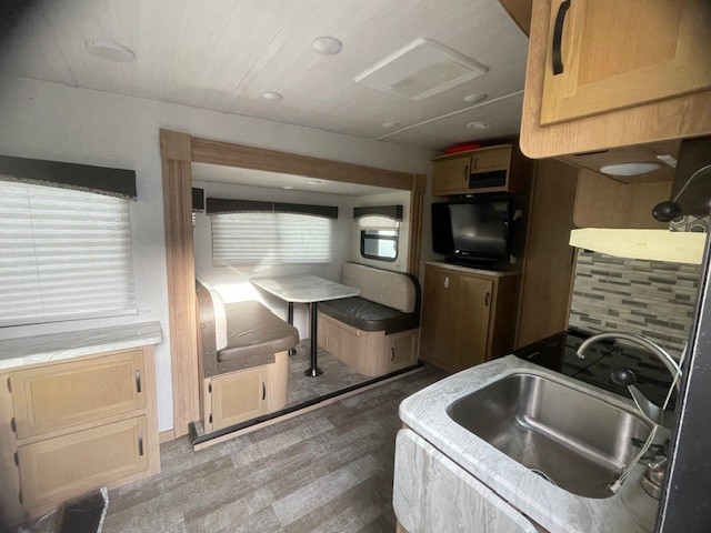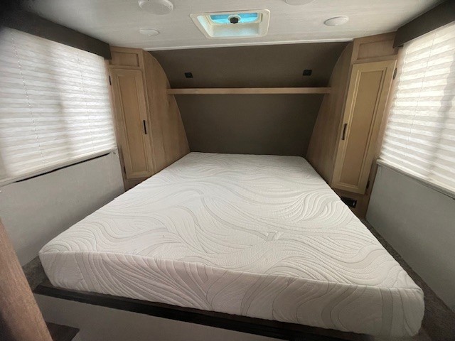 Camping in this Winnebago Industries Micro Minnie fifth wheel will be your best experience yet! It features a front private bedroom that has a queen bed with wardrobes on either side and an entrance into the walk-through bath. Inside the bathroom, there is a shower, a toilet, and a vanity sink with extra counter space. Just outside to the right of the bathroom is a pantry and a booth dinette for you to enjoy your meals at. At the rear of the unit is a sofa with an end table, or you can choose to switch it out for the optional theater seating!