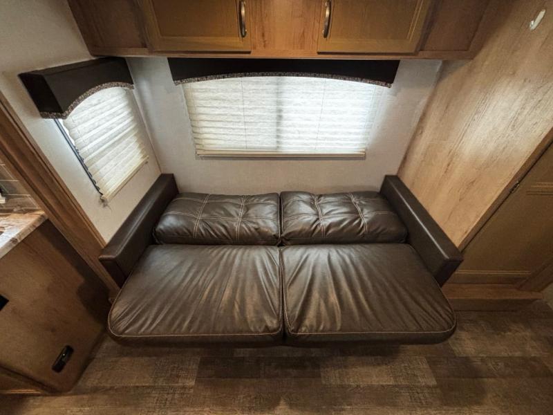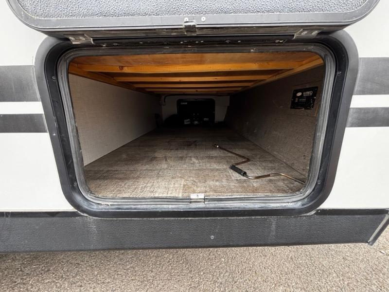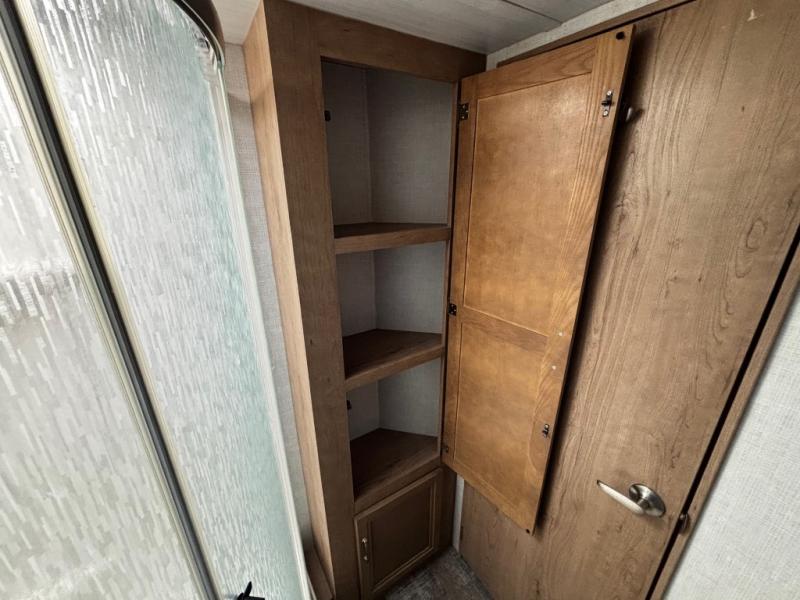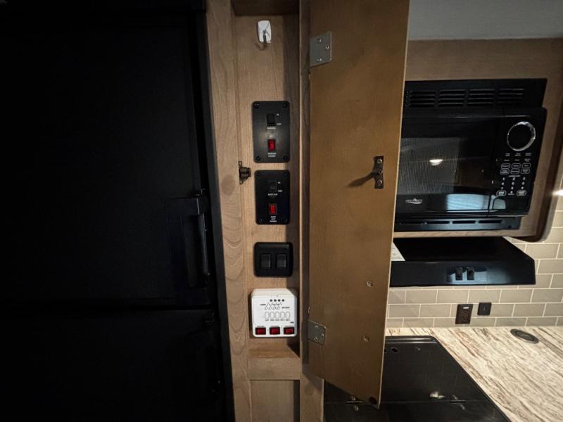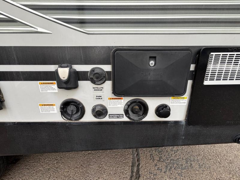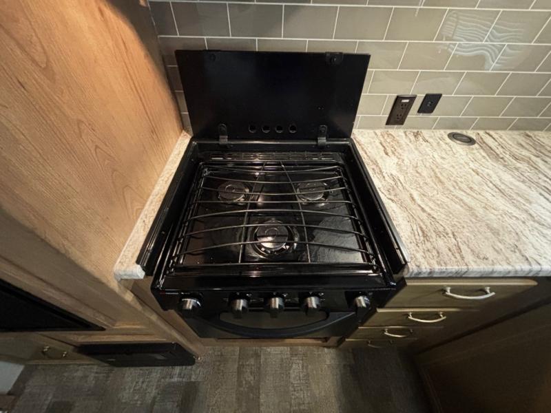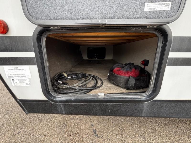 The rear kitchen really makes this Minnie travel trailer unique. You will find it easy and fun to cook while you camp, and dining will be comfortable at the booth dinette inside. You can also choose to take your meals out on a warm, sunny day and enjoy the sites and sounds while you eat at a picnic table or under the 19' power awning in the shade. There is abundant storage throughout with overhead cabinets, wardrobes, and lockable storage spaces on the exterior where you can tuck away outdoor toys, games, and gear. You will also find an outdoor shower which is great for rinsing off before heading inside. The front master suite also features its own private entry door making it convenient to slip outside for a moonlit stroll on a warm, clear night!