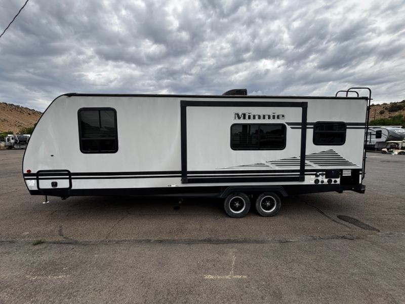 In any Minnie travel trailer by Winnebago Industries Towables, you will find increased living space with a fantastic single slide. On the inside, you will find each Minnie trailer to be full of life with light-colored interiors, easy-to-clean linoleum surfaces along with efficient LED lighting. The best-in-class exterior storage features 44 cu.ft. of space for all your camp gear, and the lockable storage door will help keep everything secure. You will also be the talk of the campground with your Minnie travel trailer because it comes with exterior fiberglass sidewalls.