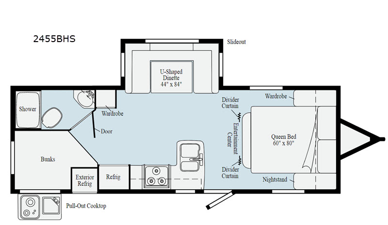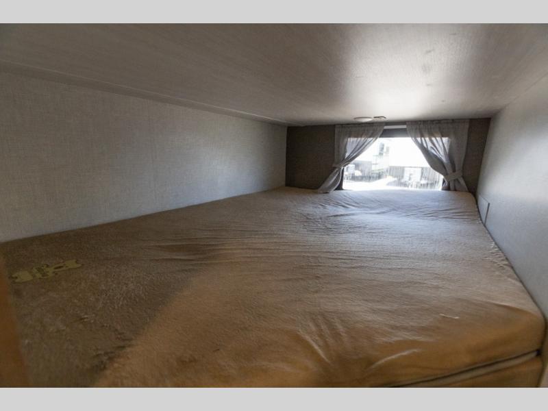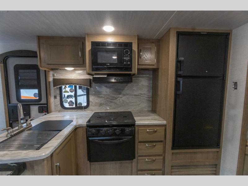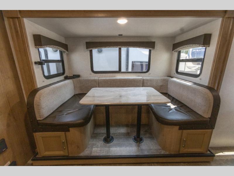 Your larger family will enjoy camping in this Minnie travel trailer where eight people can sleep comfortably. The U-shaped dinette slide creates more room for moving about, and it is a great spot to enjoy a family board game or game of cards. You will find double-size bunks conveniently located next to the rear corner bath for children to have quick access at night. The outdoor kitchen is also a handy feature for any camping family allowing them the choice to spend as much time outside when possible. This outdoor kitchen features a two-burner cooktop, single sink, and refrigerator. With a family of eight, a large breakfast might actually require two people cooking, so the second cooktop can be utilized quite easily out under the 19' power awning.