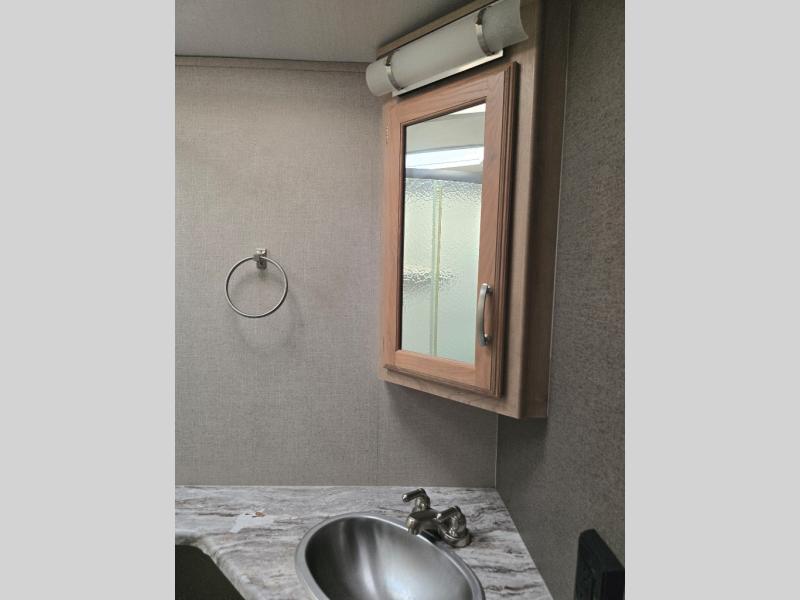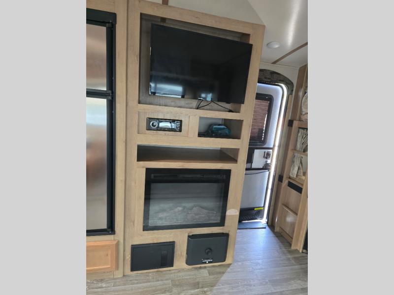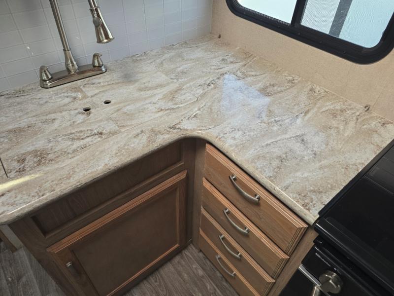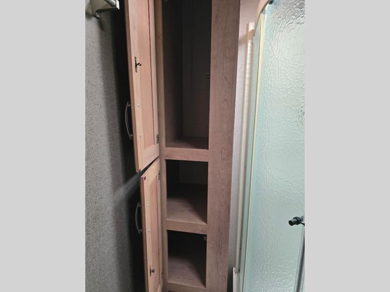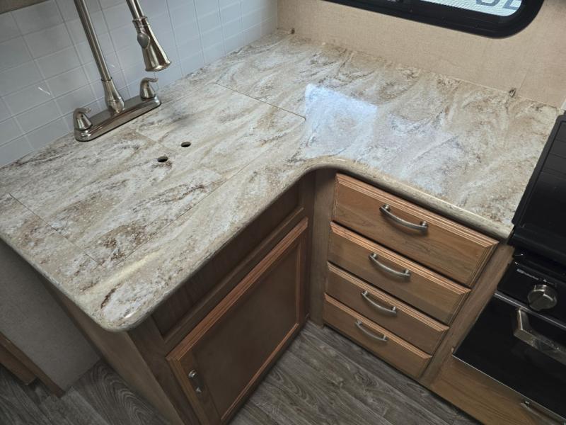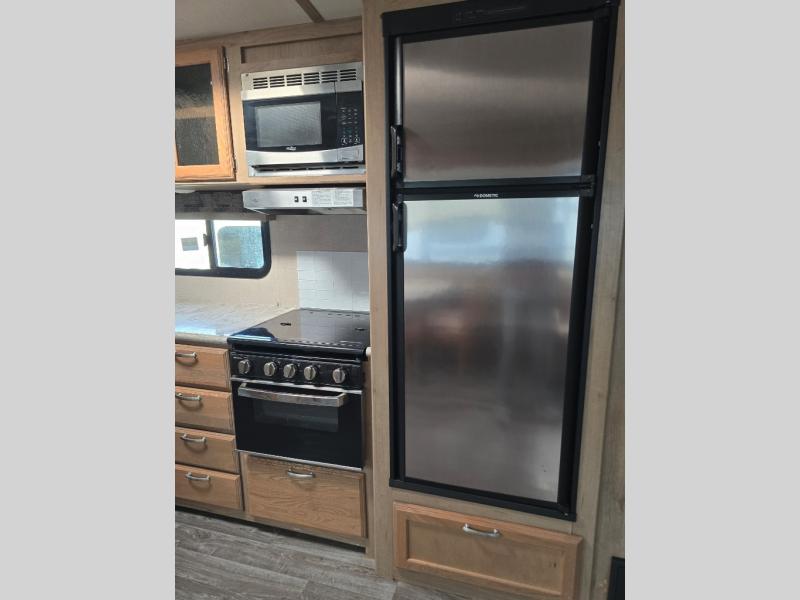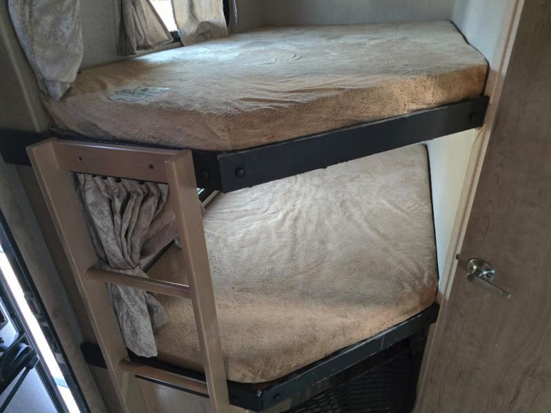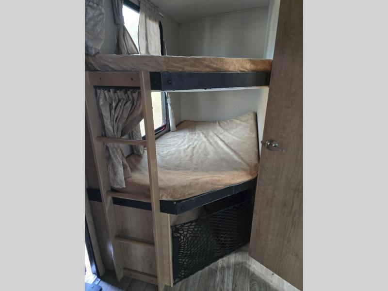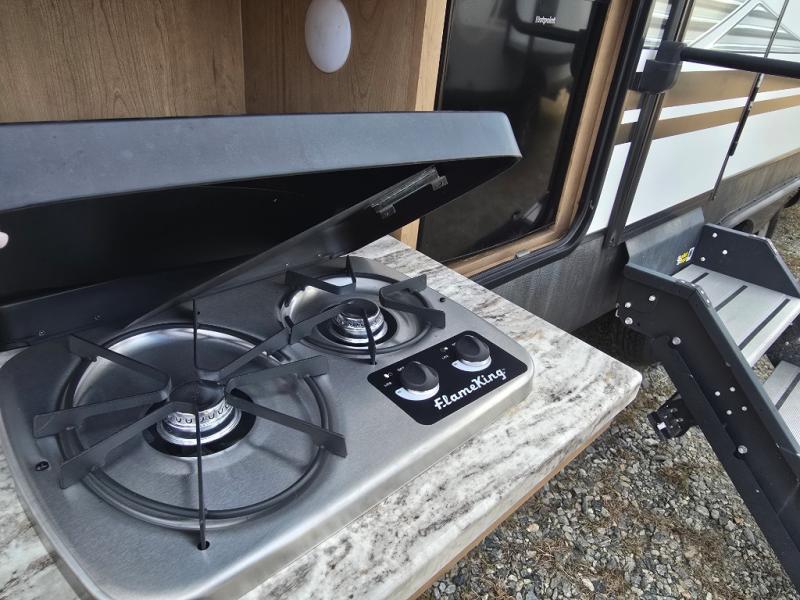 Imagine making meals on the outside pull-out kitchen while watching your kids ride their bikes around the campsite. This Minnie Plus travel trailer also offers an inside kitchen with solid-surface countertops and a three-burner range. You can dine, play games, and sleep at the U-shaped dinette, and someone might even fall asleep in one of the theater seats. At nighttime, you will find the kids on the bunk beds next to the rear bath, and you can sleep on the queen bed in the front bedroom. The sliding bedroom door saves floor space so that you can move around more freely. This is the perfect trailer for a larger family.