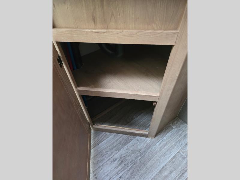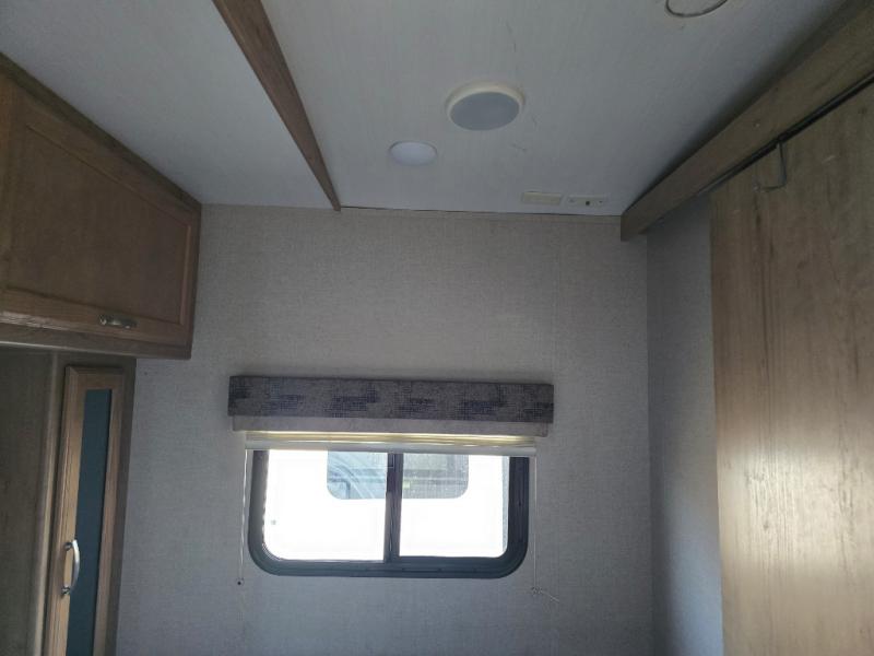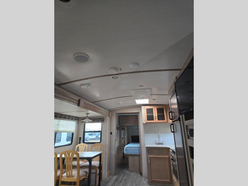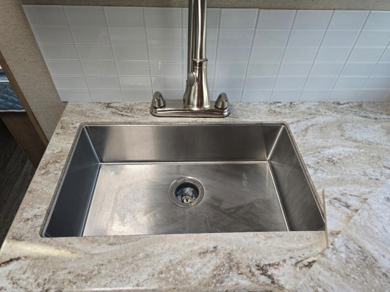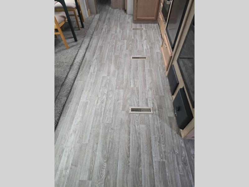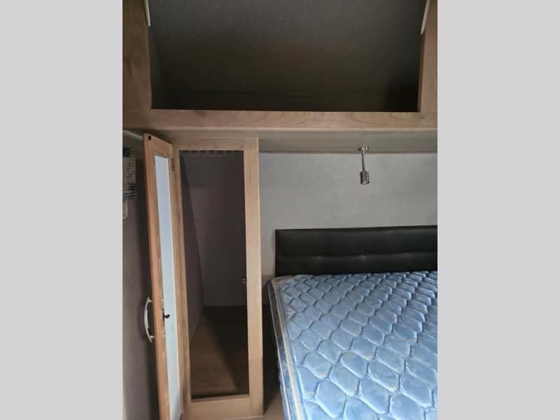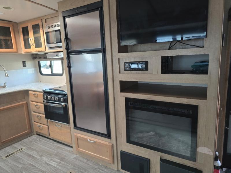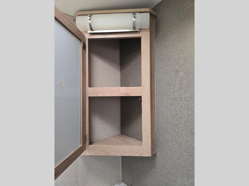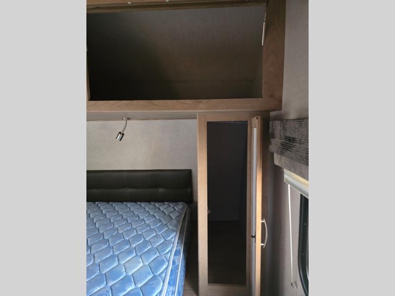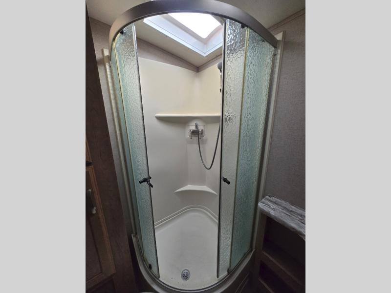 Imagine making meals on the outside pull-out kitchen while watching your kids ride their bikes around the campsite. This Minnie Plus travel trailer also offers an inside kitchen with solid-surface countertops and a three-burner range. You can dine, play games, and sleep at the U-shaped dinette, and someone might even fall asleep in one of the theater seats. At nighttime, you will find the kids on the bunk beds next to the rear bath, and you can sleep on the queen bed in the front bedroom. The sliding bedroom door saves floor space so that you can move around more freely. This is the perfect trailer for a larger family.