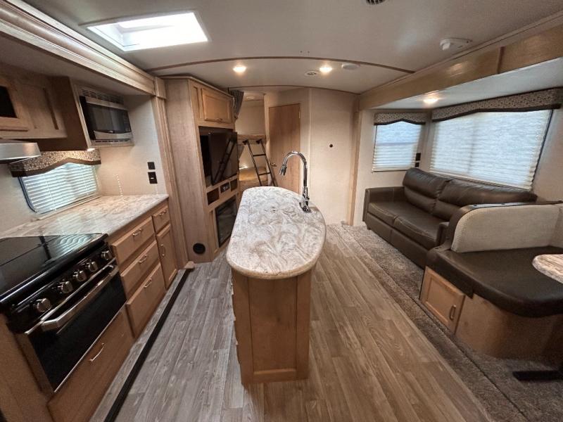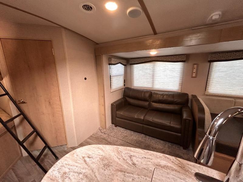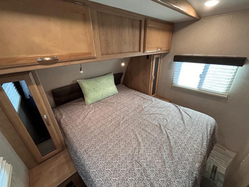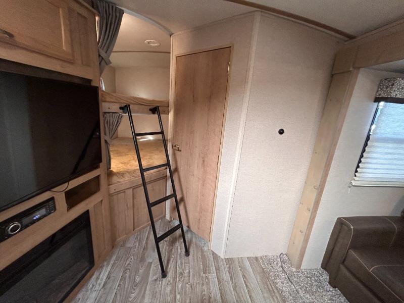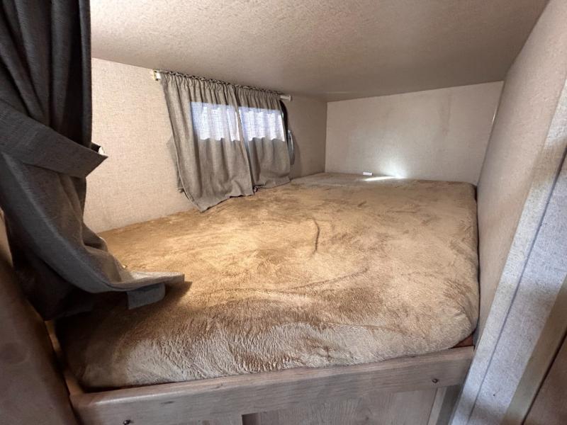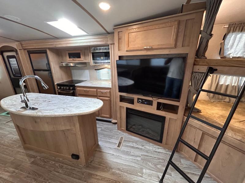 The kids are going to love this Minnie Plus travel trailer that includes bunk beds! The full bathroom is in the back right next to the bunks which makes it easier for the little ones to use the restroom at night. Dual opposing slides in the living and kitchen area are what give this unit an open floorplan, and the kitchen island brings everything together. Bring along all your comforts from home and clothes for the week because this model features a large wardrobe and a pantry for dry goods.