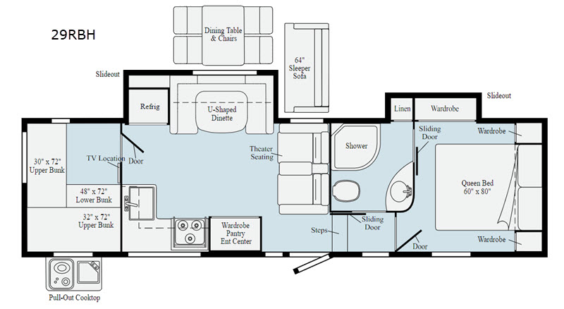 You will certainly enjoy camping season with your larger family when you have this Minnie Plus fifth wheel hitched up and ready to roll! With two slides, two private sleeping spaces, and a dual-entry bathroom, you might be seeing double! The bunkhouse features a 48" x 72" lower bunk and two upper bunks, plus a door for privacy. You will find furniture in the main living area to relax and visit with the cook in the L-shaped kitchen. You can choose to have an optional 64" sofa sleeper in place of the theater seating if you need even more space for overnight guests. When it comes time for feeding your entire crew, let the outdoor cooktop and sink make it easy to accommodate all of your hungry campers.