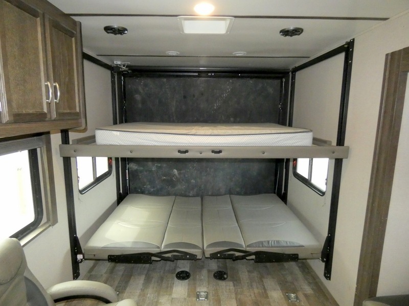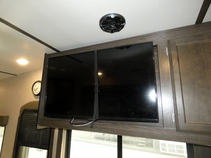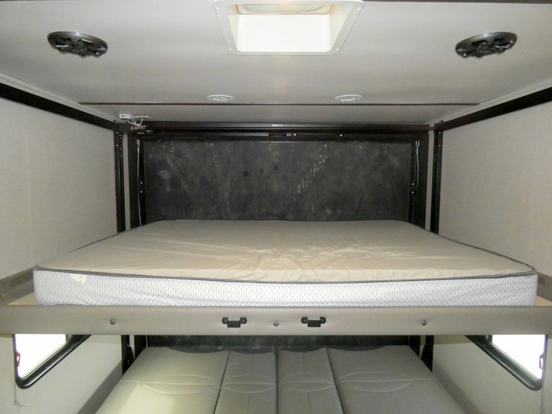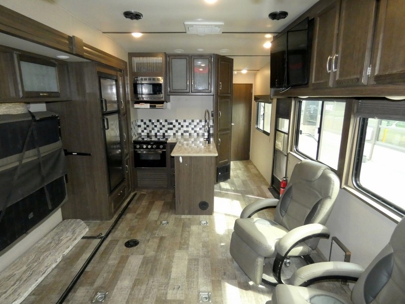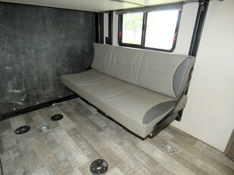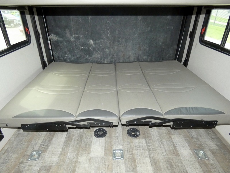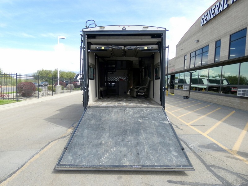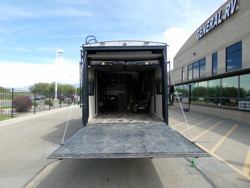 With double slides, a king bed, plus 14' cargo space, this toy hauler is packed with all the features you are sure to love. In the evening your guests can sleep on the Happi Jak sofas or on the drop-down queen bed in the garage and you'll appreciate your own private bedroom with access to the dual entry bath for convenience. Whip up some breakfast on the three burner range or make something quick in the microwave before taking your Harley on a ride and you'll appreciate a full bath to clean up after a long day. This unit also includes a 70" wall-mount sofa that is great for watching a movie on or for even more sleeping space.