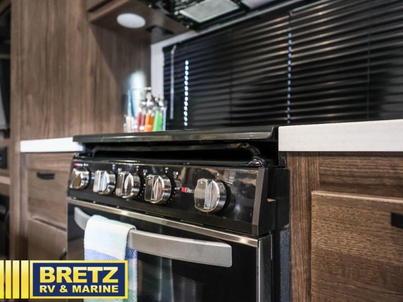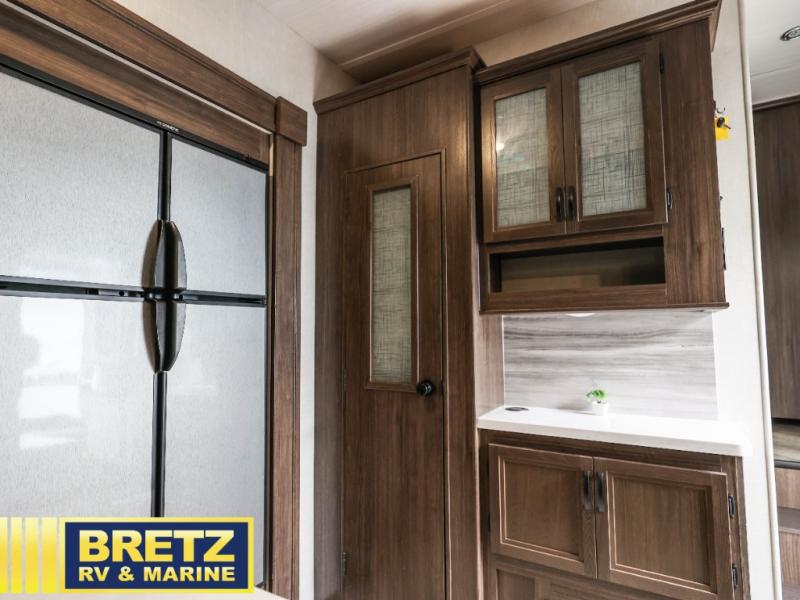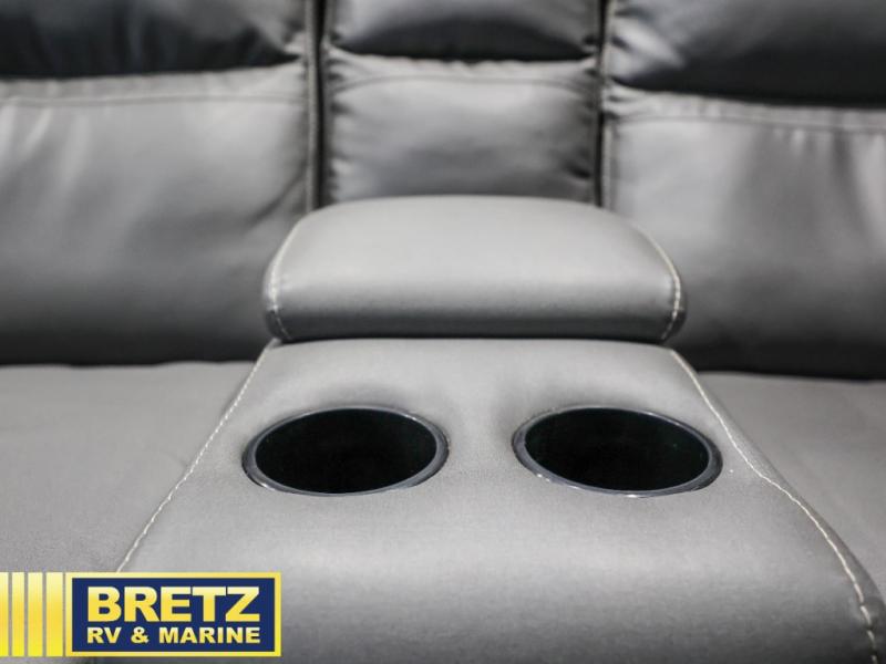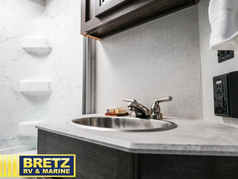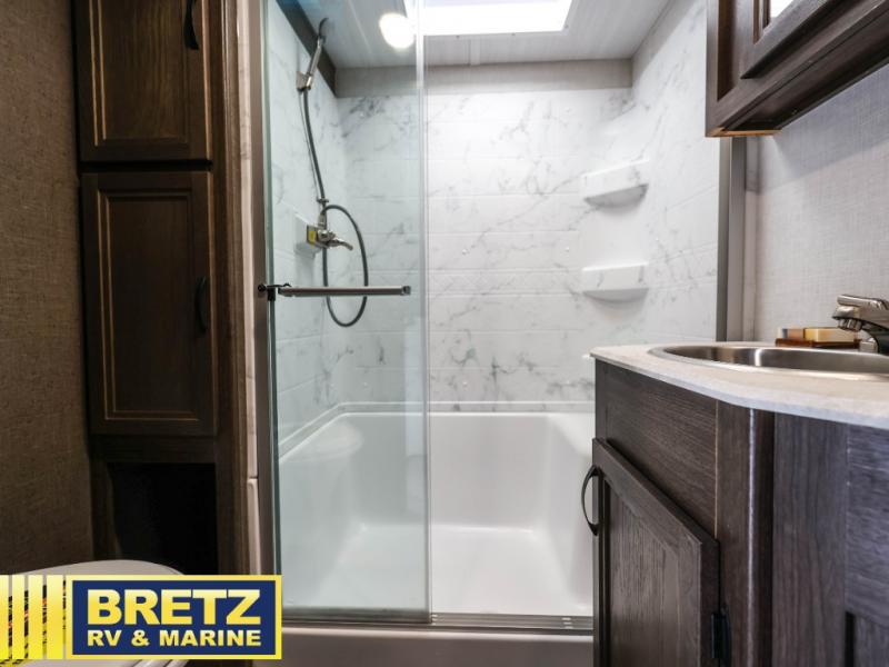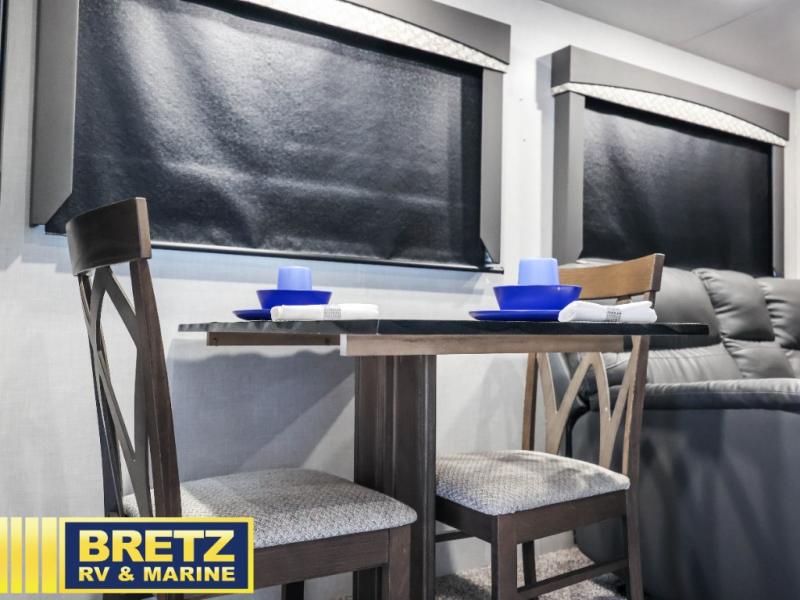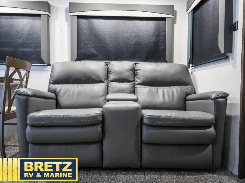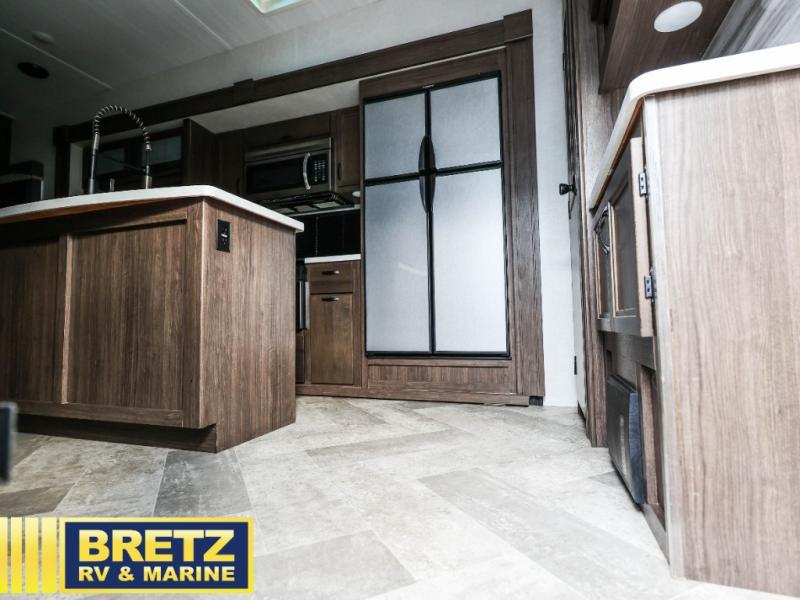 You'll love the space you have throughout this Voyage fifth wheel thanks to the dual opposing slides in the living/kitchen area and a third slide in the front private bedroom. The chef of the family will have plenty of counter space, including a kitchen island and a hutch, and the dry goods can go in the pantry. Relax on theater seating as you watch a movie on the LED TV or play a game of cards with the kids at the free-standing table with chairs. This unit also features a full bath with a large shower and sliding doors to save space, and the front private bedroom includes a large wardrobe and a closet for all your clothes!