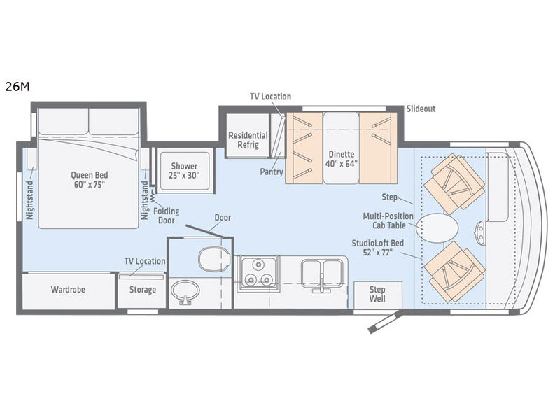 When you travel in this Intent Class A Gas motorhome, you will finally be able to experience the lifestyle you have been longing for. In the cab area you will find narrow corner pillars that enable better views of the road and enhance safety, and the multi-adjustable cab seats will allow you to swivel around and join in on the fun that is going on in the back of the coach whenever you need a break from your long travels. When you are ready to rest for the evening, you will find it so comforting to relax on the queen-size bed in the rear, private bedroom while your children or guests enjoy the thrill of sleeping in the powered StudioLoft Bed above the cab.