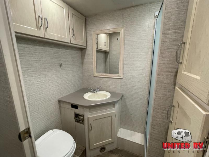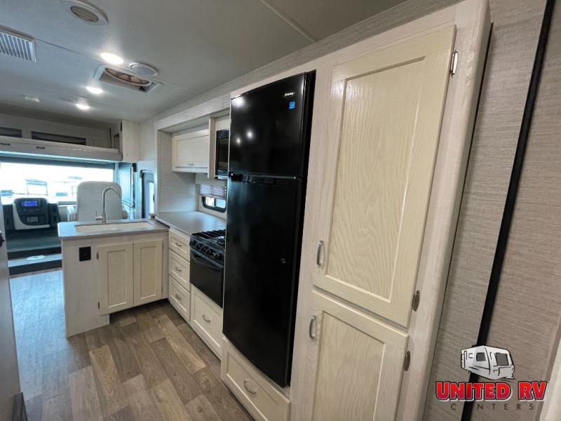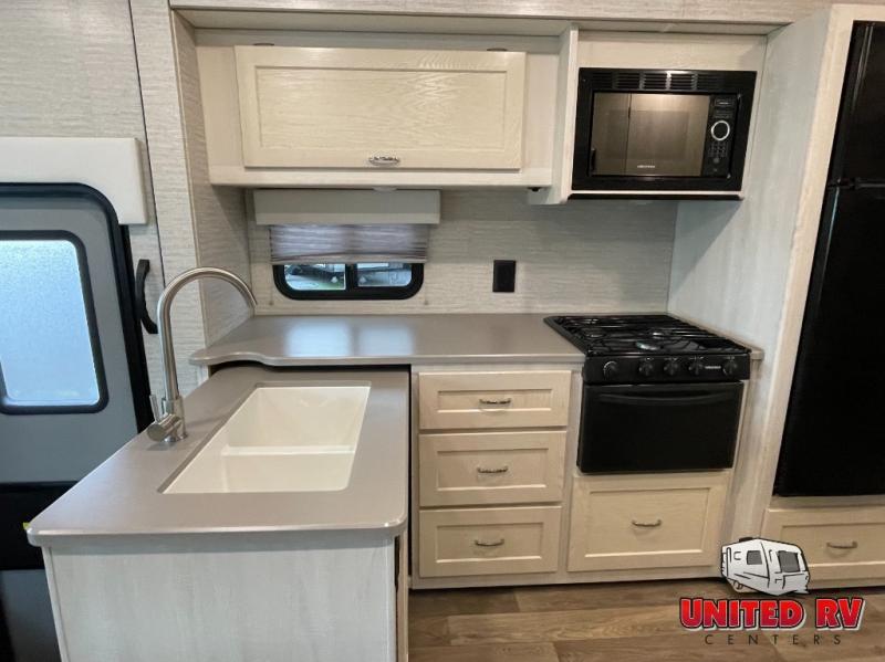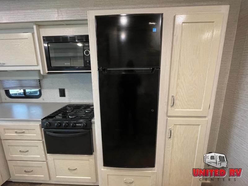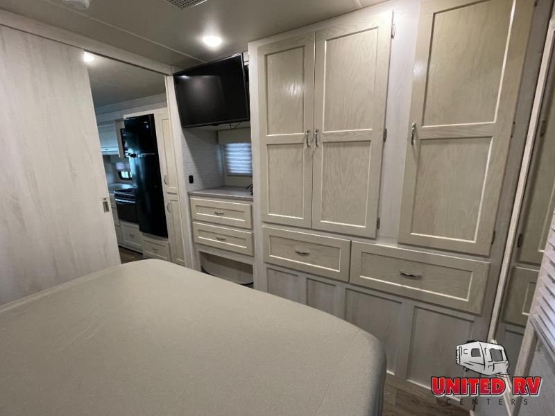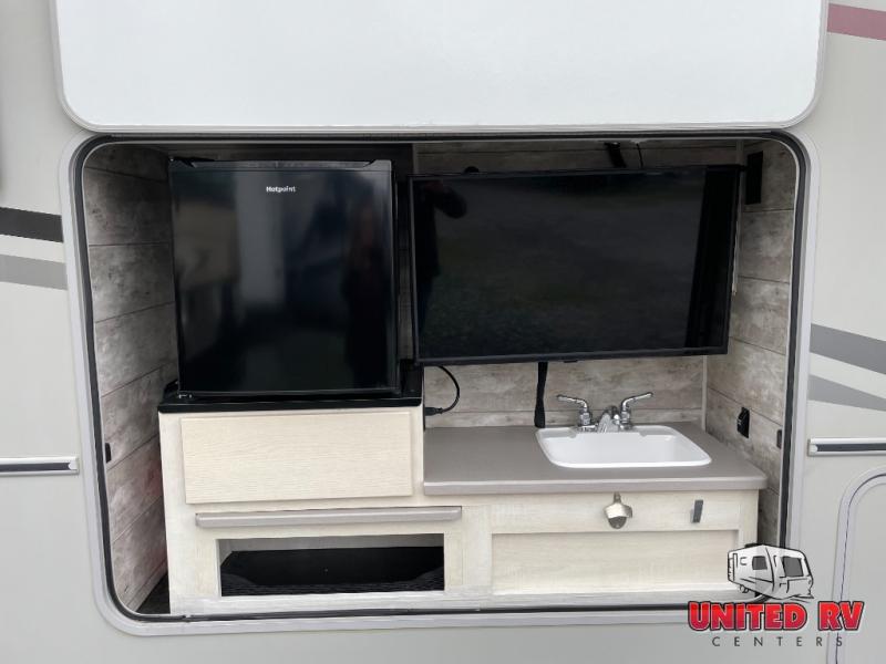 The spacious interior is created by three slides, and the the kids will be excited to spend their nights on the StudioLoft bed. And you can sleep one more camper on the dinette once set up for bedtime while you have your own queen bed in the rear bedroom. Just slide the door closed for privacy. The dinette also offers a place to work in comfort with its Hi-Lo table and the dash workstation with USB does as well. Prep dinner like a pro with full kitchen amenities and pull out snacks from the pantry for anyone that is too hungry to wait for dinner. You will also enjoy the Tailgate package which offers a refrigerator, a storage drawer, a pull-out counter, a cargo net, a bottle opener, a paper towel holder, a sink/faucet, and an HDTV outside!