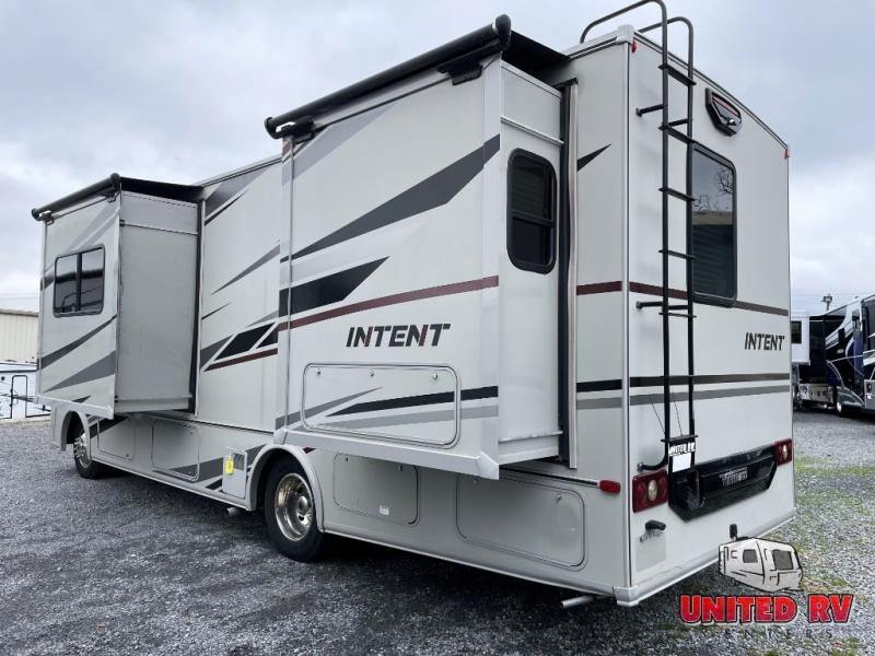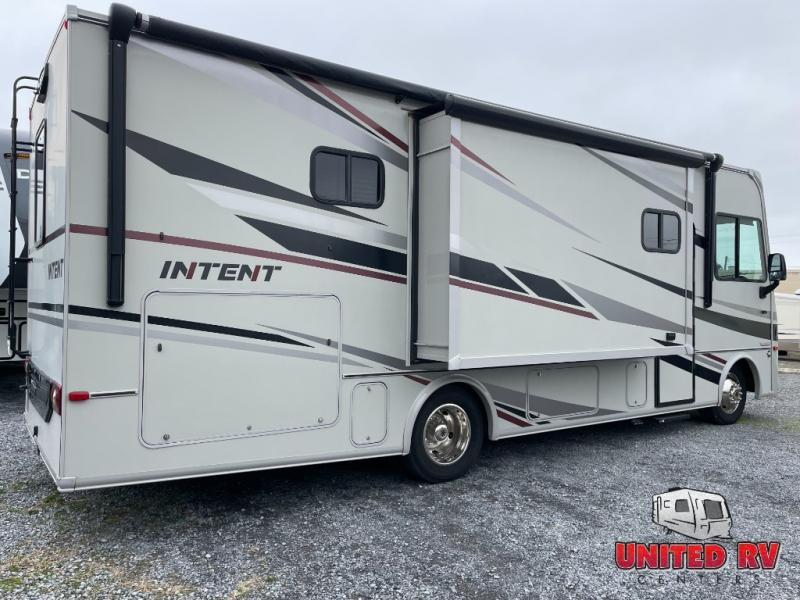 The Winnebago Intent Class A gas motorhome offers sleek in-cab corner pillars and a pivoting radio/rearview monitor system 6.2" WVGA, color touch screen, CD/DVD player, IPod/IPhone compatibility, rear color camera and Bluetooth to increase visibility and safety when traveling. Once at your destination you can easily set up with automatic hydraulic leveling jacks, and the Cummins Onan MicroQuiet gas generator allows you to camp off-grid when you like. Each unit also includes a Wi-Fi prep kit, a solar panel/battery charger prep kit, and is satellite system ready. Inside you will find a StudioLoft bed with ladder, a dinette with Hi-Lo table and storage, plus a shower with a flexible shower head to mention a few highlights. Choose the model that fits your traveling style and functional side today!
