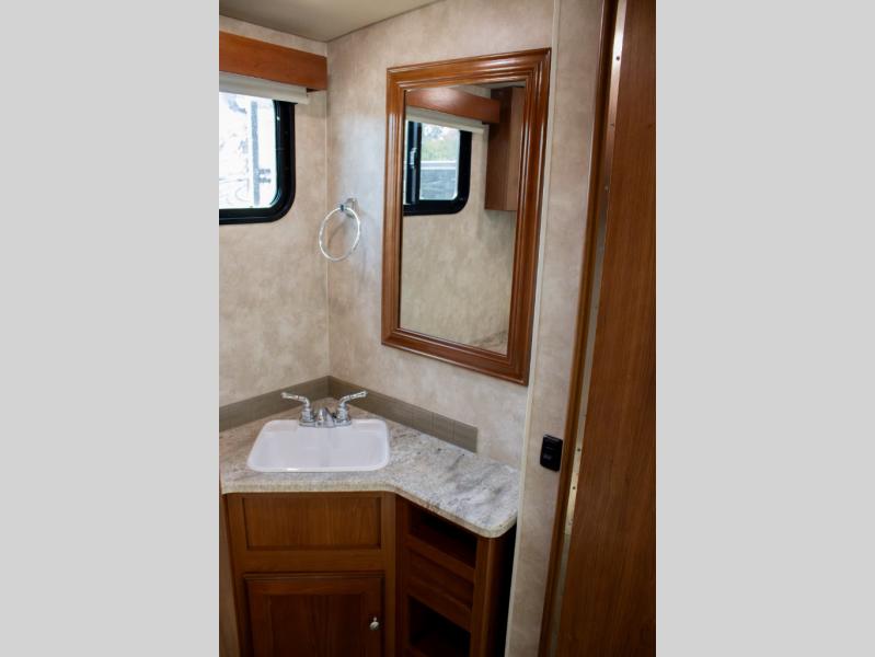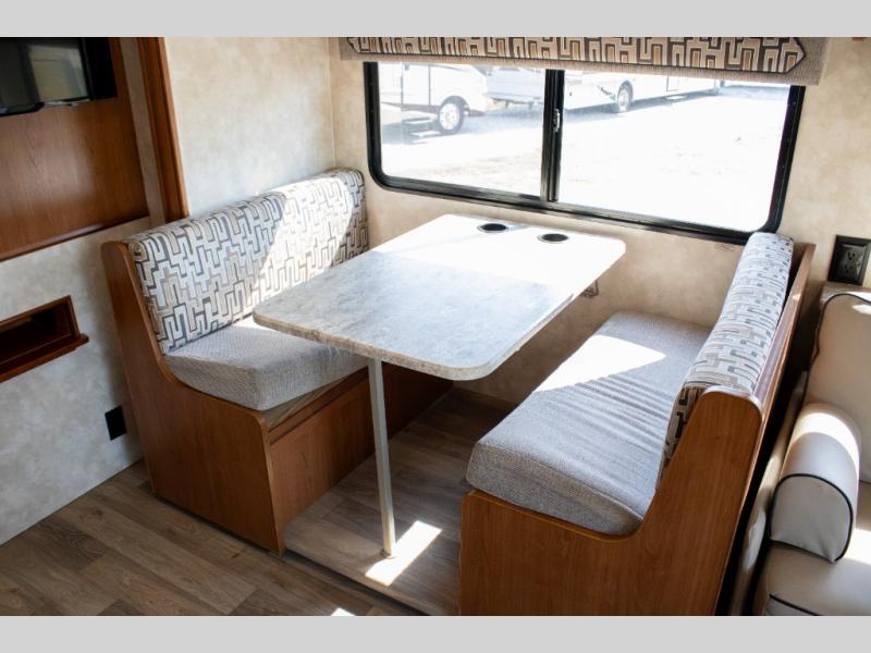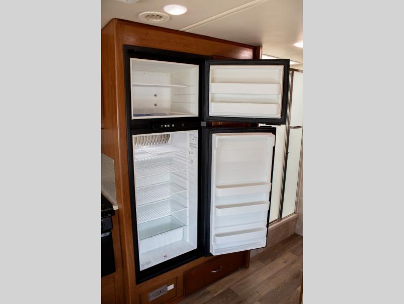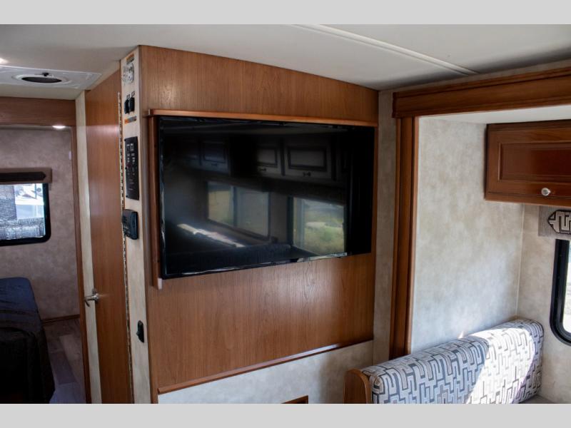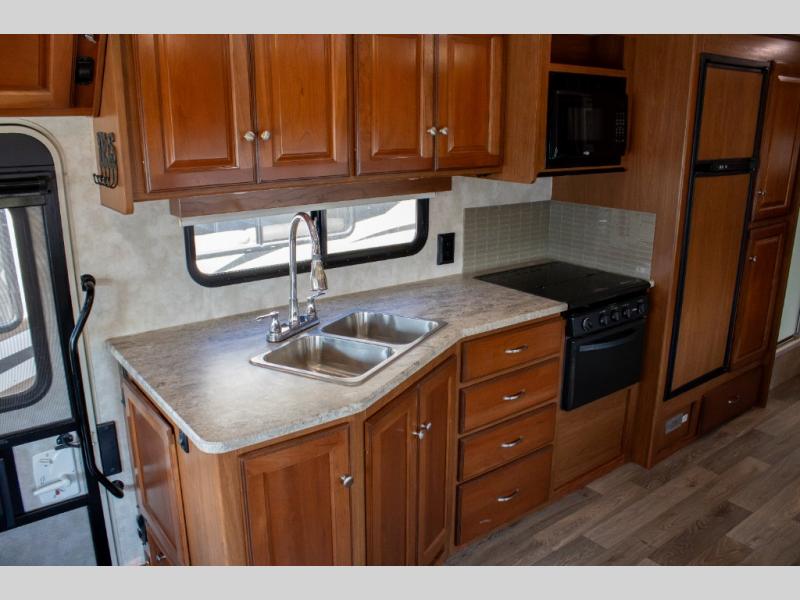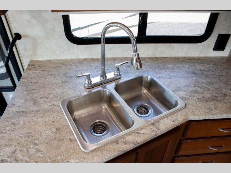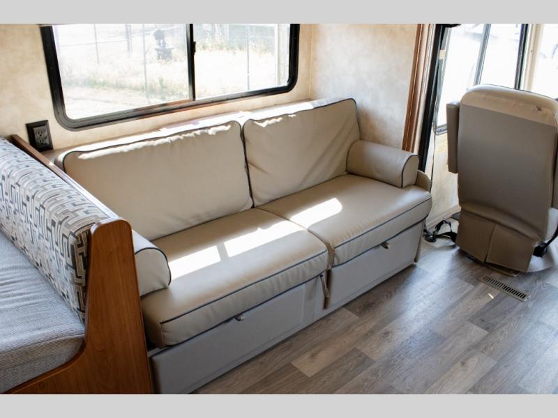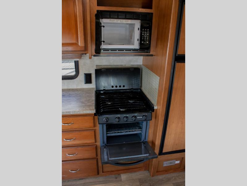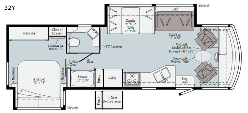 Sleep like a king in your own rear bedroom with a slide out offering more floor space to get to each nightstand, a wardrobe and chest of drawers. You might even add an optional TV to watch before bedtime. You will soon find that the shower is separate from the private toilet and sink room allowing two people to be getting ready at once, and the main living area slide will provide dining, game playing, and sleeping space on the furniture. You might like to add the optional StudioLoft for even more sleeping space. The chef will love having all the appliances at their fingertips to make their homemade chocolate chip cookies. And when you want to enjoy the weather, the power awning offers a great place to relax in your camp chairs.