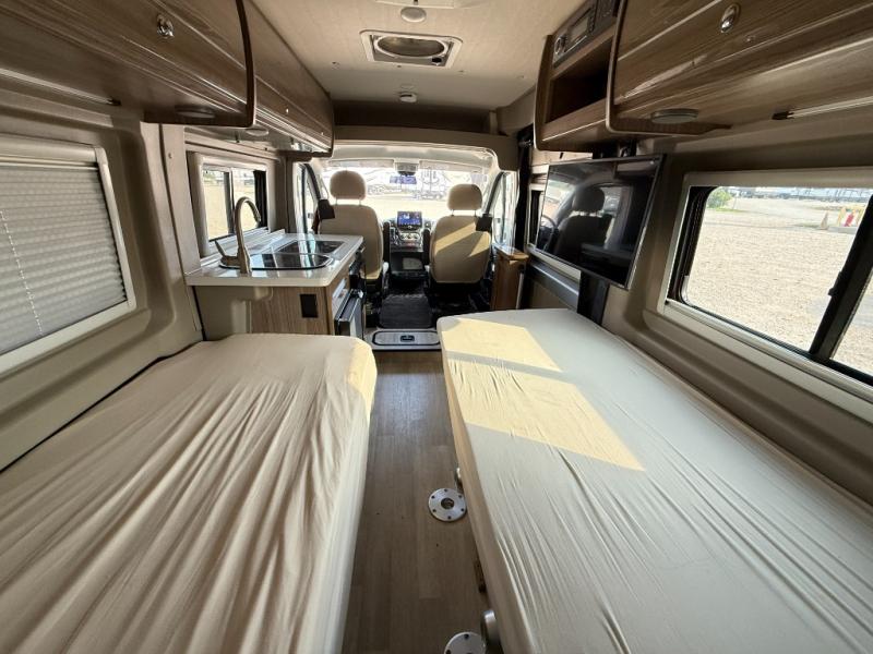 This Travato Class B gas motorhome is ready to hit the road when you are! Once you reach your destination, you will find that both the driver and passenger seats swivel around and offer extra seating inside. In the evening, you can enjoy watching television or a movie on the 24" HDTV before you turn in for the night. Sleeping space can be found on the two twin beds, or you can use the Flex Bed system to join the two twins together to create a larger bed if you wish. You will appreciate the convenience of your own on-board wet bath and kitchen amenities especially with the Pure3 Energy System that allows you to push a button for power! Check out this unit today!