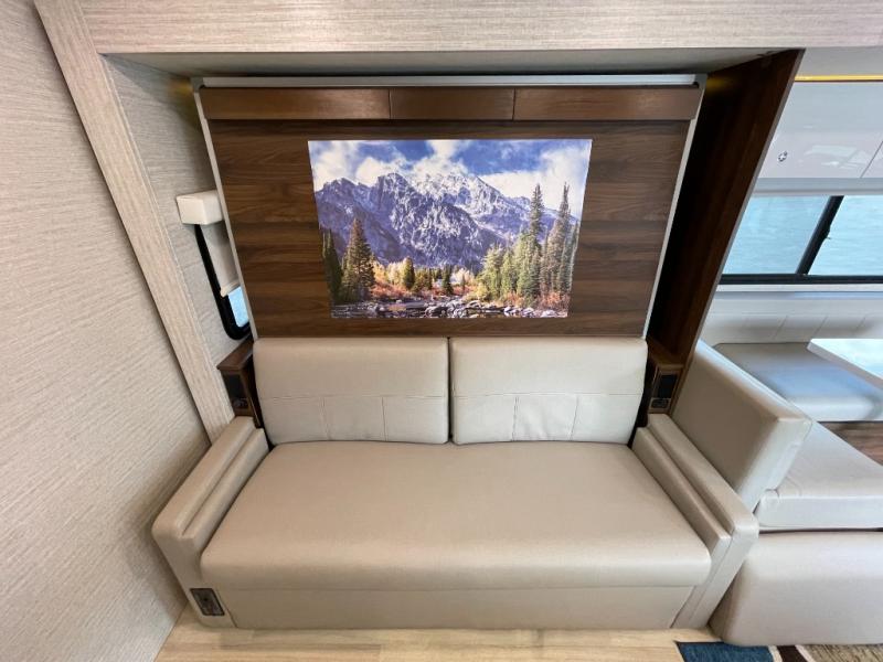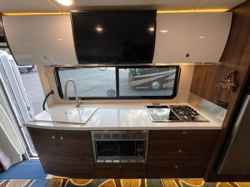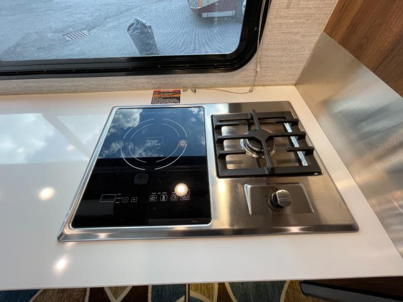 Hit the road knowing that you have all that you need at your fingertips in this View Class C diesel motorhome. Creating meals and snacks will be easy in the kitchen because of the two-burner induction and LP range cooktop and microwave/convection oven, and the double-door refrigerator/freezer will keep all of your perishable items cold and fresh. The pantry will hold all your dry and canned goods, and the overhead cabinets will keep your daily dishes and kitchen items easily accessible. You will thoroughly enjoy the convenience of having a rear bathroom with a space-saving sliding door, and the queen Murphy bed will prove to be a huge asset in providing sleeping space at night while keeping the interior free from clutter during the day when you are relaxing on the sofa with pedestal table.