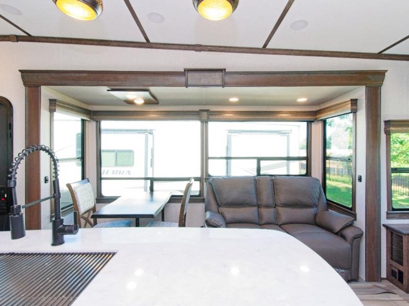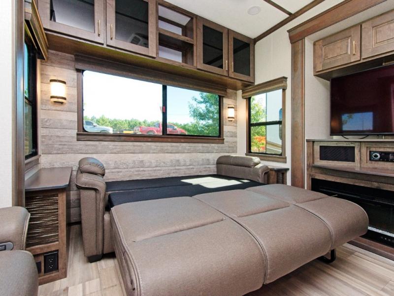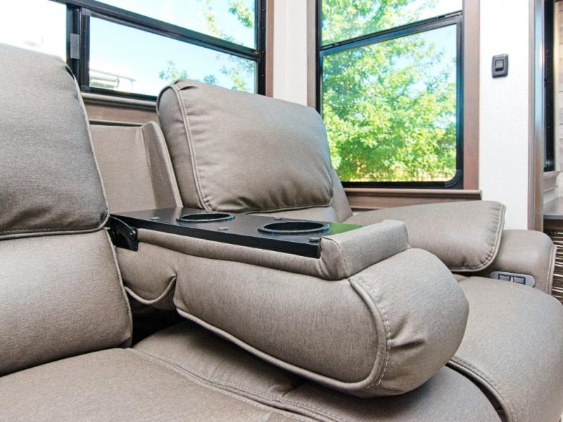Dual opposing slides, theater seating, and a tri-fold sleeper sofa create a cozy space for relaxing or entertaining. -