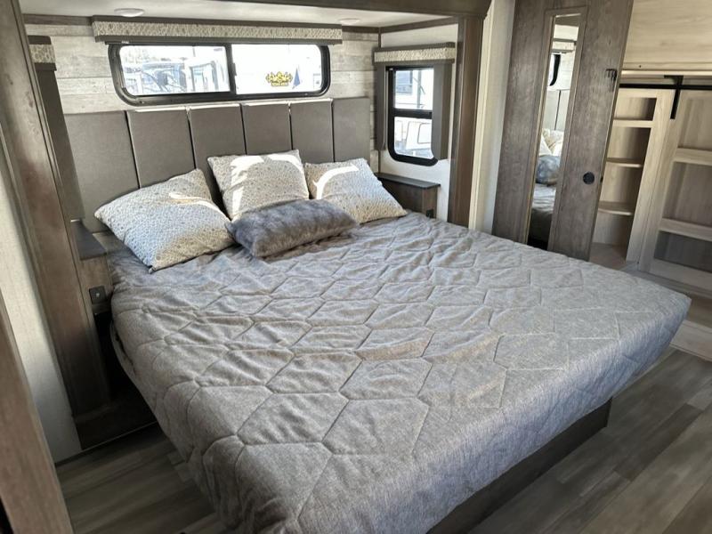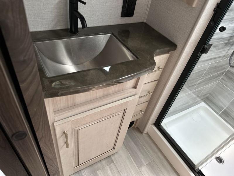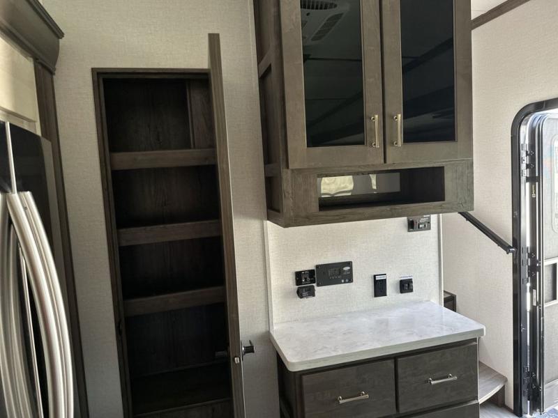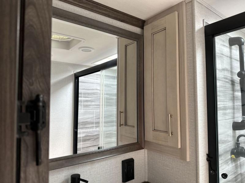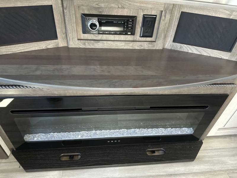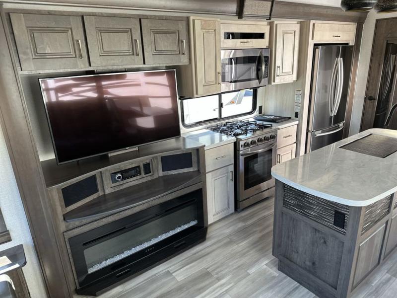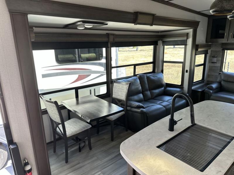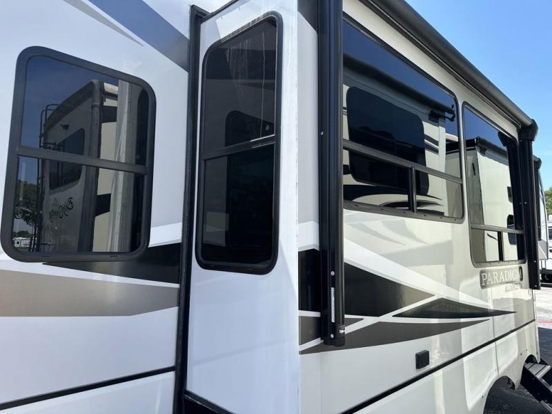 You will be amazed by this Paradigm fifth wheel for all of the amenities that make full-time living such an easy task! The kitchen has been prepped for a dishwasher, and the opposing slides create lots of room for you to work around the island. The sleeper sofa has flip-up end tables on either side, and you will find additional seating on the dual recliner love seat and the floating dinette table with chairs. The master bedroom is phenomenal with its walk-in closet, flip-top dresser, seat with storage, Smart TV, and king bed slide. The dimmable LED lighting is going to let you customize the brightness level all throughout your unit, and the under-step shoe storage is another example of the great storage capabilities.