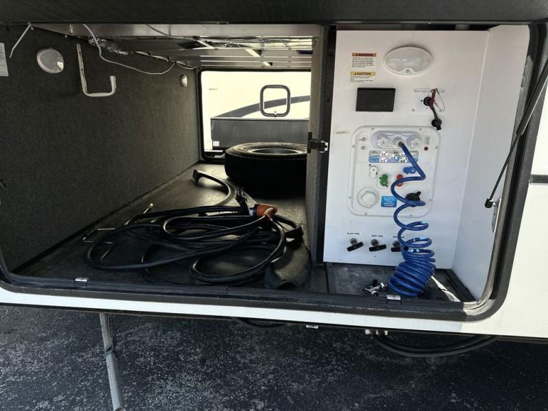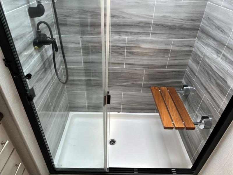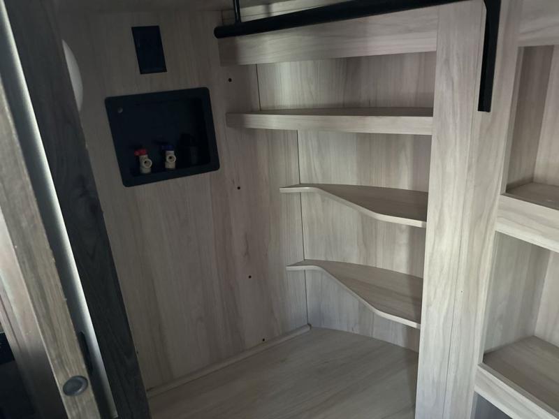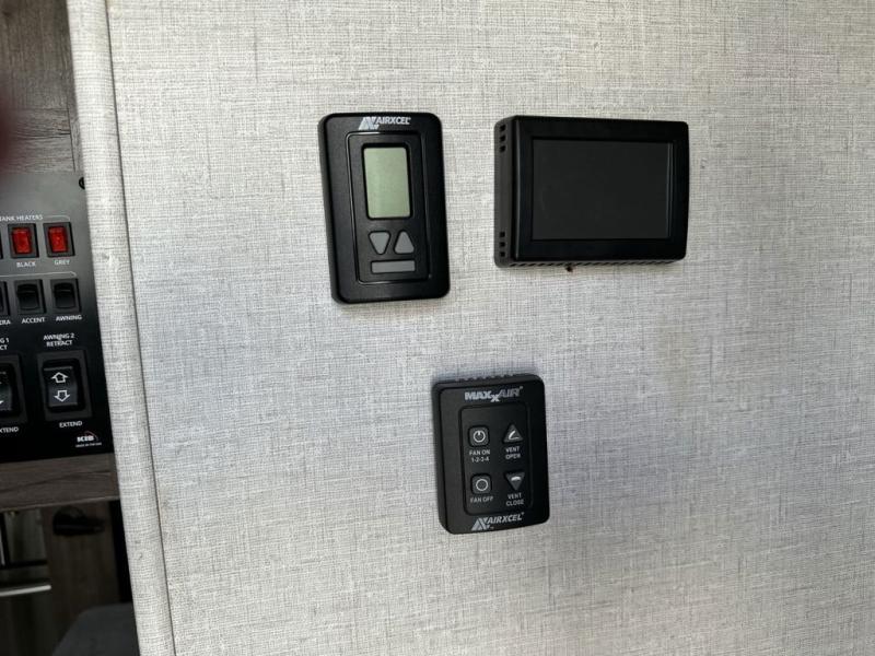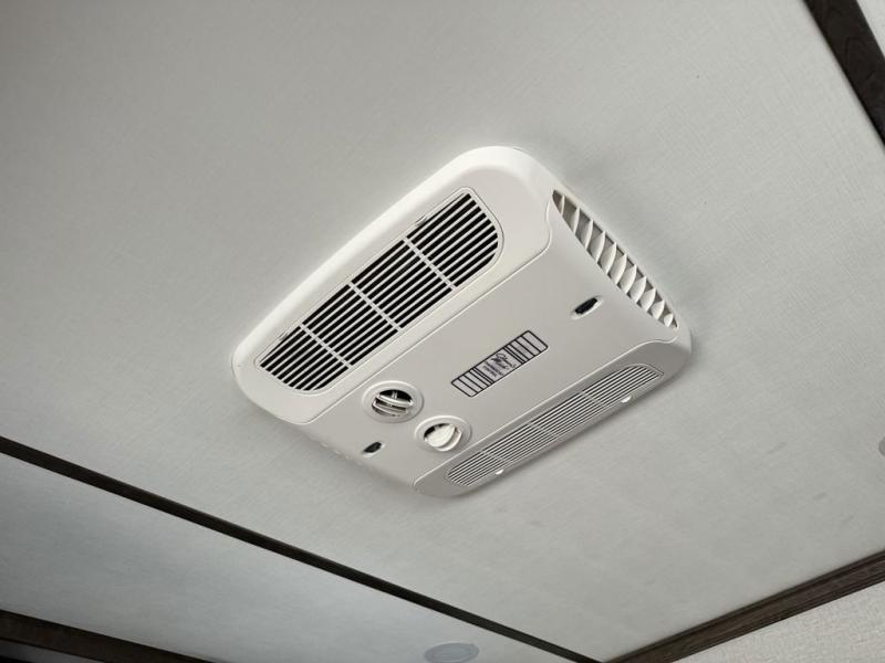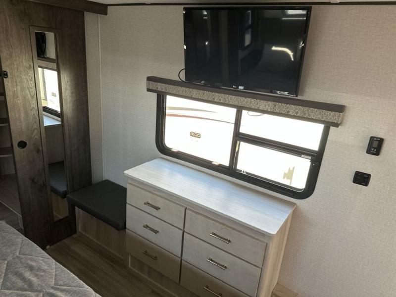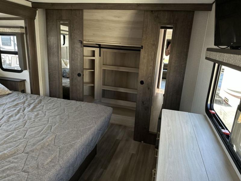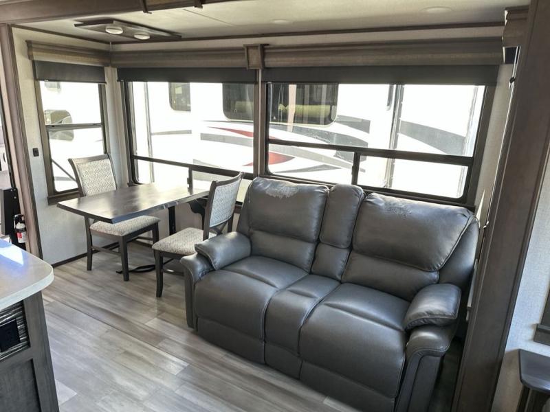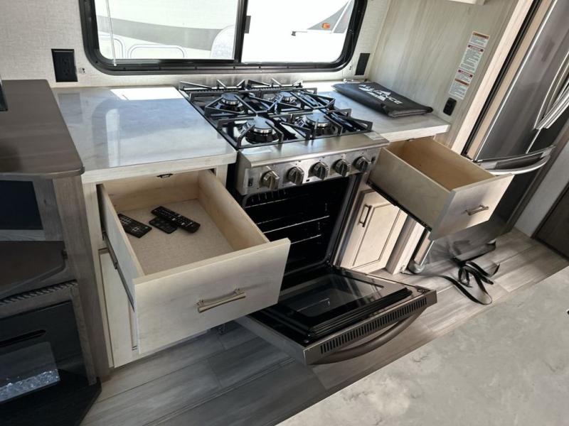 You will be amazed by this Paradigm fifth wheel for all of the amenities that make full-time living such an easy task! The kitchen has been prepped for a dishwasher, and the opposing slides create lots of room for you to work around the island. The sleeper sofa has flip-up end tables on either side, and you will find additional seating on the dual recliner love seat and the floating dinette table with chairs. The master bedroom is phenomenal with its walk-in closet, flip-top dresser, seat with storage, Smart TV, and king bed slide. The dimmable LED lighting is going to let you customize the brightness level all throughout your unit, and the under-step shoe storage is another example of the great storage capabilities.