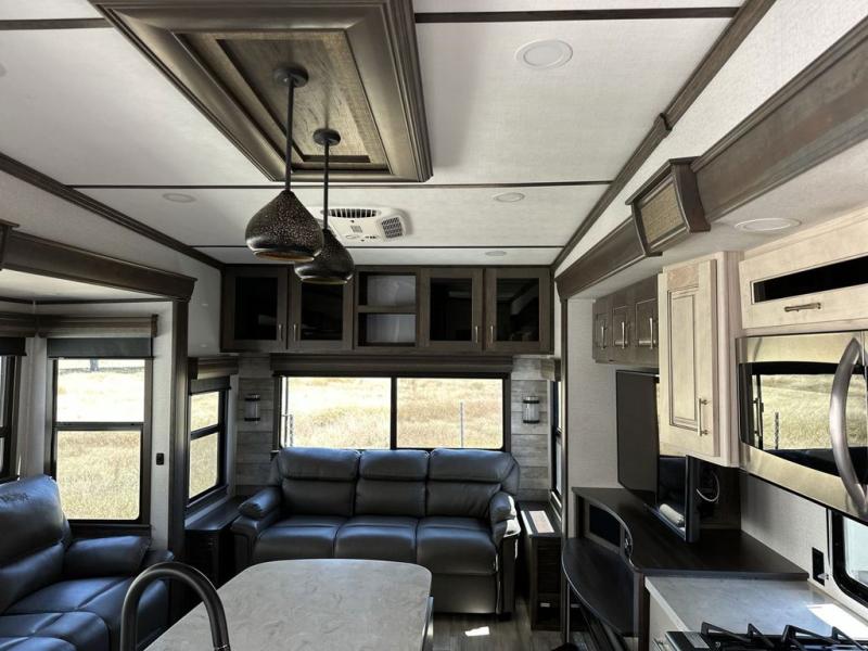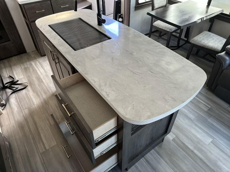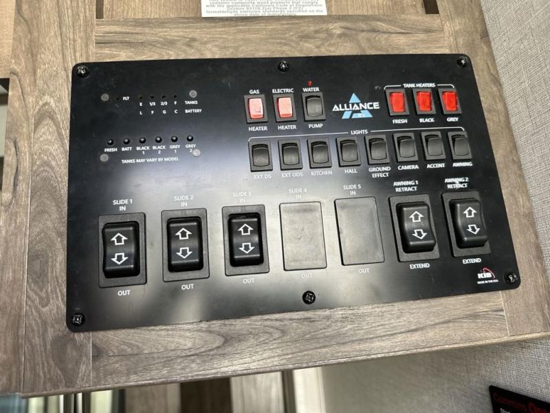 The Paradigm fifth wheel from Alliance RV is absolutely a dream to own because it combines high quality and luxury with features that you have specifically requested over the years! Some of the exterior customer-driven features are the Benchmark chassis, the G-range tires rated at 4,400 pounds, and the MorRyde CRE3000 suspension, and the Paradigm offers some of the industry's largest tank sizes at 98 gallons for fresh water and 106 gallons for gray water. The PVC roof covering will do an excellent job at protecting your RV from water intrusion, and it has increased solar reflectivity. You won't find any carpet in the Paradigm, and another great feature that has been reconstructed to meet the customer's needs is the flush-floor slide. The soft-close doors and drawers with magnetic catch are a high-end residential feature that isn't typically found on other RVs, and the excellent hidden storage capabilities of the Paradigm will surprise you when you find them.