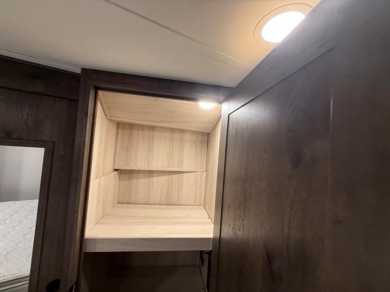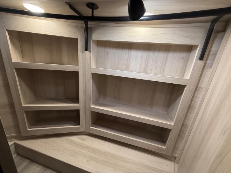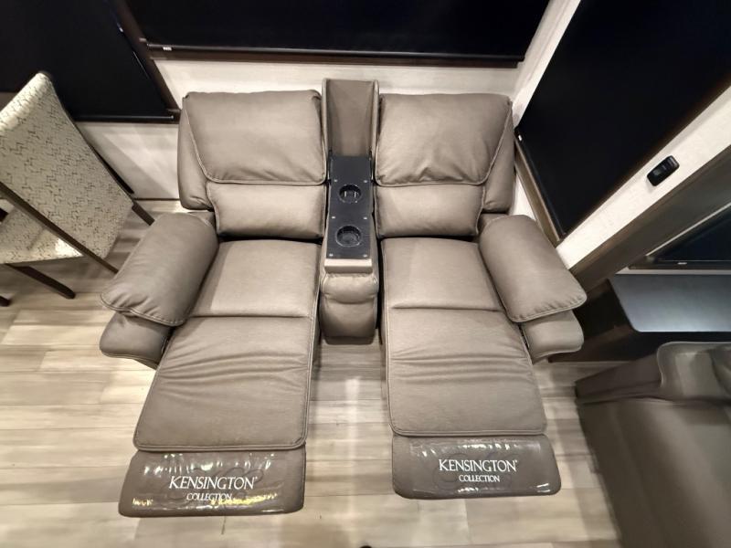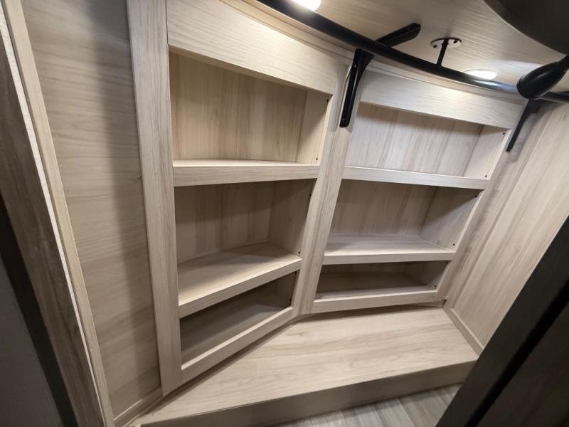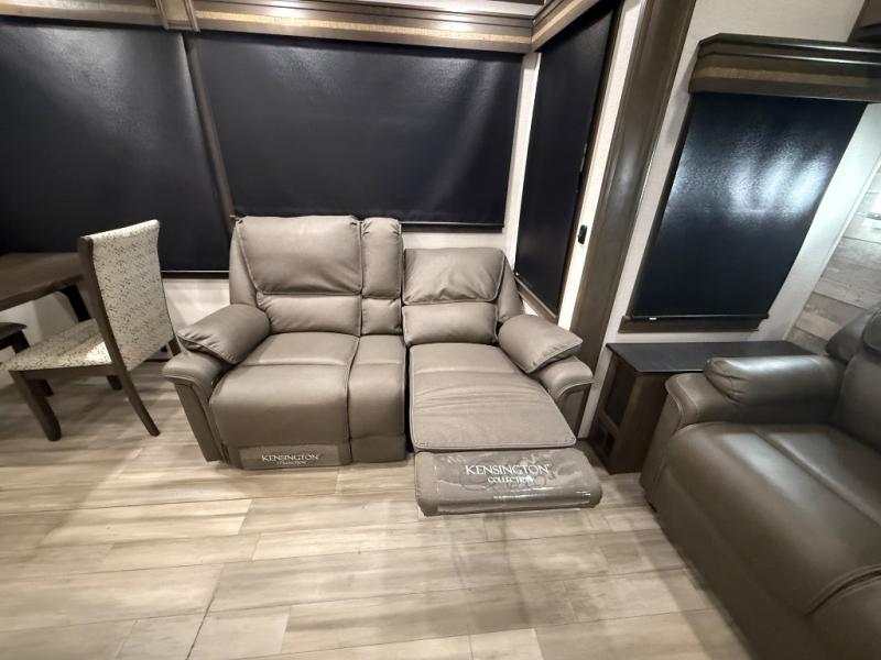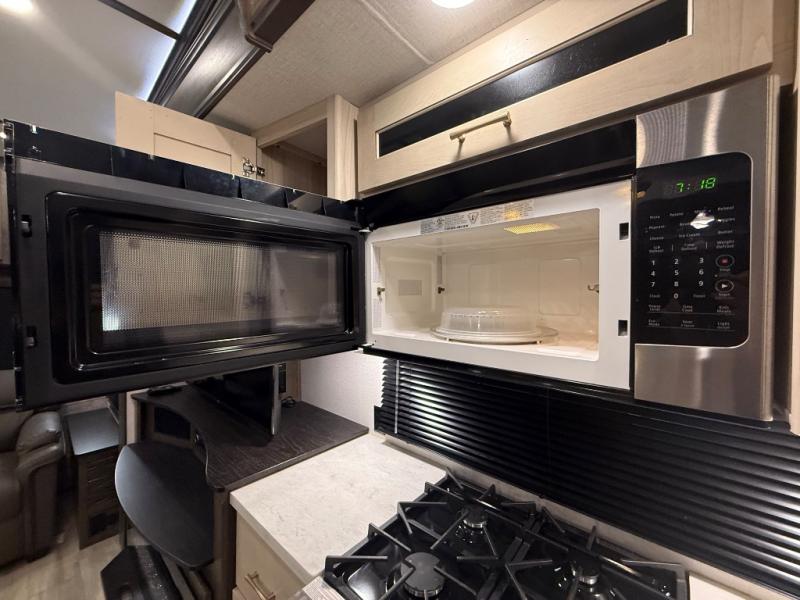 You will be amazed by this Paradigm fifth wheel for all of the amenities that make full-time living such an easy task! The kitchen has been prepped for a dishwasher, and the opposing slides create lots of room for you to work around the island. The sleeper sofa has flip-up end tables on either side, and you will find additional seating on the dual recliner love seat and the floating dinette table with chairs. The master bedroom is phenomenal with its walk-in closet, flip-top dresser, seat with storage, Smart TV, and king bed slide. The dimmable LED lighting is going to let you customize the brightness level all throughout your unit, and the under-step shoe storage is another example of the great storage capabilities.