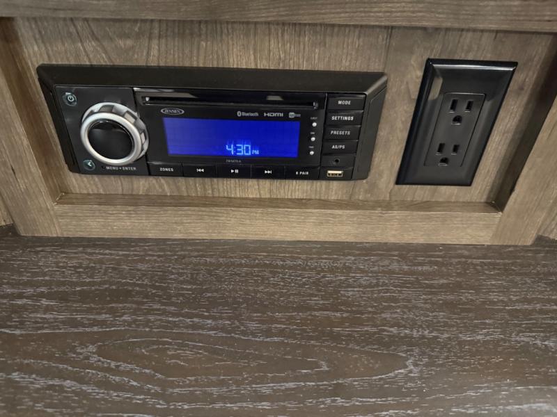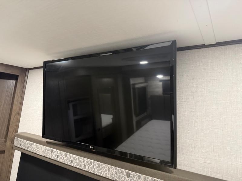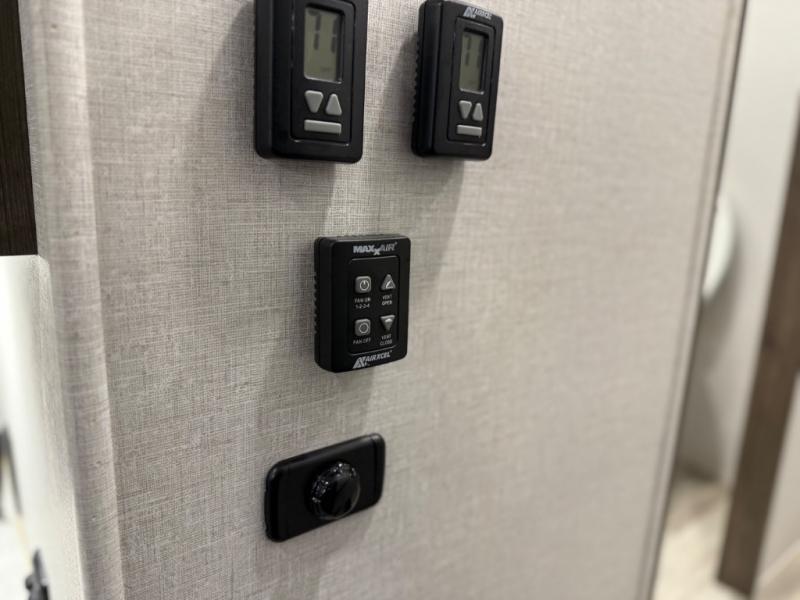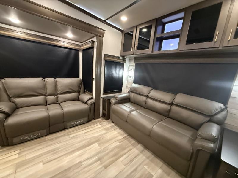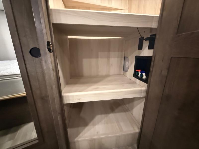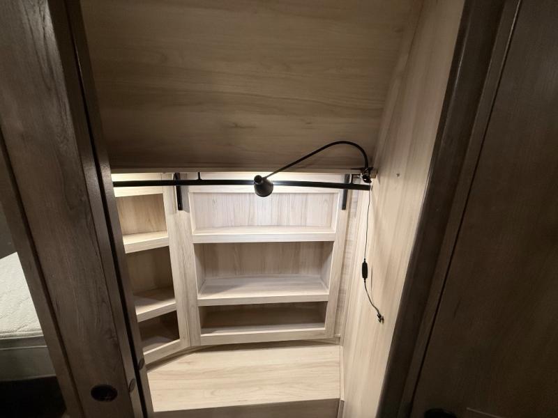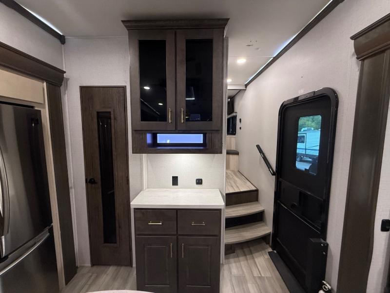 You will be amazed by this Paradigm fifth wheel for all of the amenities that make full-time living such an easy task! The kitchen has been prepped for a dishwasher, and the opposing slides create lots of room for you to work around the island. The sleeper sofa has flip-up end tables on either side, and you will find additional seating on the dual recliner love seat and the floating dinette table with chairs. The master bedroom is phenomenal with its walk-in closet, flip-top dresser, seat with storage, Smart TV, and king bed slide. The dimmable LED lighting is going to let you customize the brightness level all throughout your unit, and the under-step shoe storage is another example of the great storage capabilities.