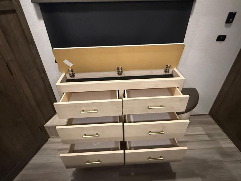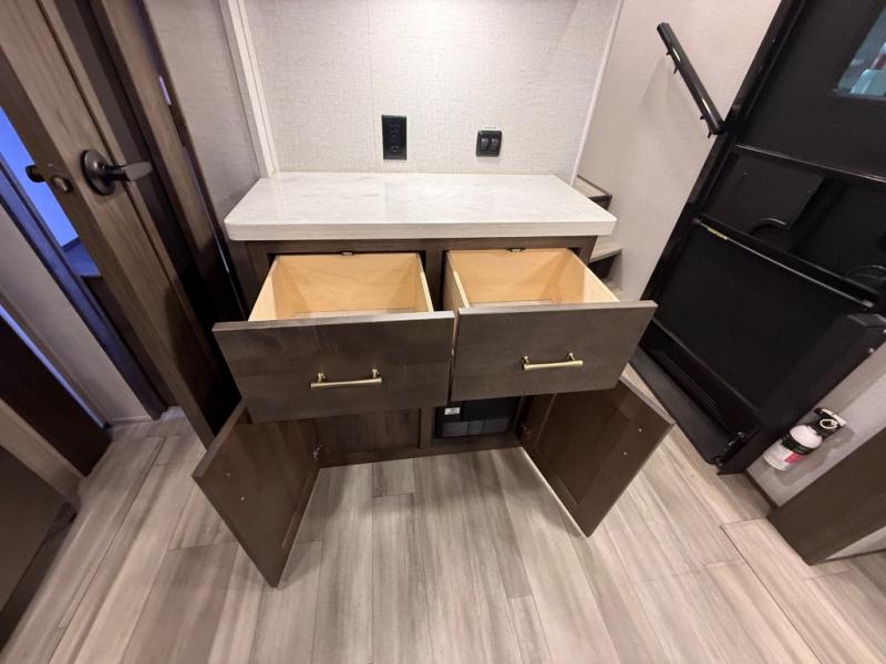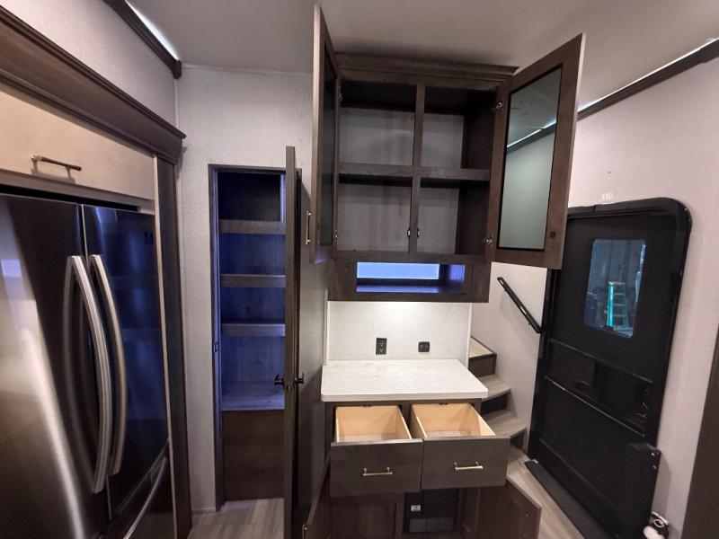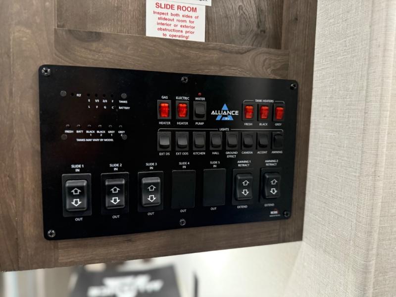 The Paradigm fifth wheel from Alliance RV is absolutely a dream to own because it combines high quality and luxury with features that you have specifically requested over the years! Some of the exterior customer-driven features are the Benchmark chassis, the G-range tires rated at 4,400 pounds, and the MorRyde CRE3000 suspension, and the Paradigm offers some of the industry's largest tank sizes at 98 gallons for fresh water and 106 gallons for gray water. The PVC roof covering will do an excellent job at protecting your RV from water intrusion, and it has increased solar reflectivity. You won't find any carpet in the Paradigm, and another great feature that has been reconstructed to meet the customer's needs is the flush-floor slide. The soft-close doors and drawers with magnetic catch are a high-end residential feature that isn't typically found on other RVs, and the excellent hidden storage capabilities of the Paradigm will surprise you when you find them.