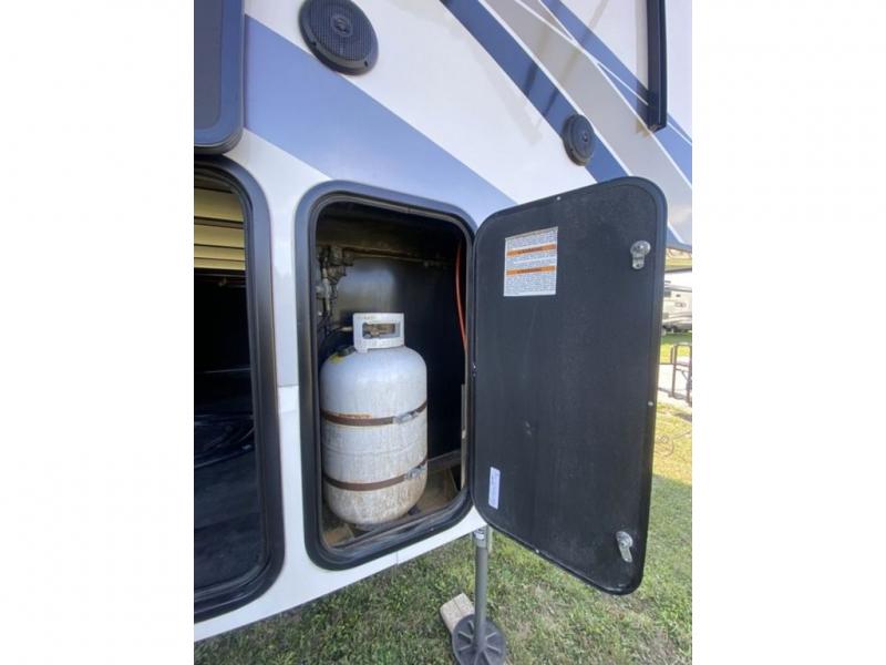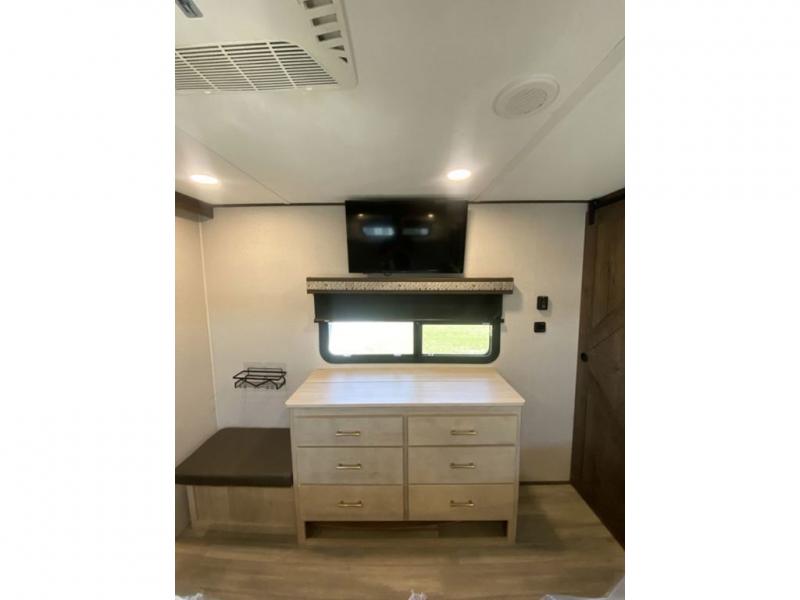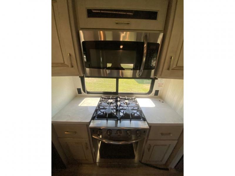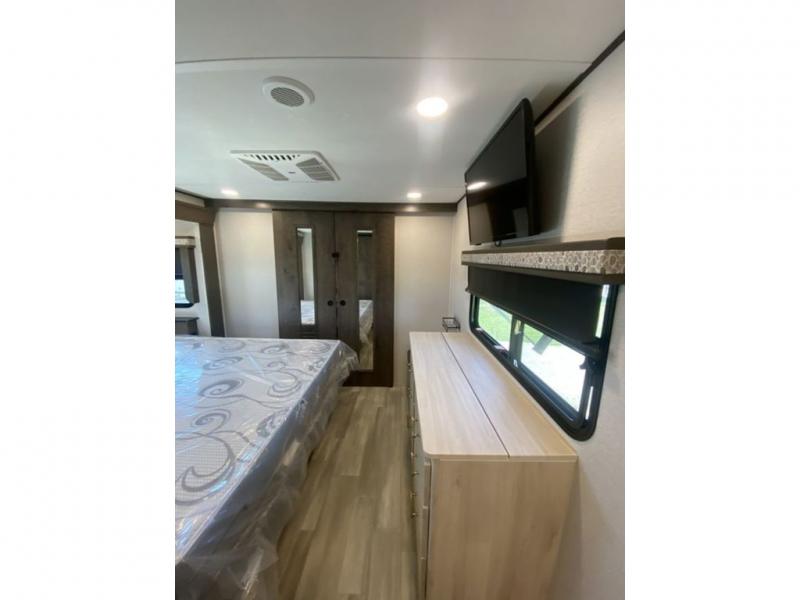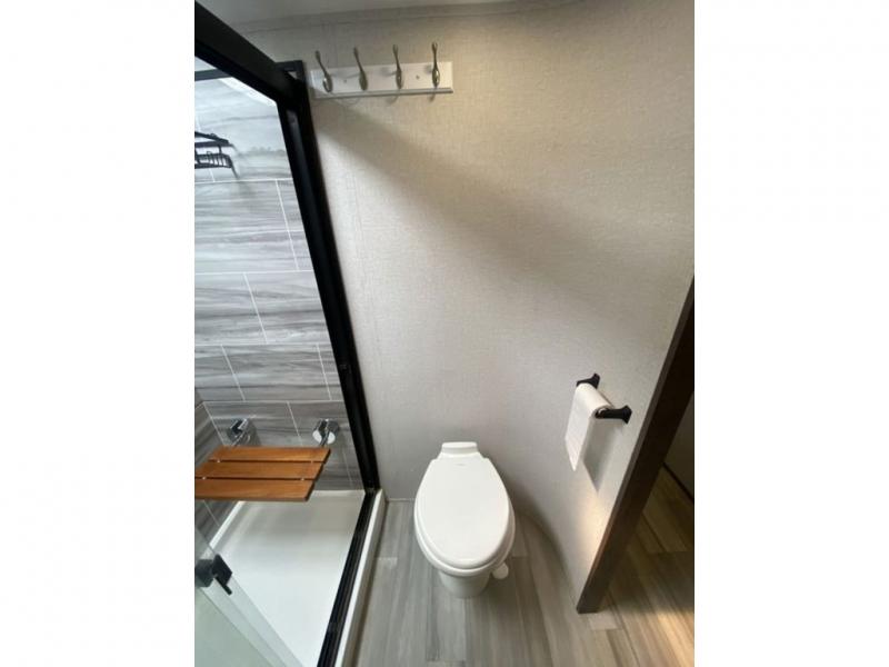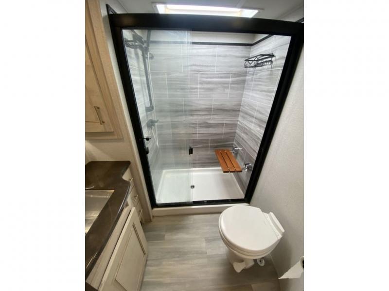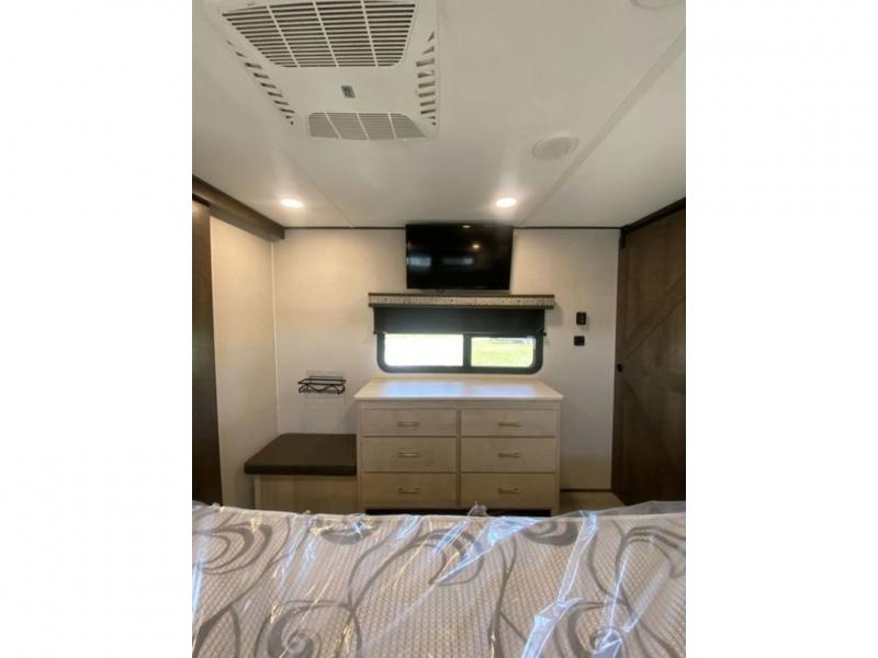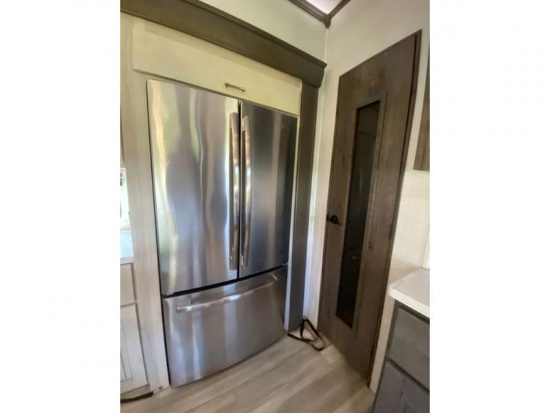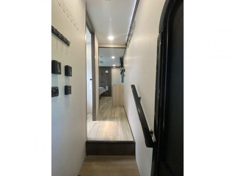 Throughout this entire Paradigm fifth wheel, you will be stunned by the residential, high-quality features! The kitchen is exceptional with its Insignia microwave, Insignia four-burner range, industry's largest oven, prep for a dishwasher, and peninsula countertop. The flush-floor kitchen slide also ensures that you won't stub your toes while you're preparing dinner, and the 18 cubic foot refrigerator will hold so much food! The technological features found on this unit are top notch, like the two Smart TVs, the USB charging ports, the dimmable LED lighting, and the marine-grade exterior speakers. Bring all of your favorite sweaters and sneakers in the walk-in closet located in the front private bedroom, and spend some time getting clean each morning in the large residential shower.