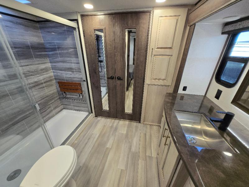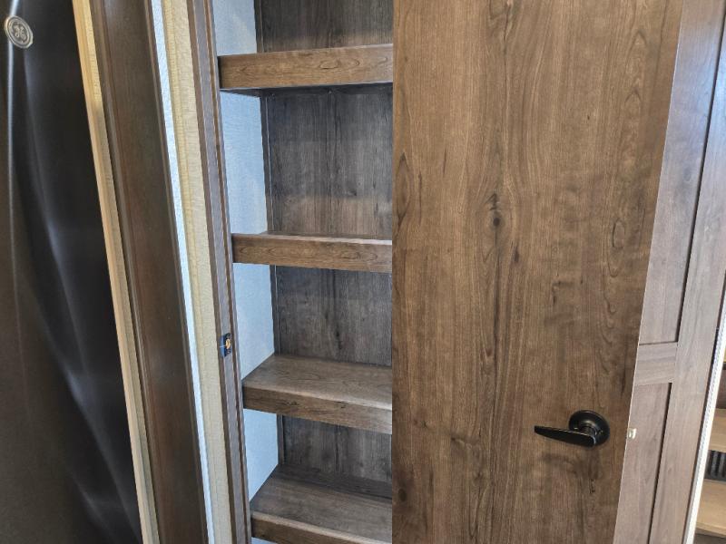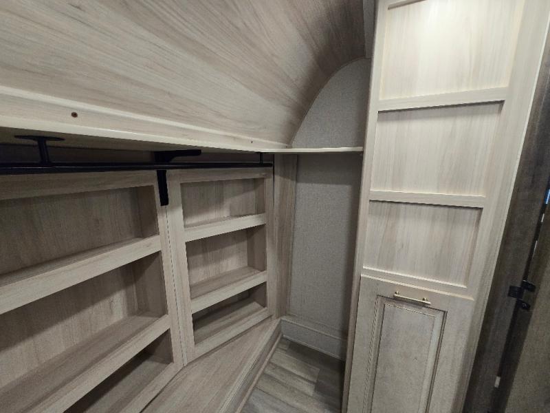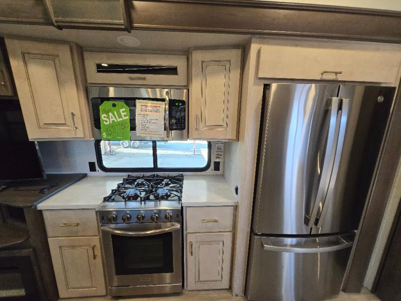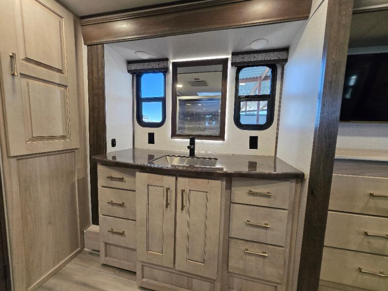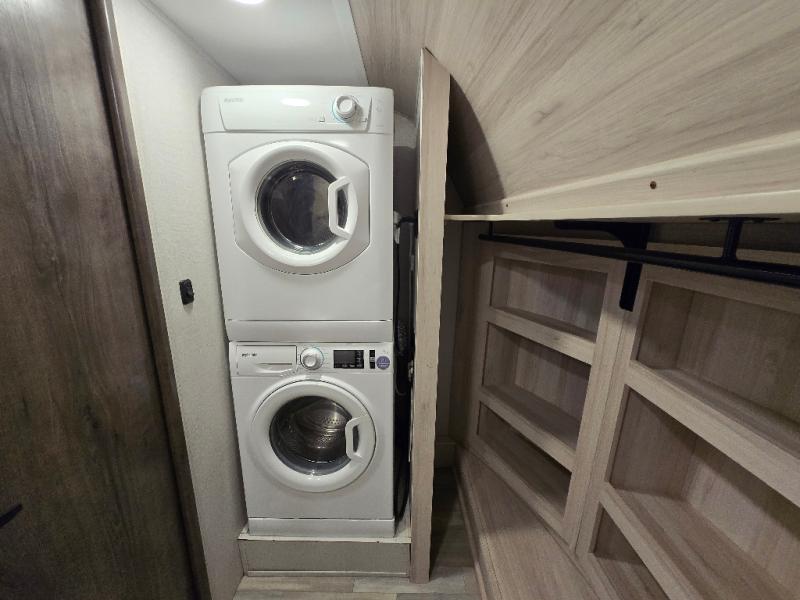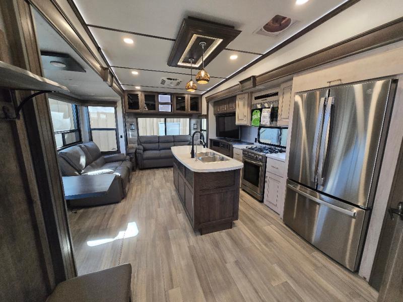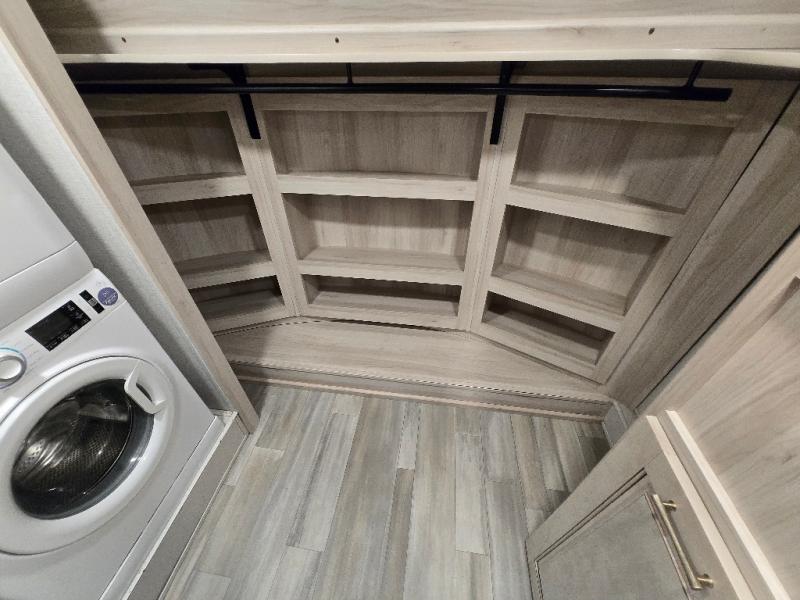 This Paradigm fifth wheel is an absolute dream! Whether it's the sunlight streaming in through the Atrium windows, or it's the bright LED dimmable lighting on the interior, you will find illumination all throughout this unit. The backlit crown molding in the living area provides an elegant feel to this already stylish fifth wheel, and modern technology is abundant with the two Smart TVs, USB charging ports, and LED motion lights in the pantry. You will be completely set for full-time living with the preparations for a dishwasher and the preparations for a washer/dryer, and the hamper in the walk-in closet will make it easy to keep your dirty clothes out of sight.