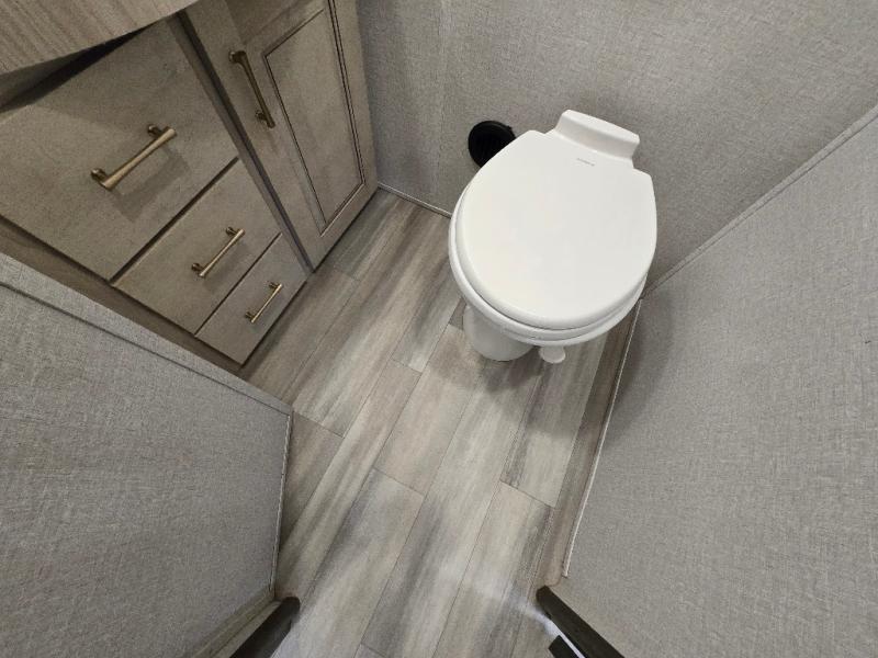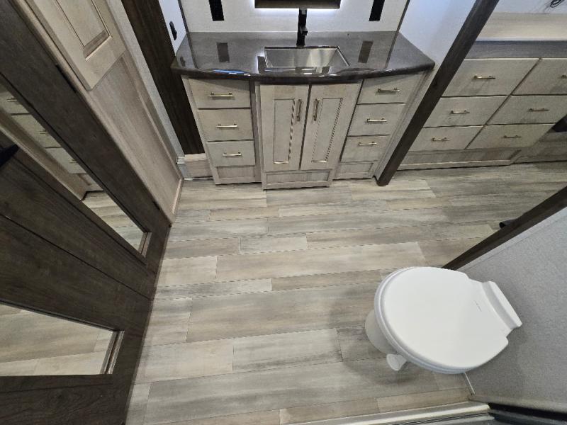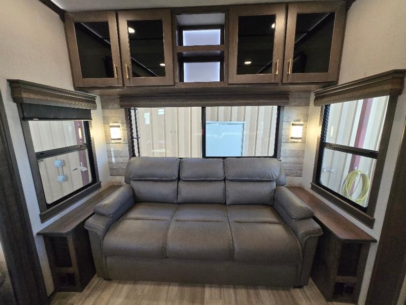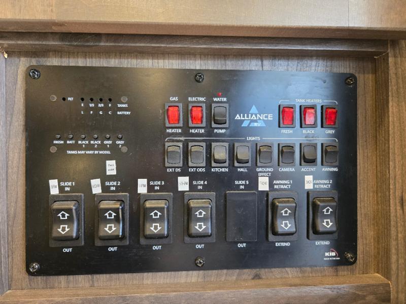The Paradigm fifth wheel from Alliance RV is absolutely a dream to own because it combines high quality and luxury with features that you have specifically requested over the years! Some of the exterior customer-driven features are the Benchmark chassis, the G-range tires rated at 4,400 pounds, and the MorRyde CRE3000 suspension, and the Paradigm offers some of the industry's largest tank sizes at 98 gallons for fresh water and 106 gallons for gray water. The PVC roof covering will do an excellent job at protecting your RV from water intrusion, and it has increased solar reflectivity. You won't find any carpet in the Paradigm, and another great feature that has been reconstructed to meet the customer's needs is the flush-floor slide. The soft-close doors and drawers with magnetic catch are a high-end residential feature that isn't typically found on other RVs, and the excellent hidden storage capabilities of the Paradigm will surprise you when you find them.