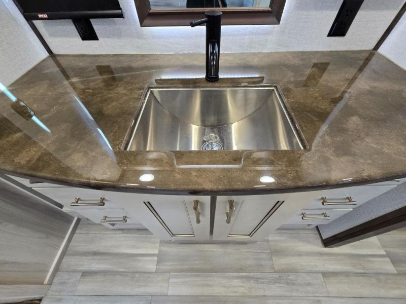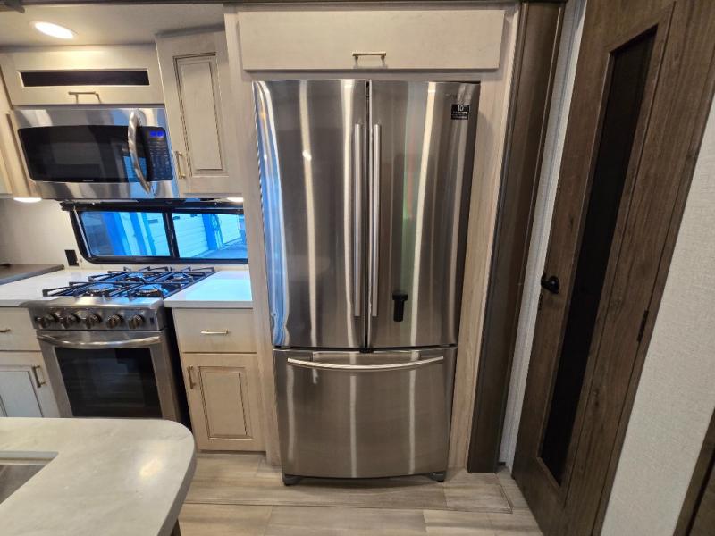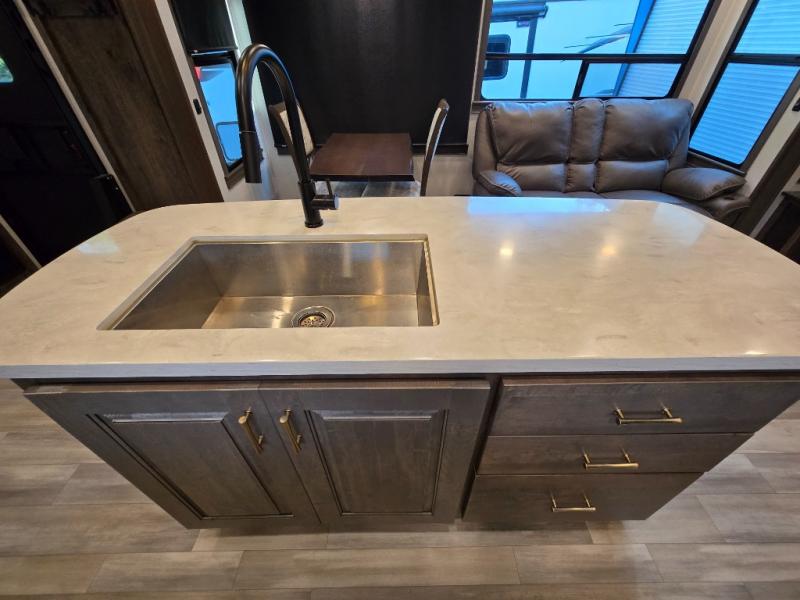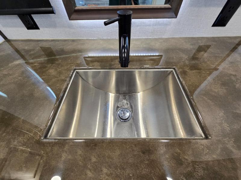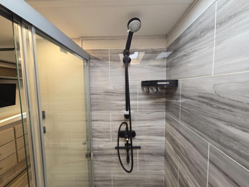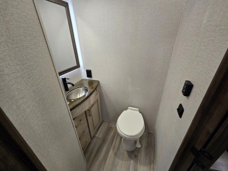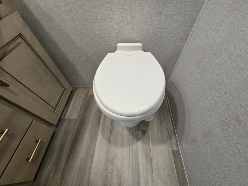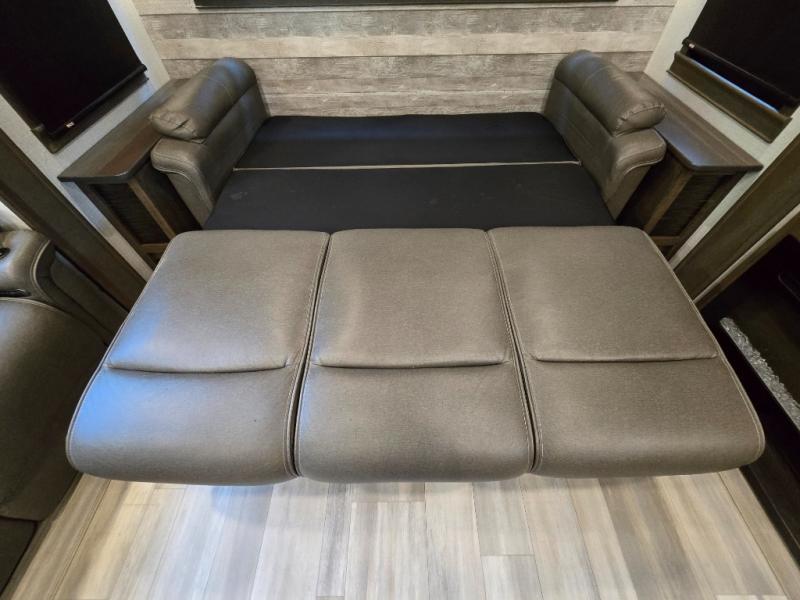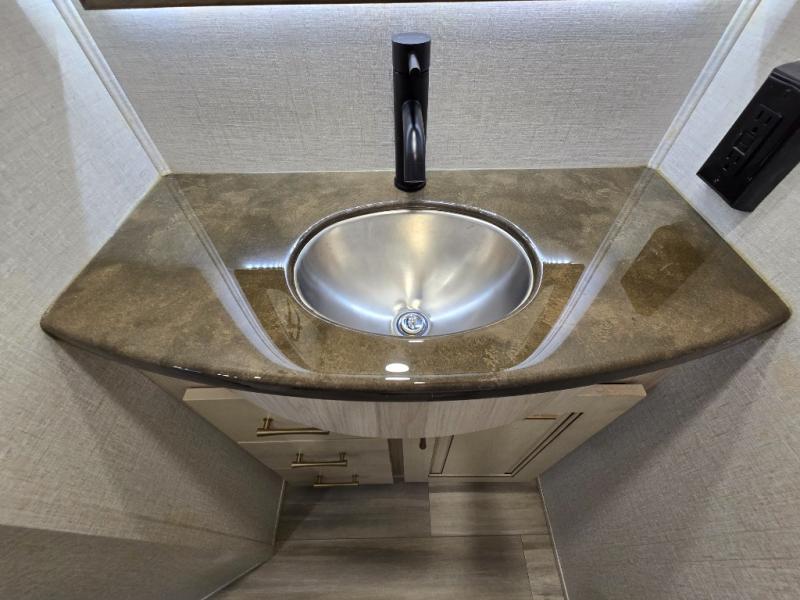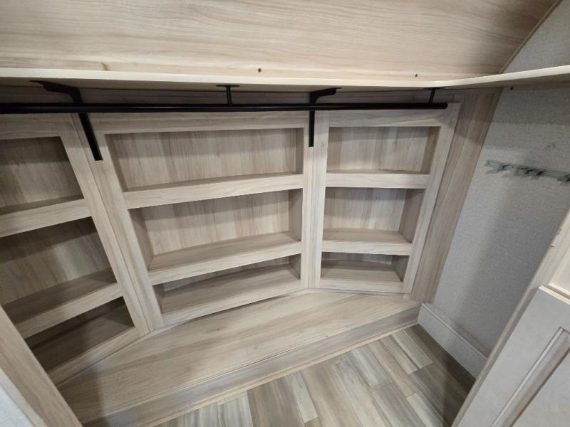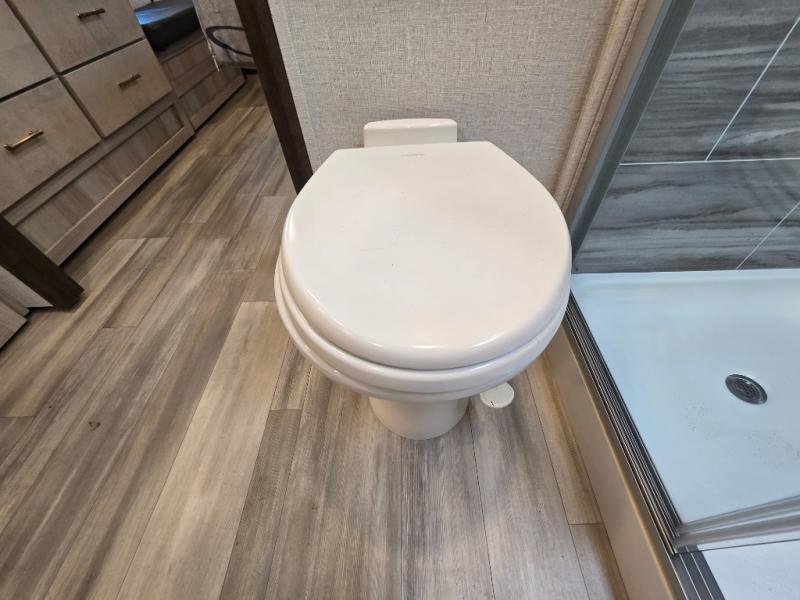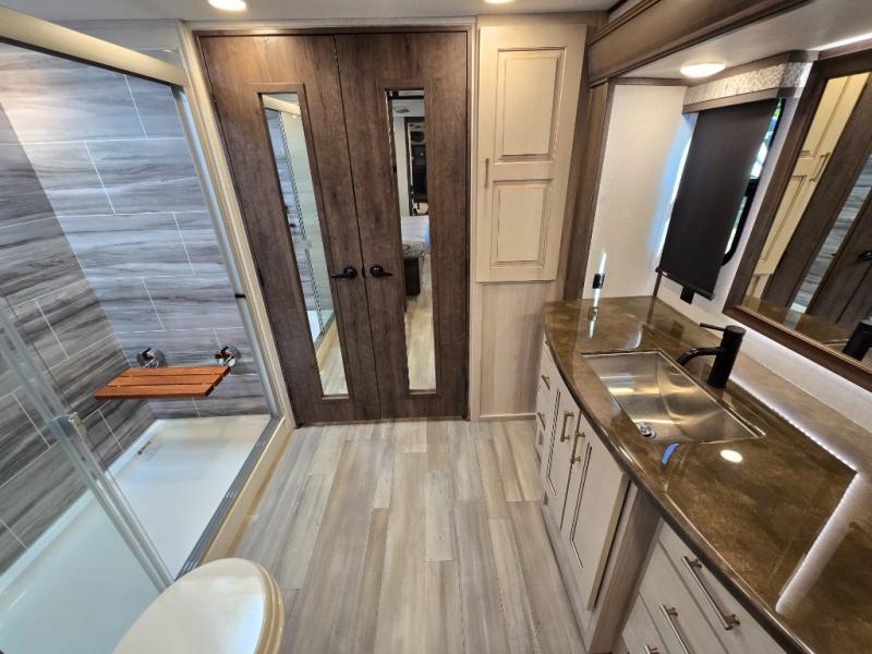 The 370FB stands out because it offers a true residential front bathroom with walk-in closet, a half bath for guests, and upscale residential design details that make it especially attractive for full-timers.