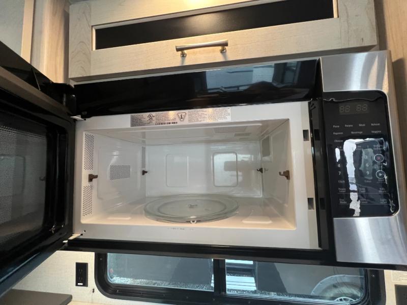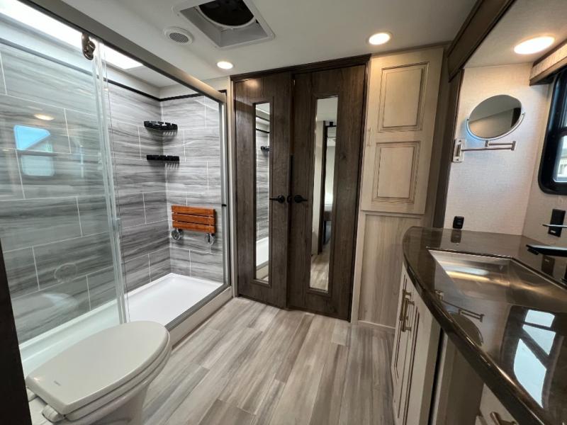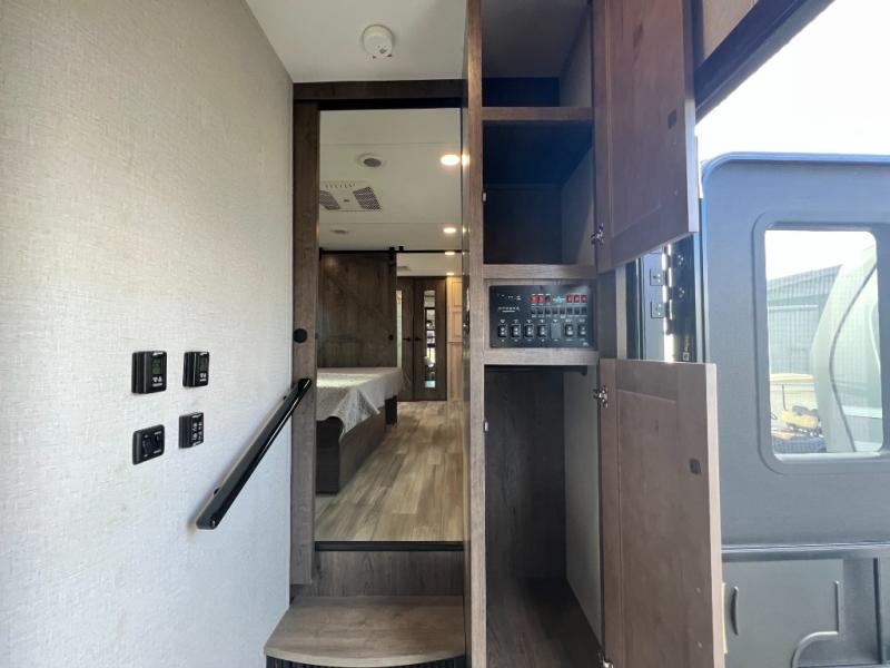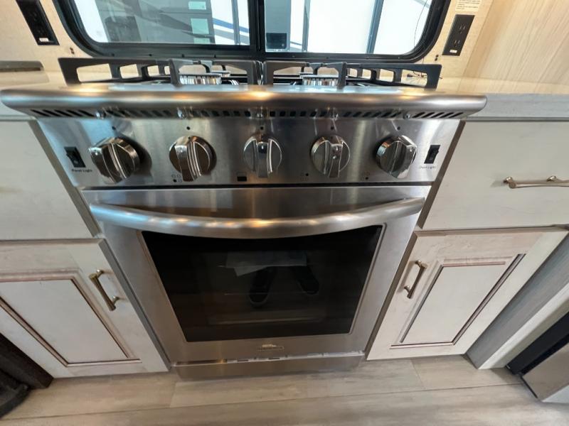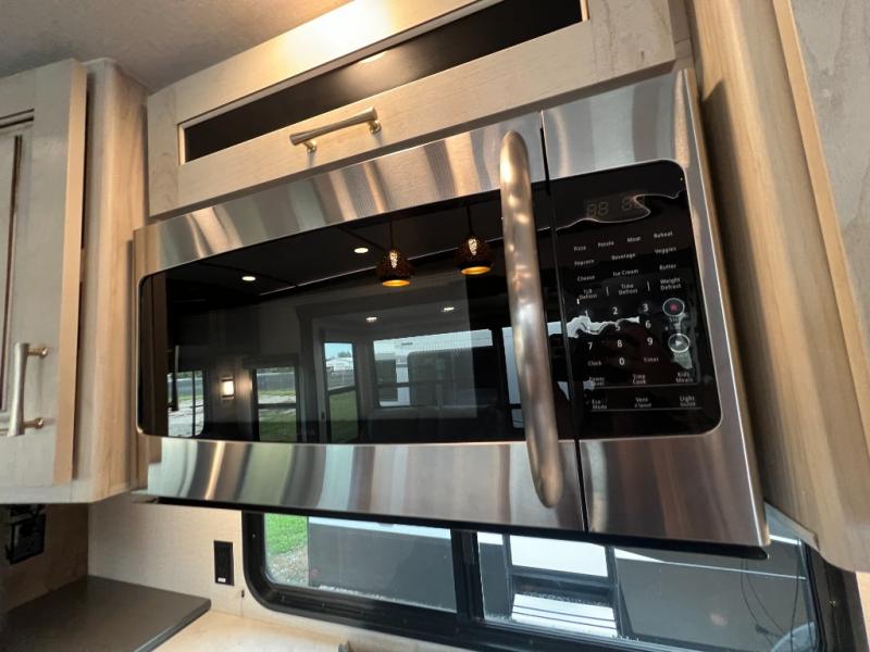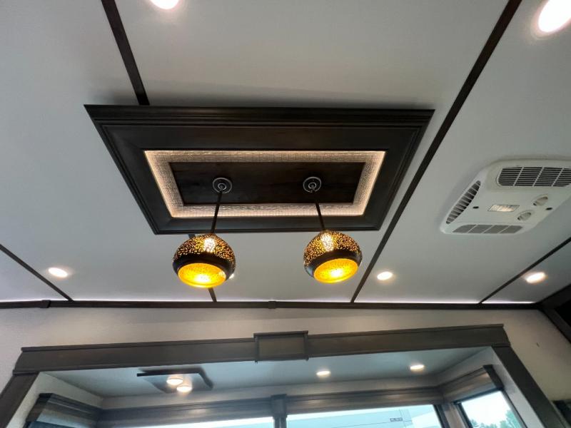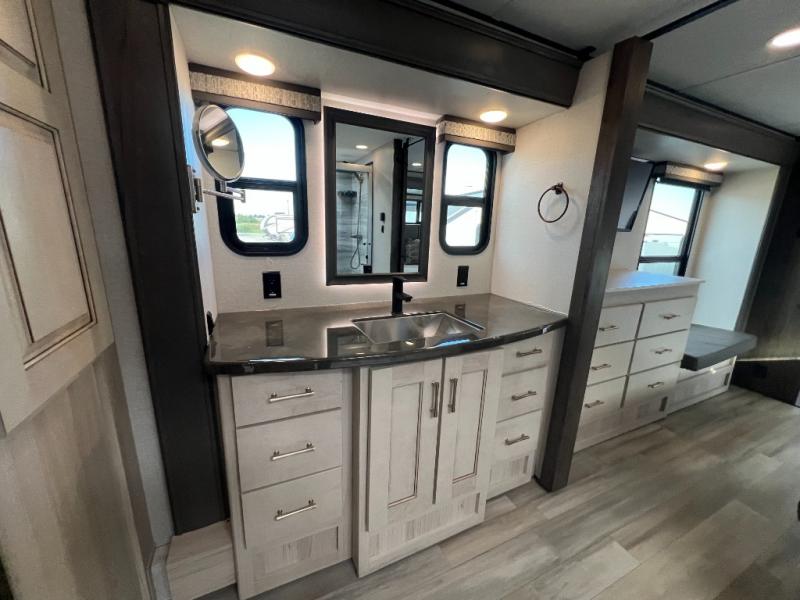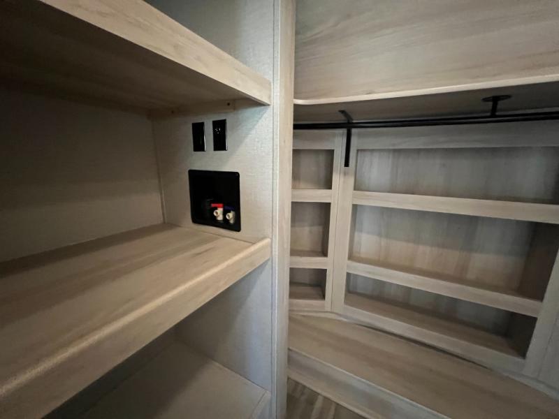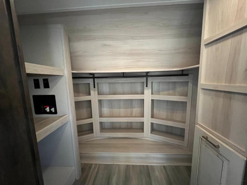This Paradigm fifth wheel is an absolute dream! Whether it's the sunlight streaming in through the Atrium windows, or it's the bright LED dimmable lighting on the interior, you will find illumination all throughout this unit. The backlit crown molding in the living area provides an elegant feel to this already stylish fifth wheel, and modern technology is abundant with the two Smart TVs, USB charging ports, and LED motion lights in the pantry. You will be completely set for full-time living with the preparations for a dishwasher and the preparations for a washer/dryer, and the hamper in the walk-in closet will make it easy to keep your dirty clothes out of sight.
