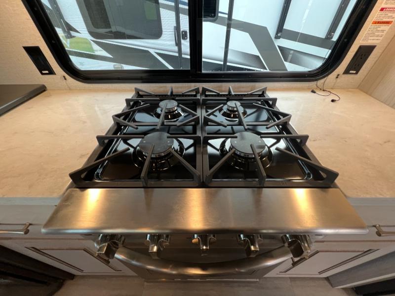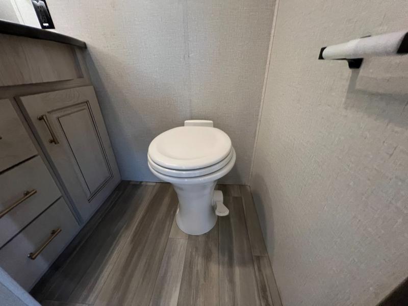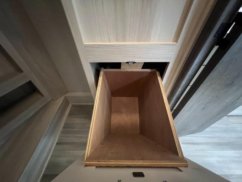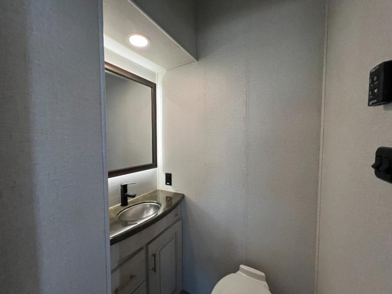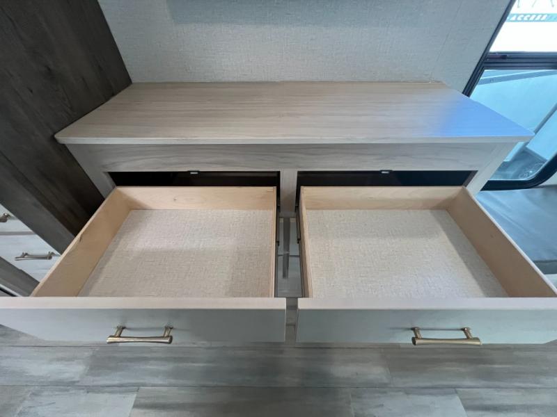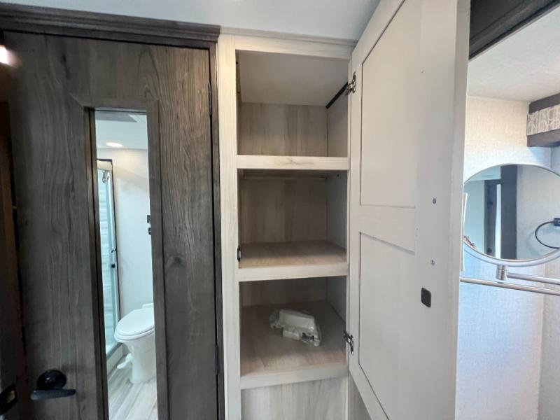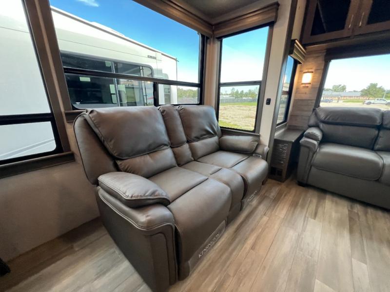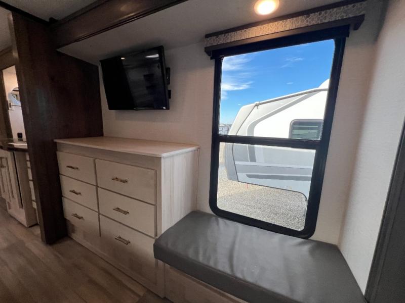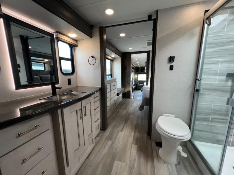 This Paradigm fifth wheel is an absolute dream! Whether it's the sunlight streaming in through the Atrium windows, or it's the bright LED dimmable lighting on the interior, you will find illumination all throughout this unit. The backlit crown molding in the living area provides an elegant feel to this already stylish fifth wheel, and modern technology is abundant with the two Smart TVs, USB charging ports, and LED motion lights in the pantry. You will be completely set for full-time living with the preparations for a dishwasher and the preparations for a washer/dryer, and the hamper in the walk-in closet will make it easy to keep your dirty clothes out of sight.